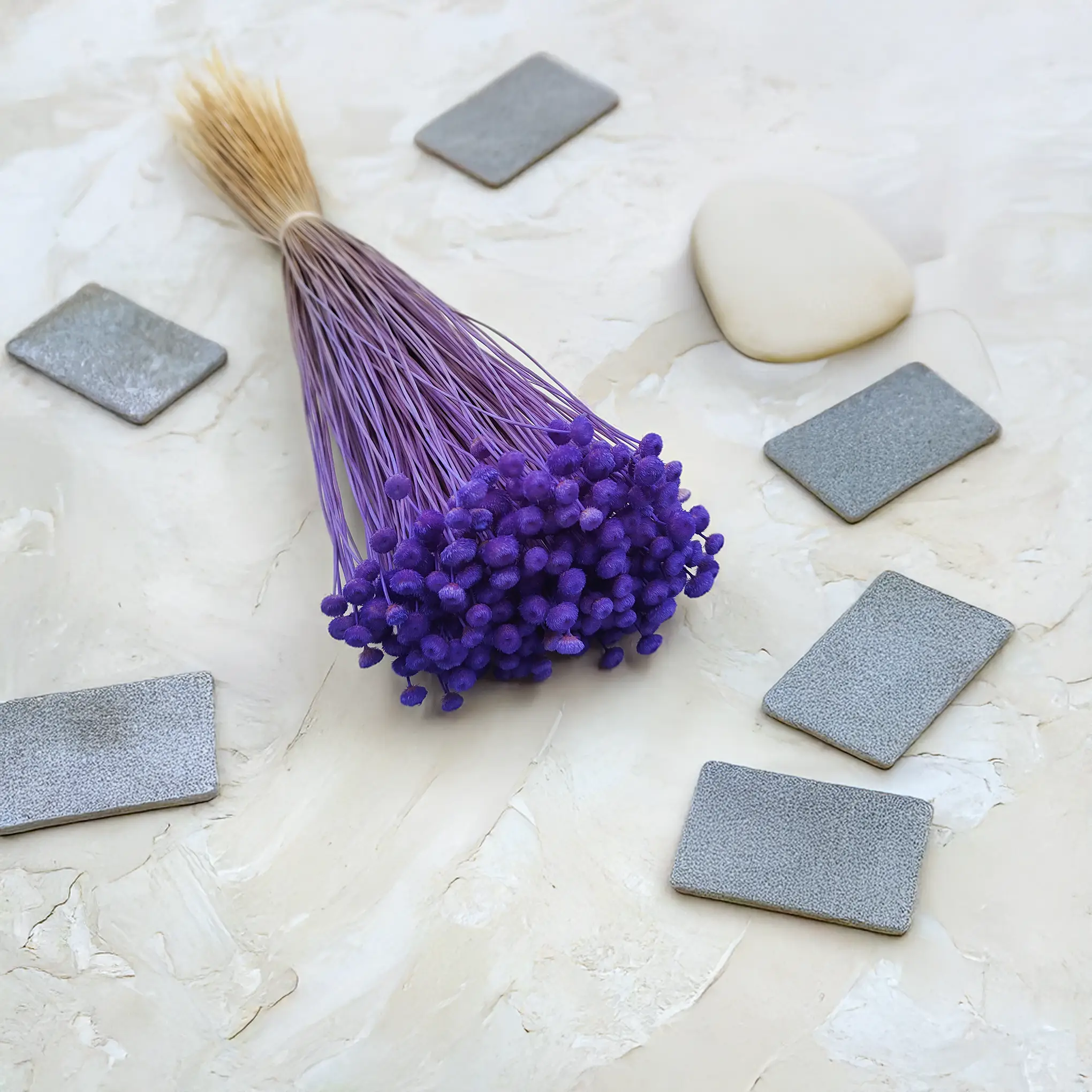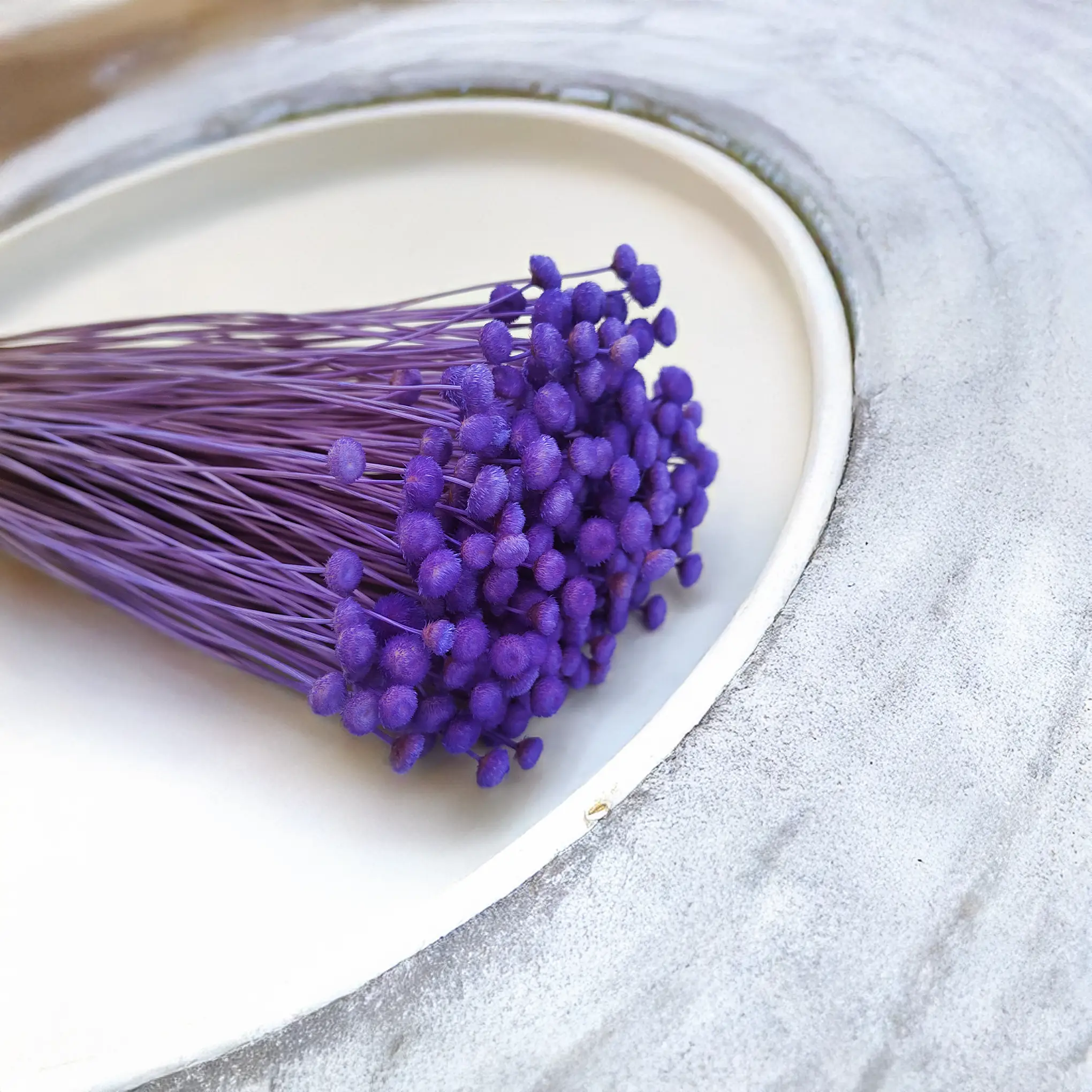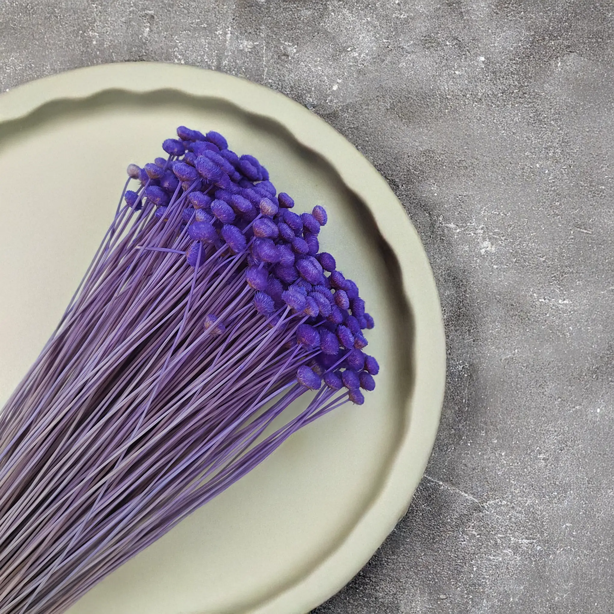 Botao Amarelino w odcieniu chabrowego fioletu (znane także jako Amarelinho) to wyjątkowy suszony kwiat o kulistych kwiatostanach, które zachwycają swoją barwą i strukturą. Roślina pochodzi z Ameryki Południowej i została starannie wysuszona oraz zabarwiona, by zachować trwałość i głębię koloru.