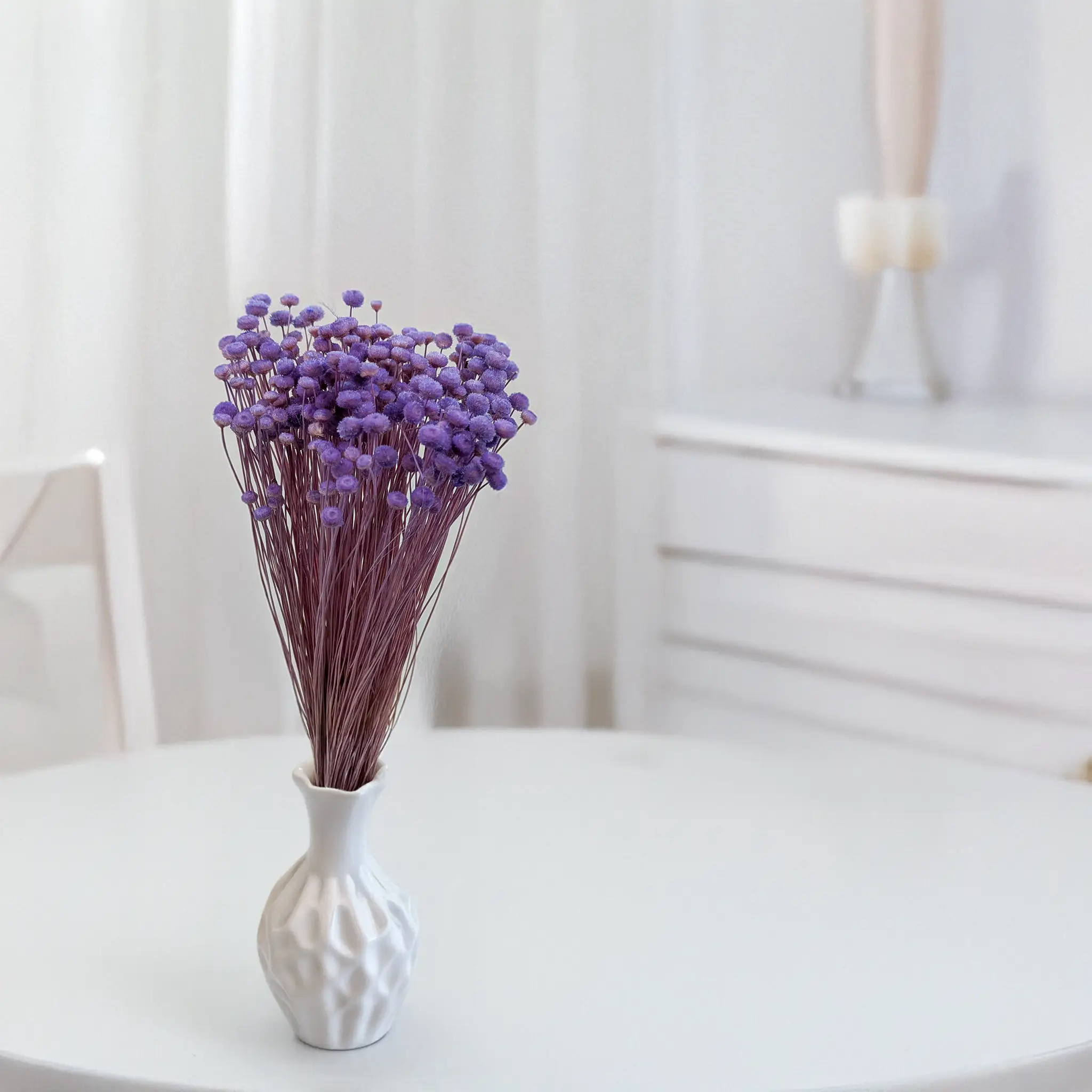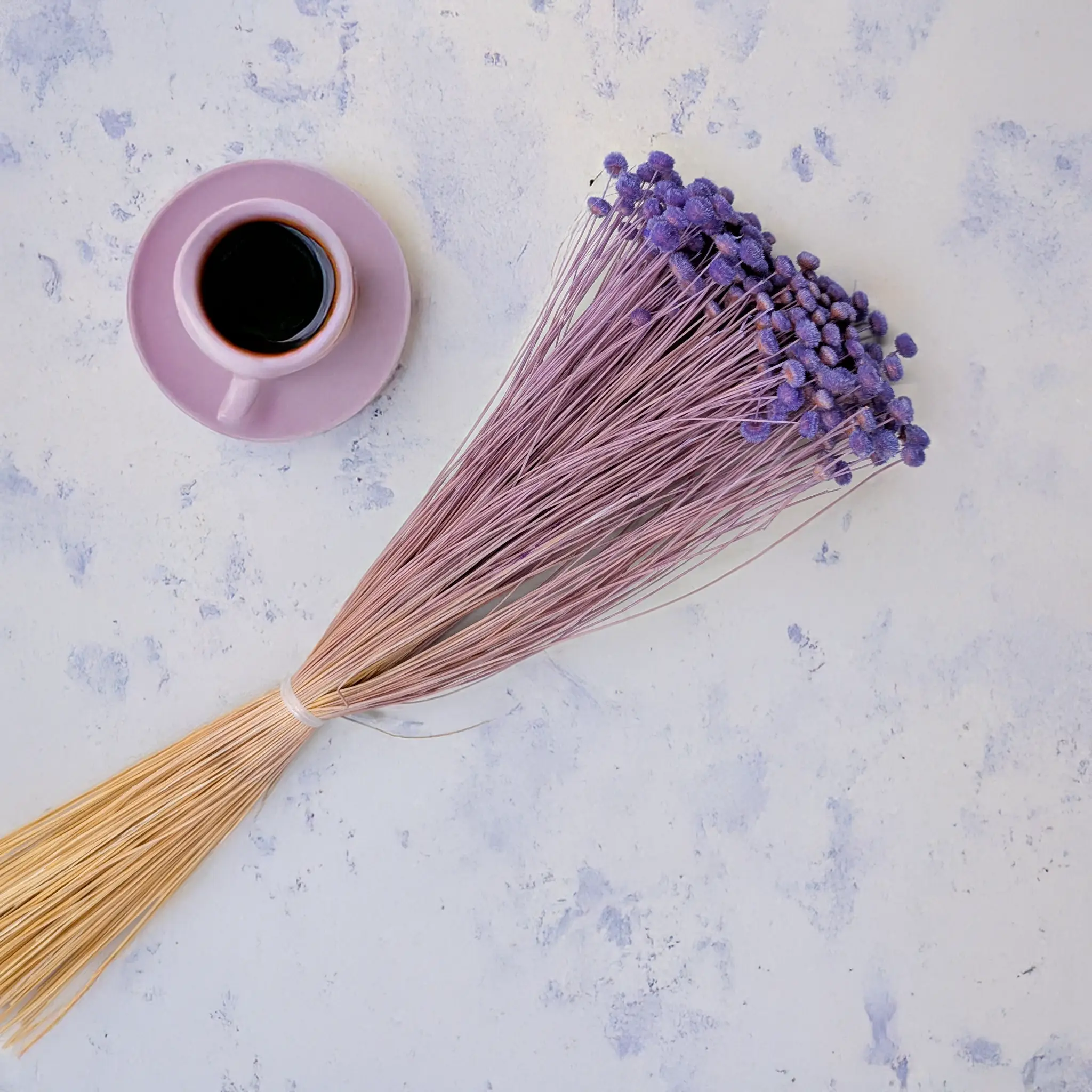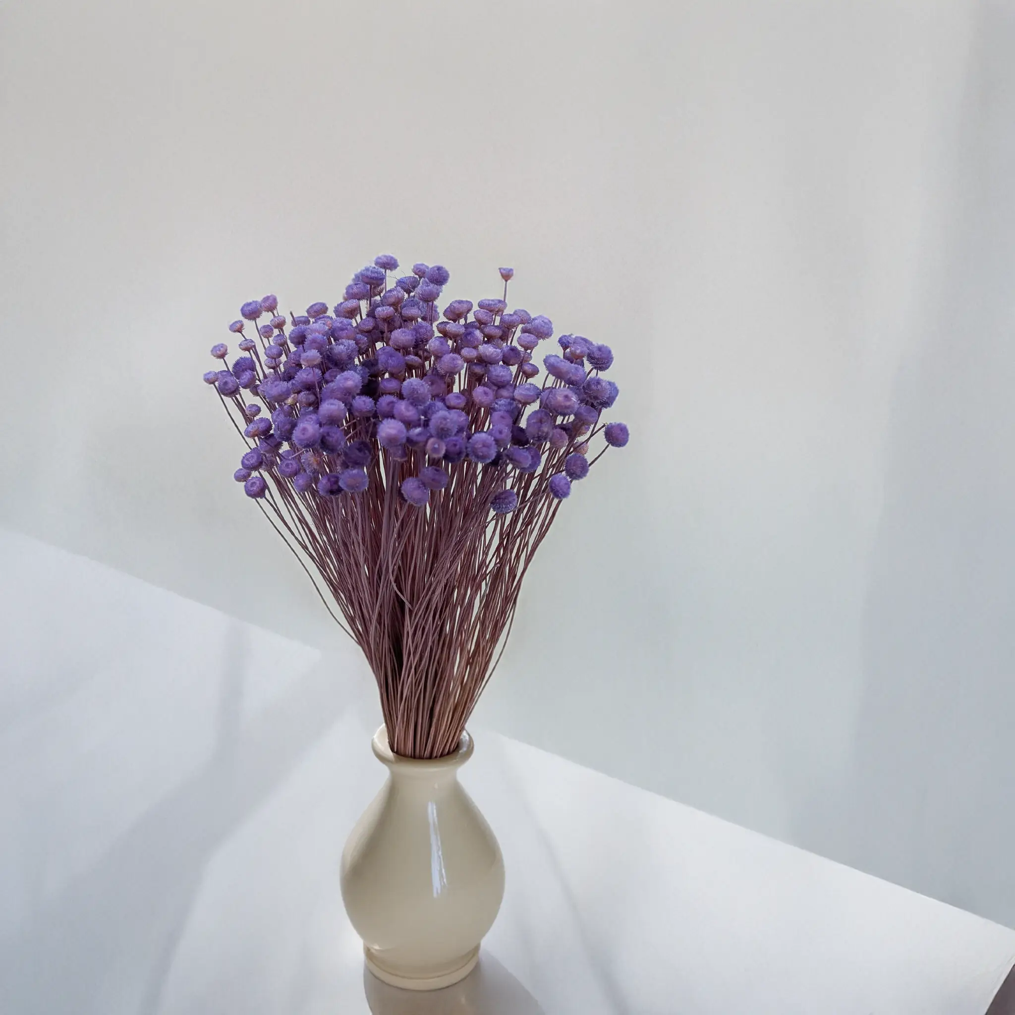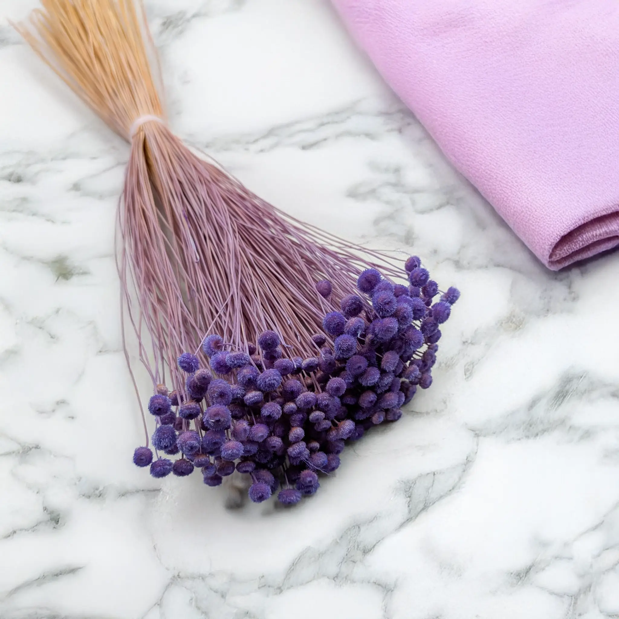 Suszone kwiaty Botao Amarelino, znane także jako Amarelinho, w kolorze lawendowym prezentują się jak drobne kuleczki osadzone na smukłych łodygach. Ich subtelny, fioletowy odcień wnosi do aranżacji romantyczny i delikatny akcent. To doskonały wybór zarówno do bukietów, jak i nowoczesnych dekoracji.