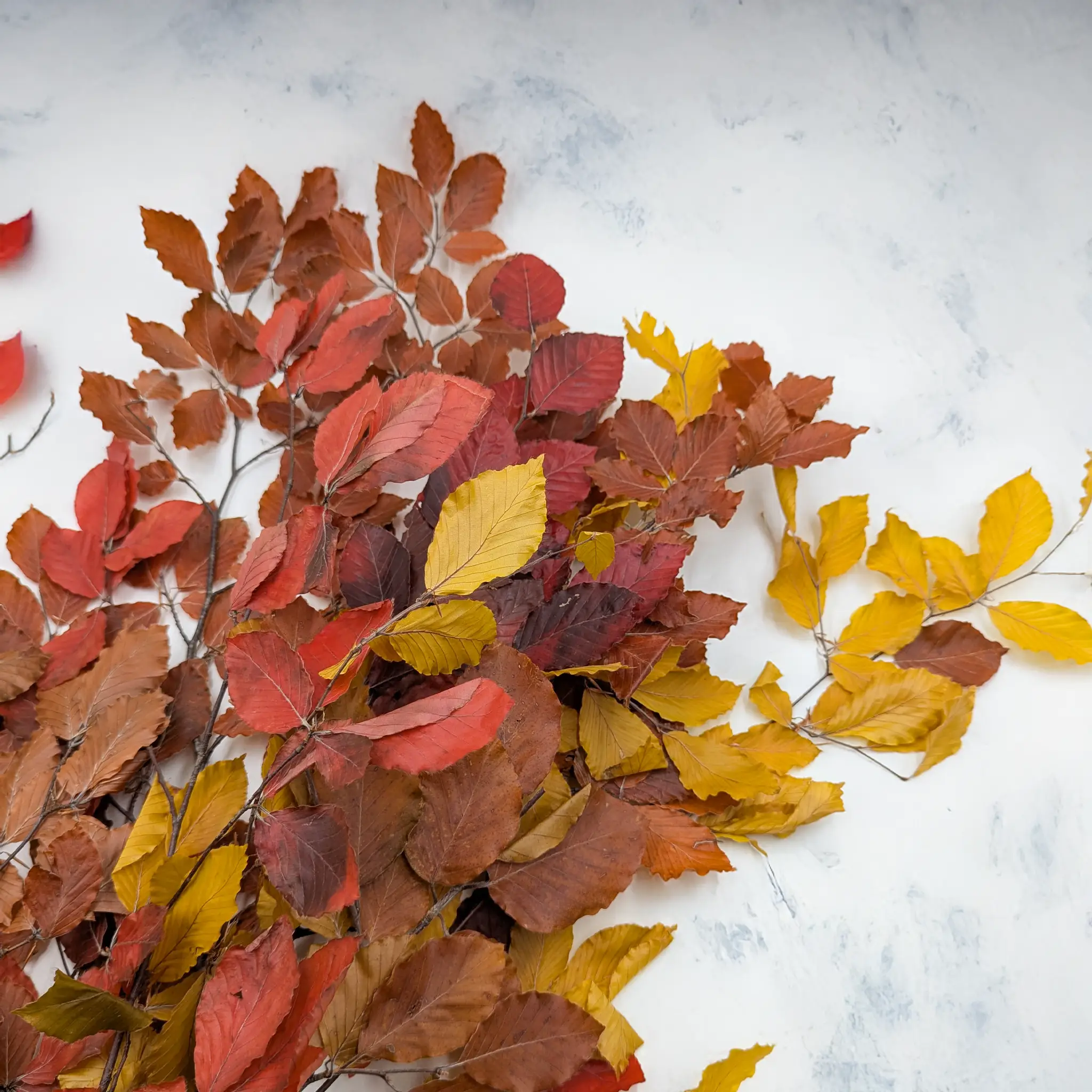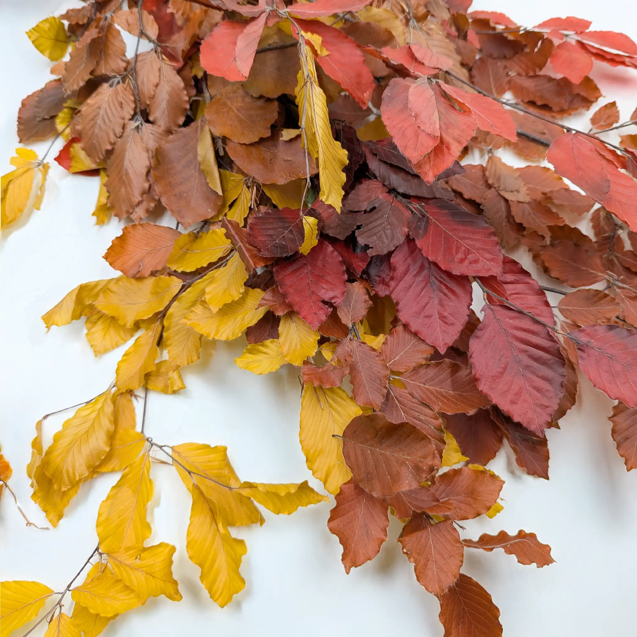 Buk stabilizowany w kolorze jesiennym to harmonijne połączenie ciepłych tonów czerwieni, pomarańczu, brązu i złotej żółci. Ta naturalna paleta barw doskonale oddaje charakter jesieni, wprowadzając do wnętrz przytulność, spokój i elegancki, rustykalny klimat. Każda gałązka jest wyjątkowa i pełna głębi kolorystycznej, dzięki czemu stanowi idealną bazę do sezonowych kompozycji florystycznych.