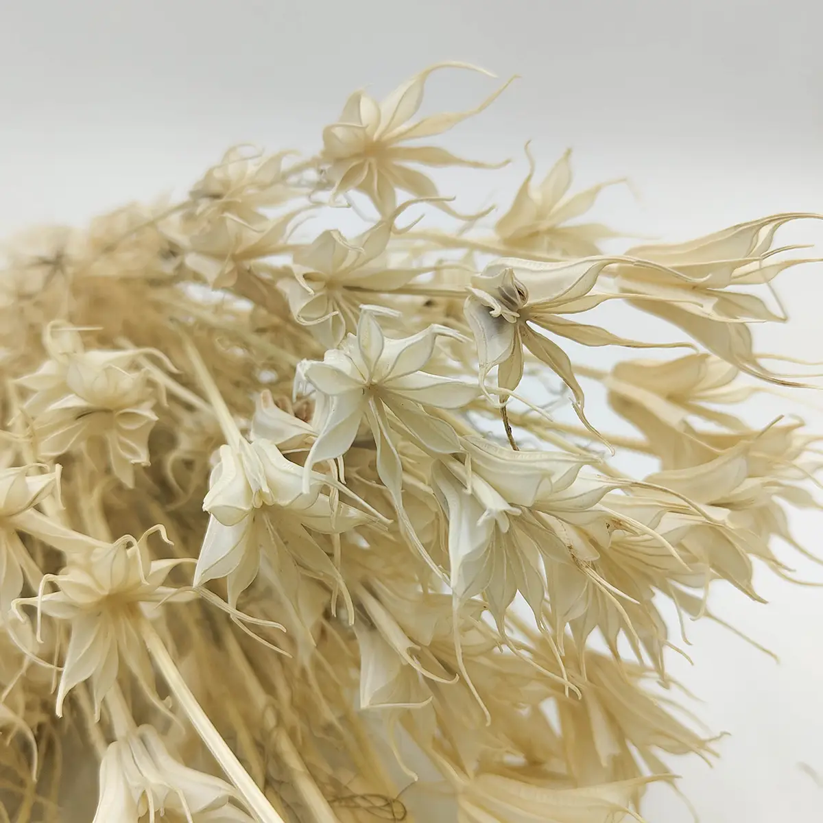 Bielona czarnuszka orientalna to subtelna i elegancka roślina dekoracyjna pochodzenia polskiego. Jej drobne, gwiazdkowe kwiaty osadzone na kilku łodygach tworzą wyrafinowaną strukturę, która idealnie uzupełnia kompozycje w stylu rustykalnym, ślubnym, boho i japandi. Neutralna kolorystyka bielonej czarnuszki pozwala na swobodne łączenie z innymi suszonymi roślinami, takimi jak lagurus, glixia, phalaris czy gipsówka.