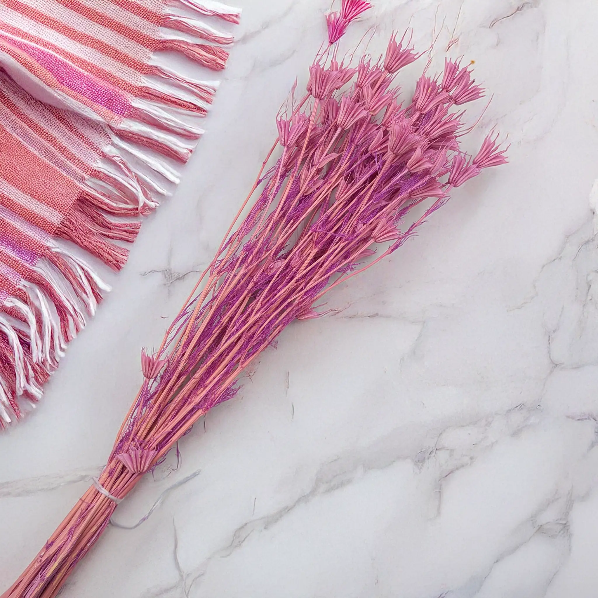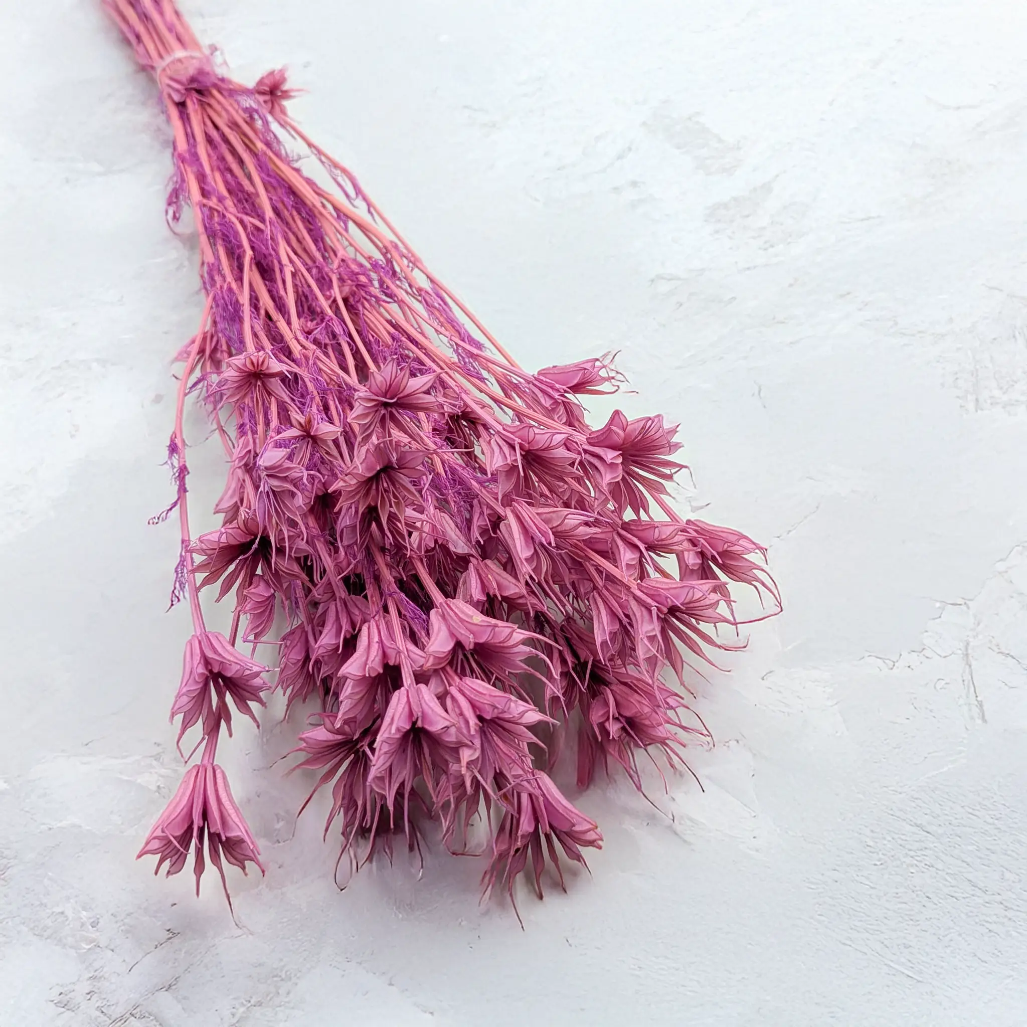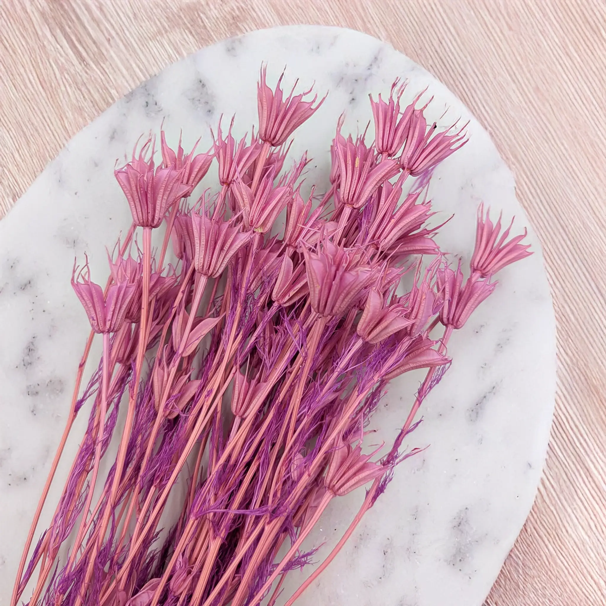 Liliowa Nigella doskonale sprawdzi się w bukietach ślubnych, kompozycjach stołowych, dekoracjach wnętrz oraz florystyce eventowej. Pasuje do projektów w stylu romantycznym, vintage, boho i glamour. Wspaniale uzupełnia suszone róże, eukaliptus, lagurusa, glixię i trawy pampasowe, wprowadzając subtelny kolorystyczny akcent.
