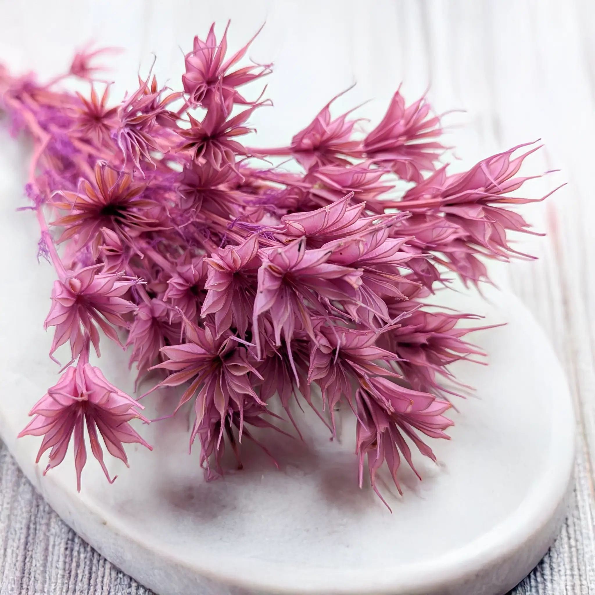 Czarnuszka orientalna (Nigella Orientalis) w kolorze liliowym to suszona roślina dekoracyjna o niezwykłej lekkości i subtelnym uroku. Jej drobne, wyraziste kapsuły nasienne w delikatnym liliowym odcieniu pięknie rozświetlają aranżacje, nadając im romantycznego, eterycznego charakteru.