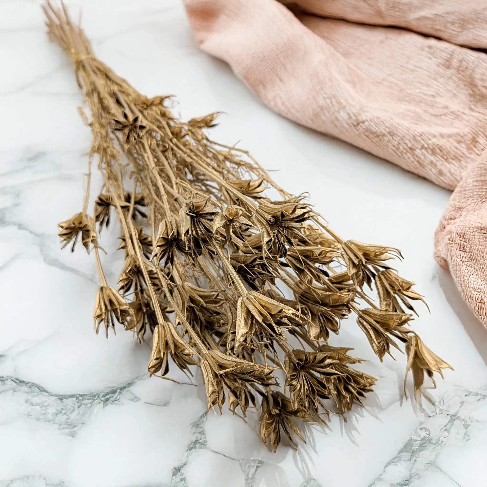 Suszona czarnuszka w kolorze złotym idealnie uzupełnia kompozycje świąteczne, bukiety okolicznościowe oraz aranżacje w stylu glamour i boho. Świetnie prezentuje się także solo w minimalistycznym wazonie lub w połączeniu z lunarią, phalarisem, pampasem i gipsówką.