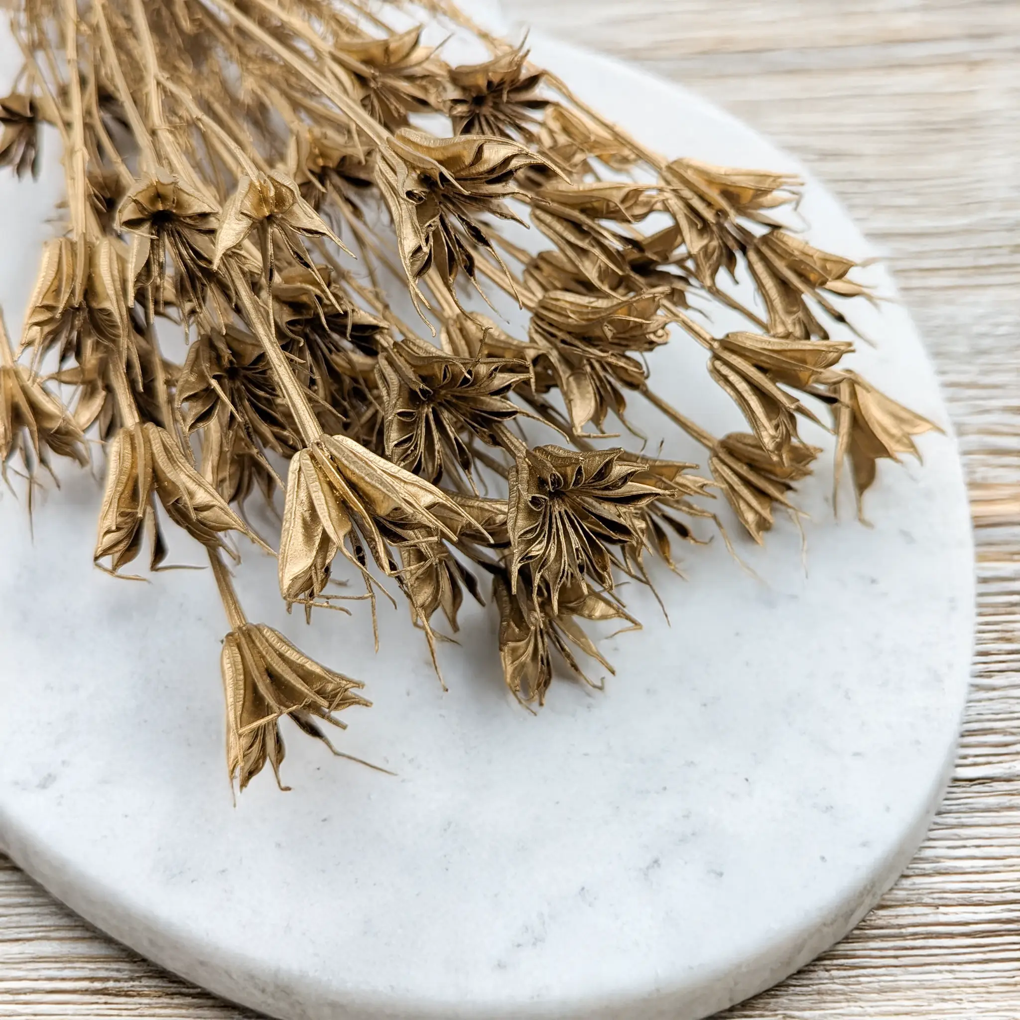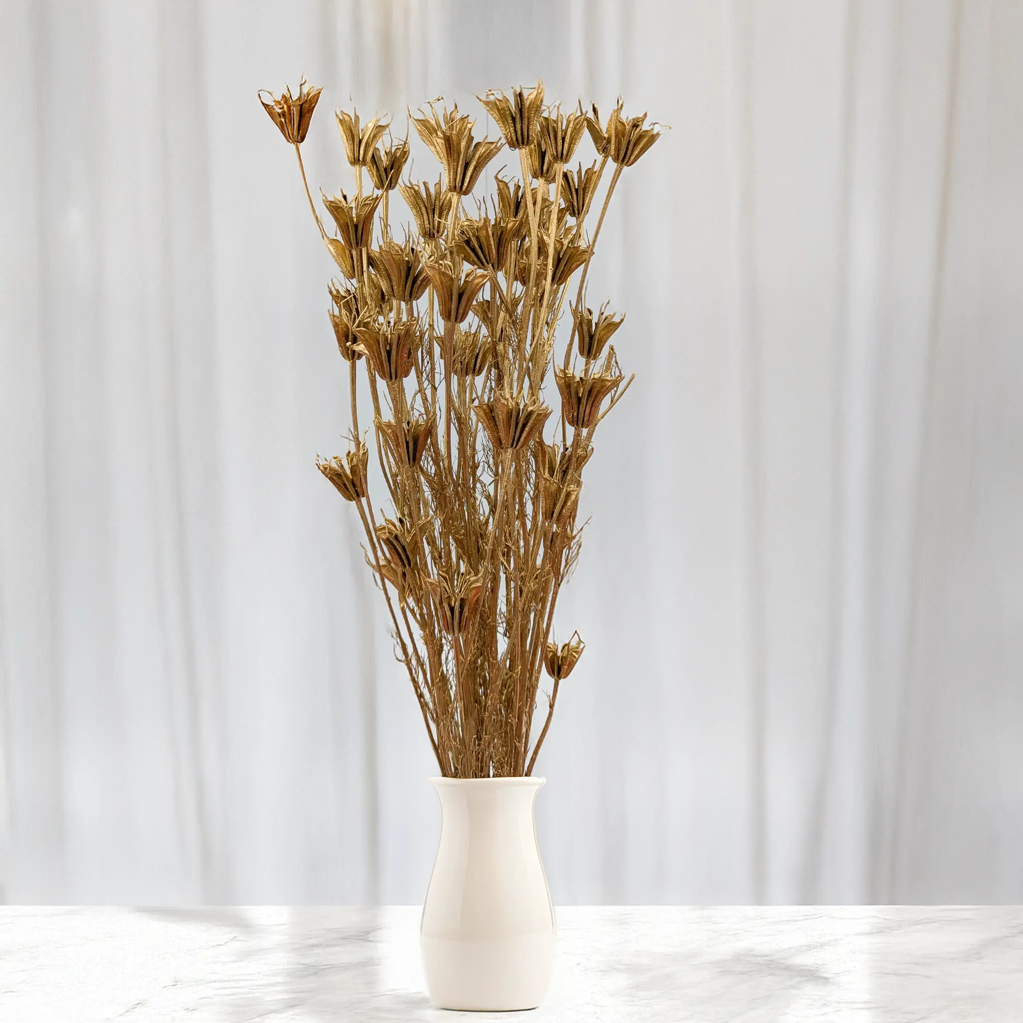 Złota czarnuszka orientalna (Nigella Orientalis) to wyjątkowy suszonek dekoracyjny, który przyciąga uwagę swoim szlachetnym, ciepłym odcieniem. Jej drobne, gwiazdkowe kwiaty o lekkiej, ażurowej strukturze dodają kompozycjom blasku, elegancji i wyjątkowego stylu. Dzięki procesowi delikatnego barwienia zachowuje intensywny kolor i formę przez wiele miesięcy.