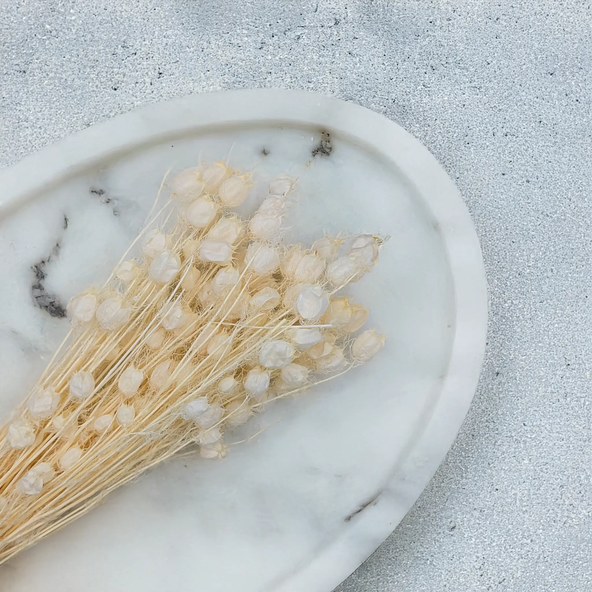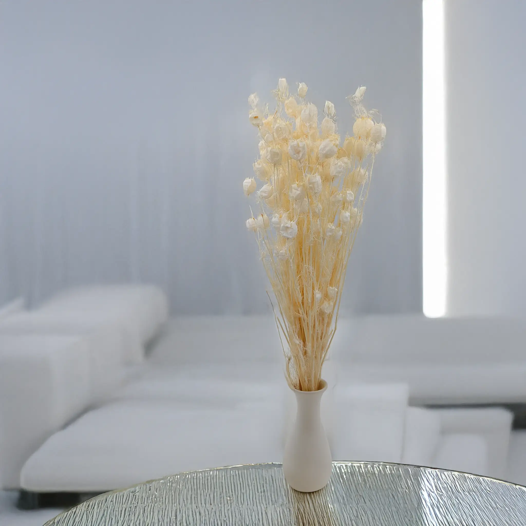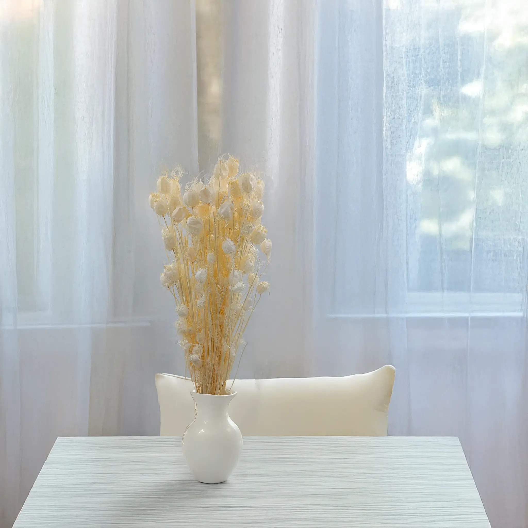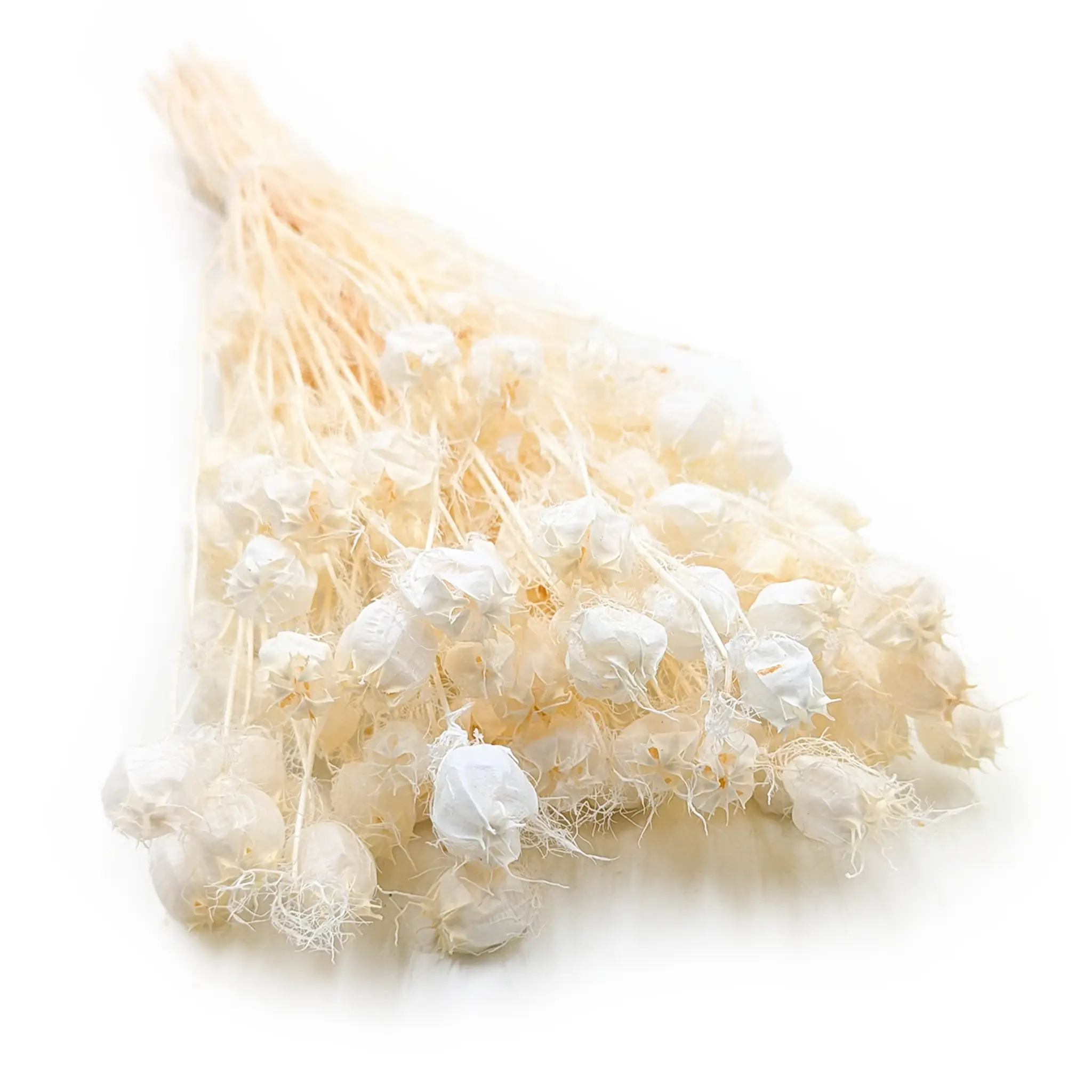 Suszona czarnuszka o dużych, efektownych bielonych gniazdach nasiennych, pochodząca z naturalnych upraw. Jej delikatna, śnieżnobiała barwa nadaje kompozycjom lekkości i świeżości, świetnie komponując się z suszonymi trawami, eukaliptusem, lagurusem czy gipsówką. Idealna do rustykalnych bukietów, dekoracji boho i eleganckich aranżacji wnętrz.