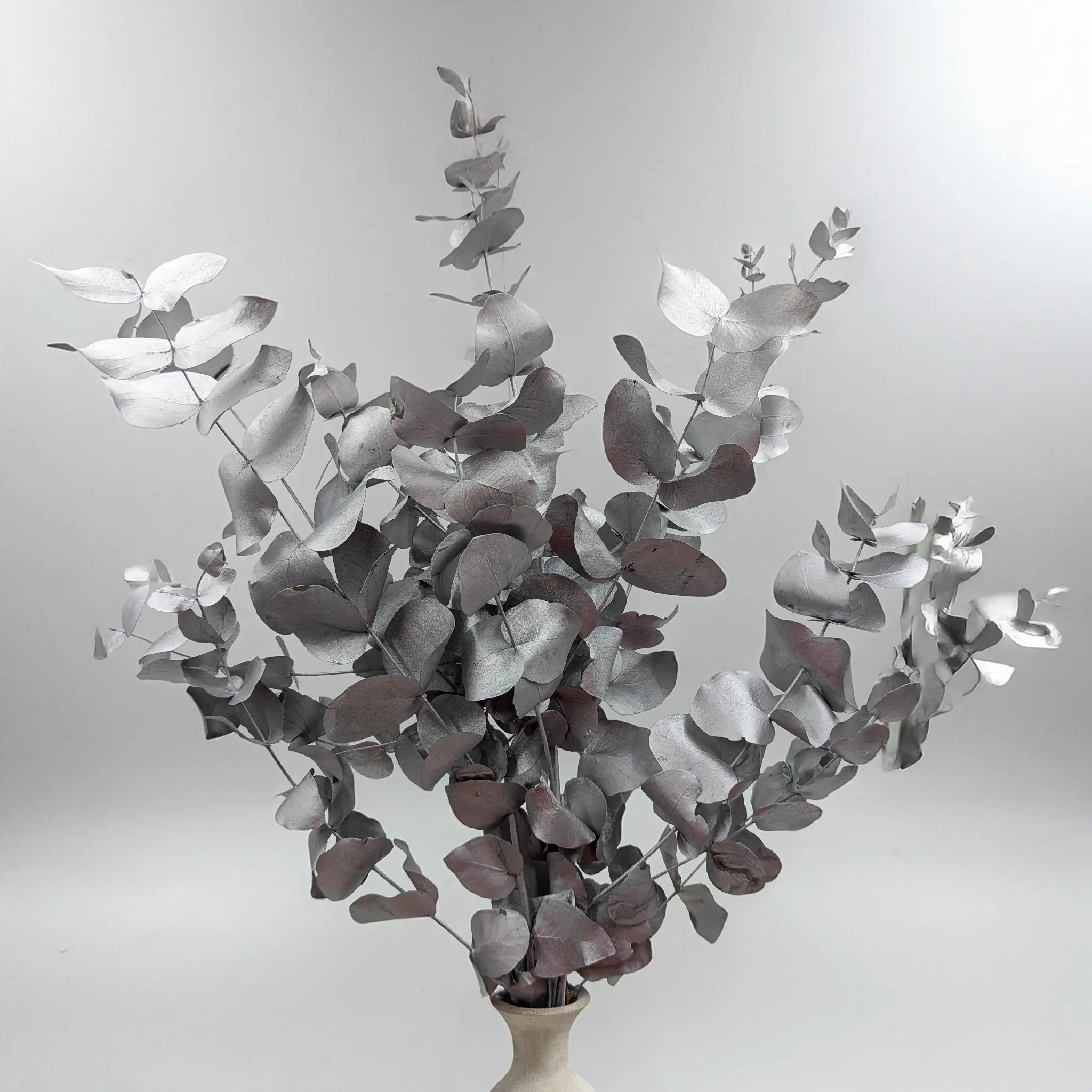 Srebro symbolizuje równowagę, intuicję i wewnętrzny spokój. W połączeniu z eukaliptusem – symbolem oczyszczenia i świeżości – tworzy duet, który wnosi do przestrzeni wrażenie porządku i harmonii. Stabilizowana forma rośliny podkreśla trwałość i ponadczasowość tej symboliki.