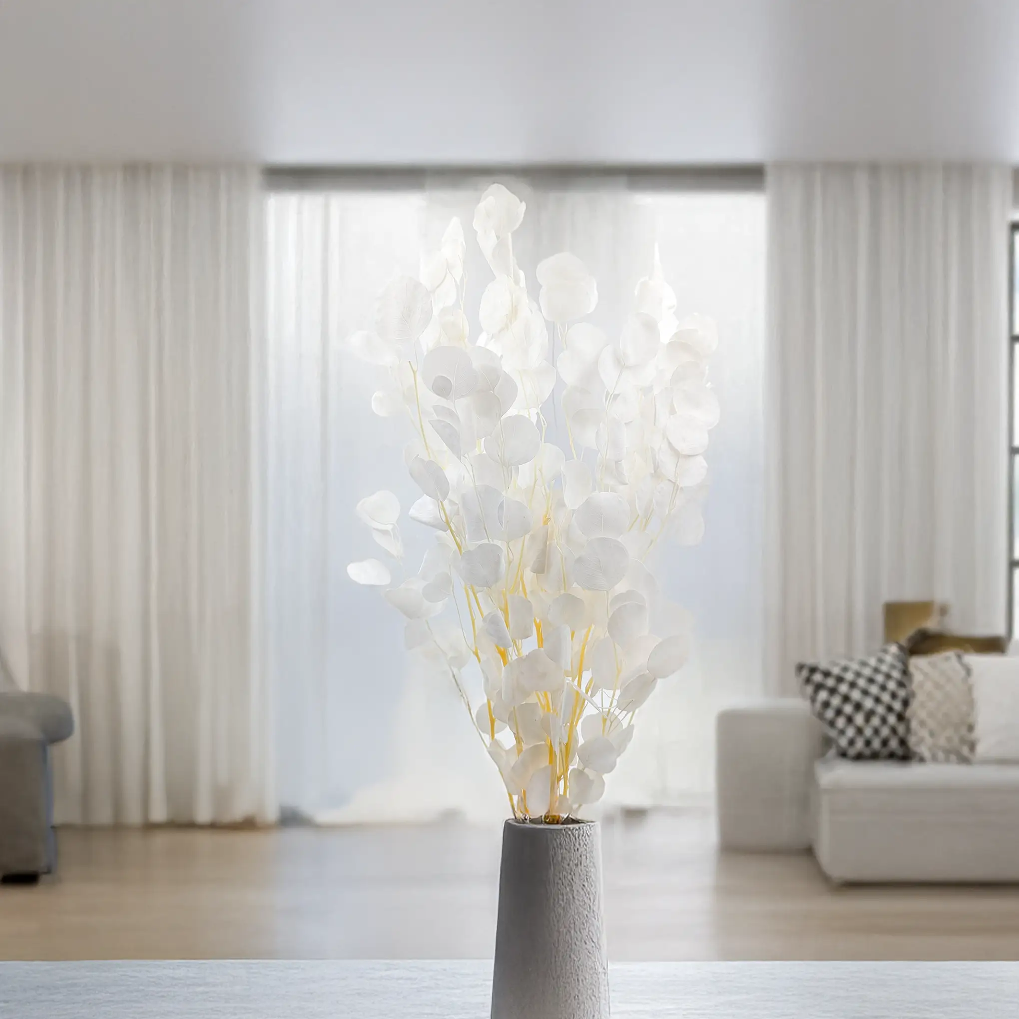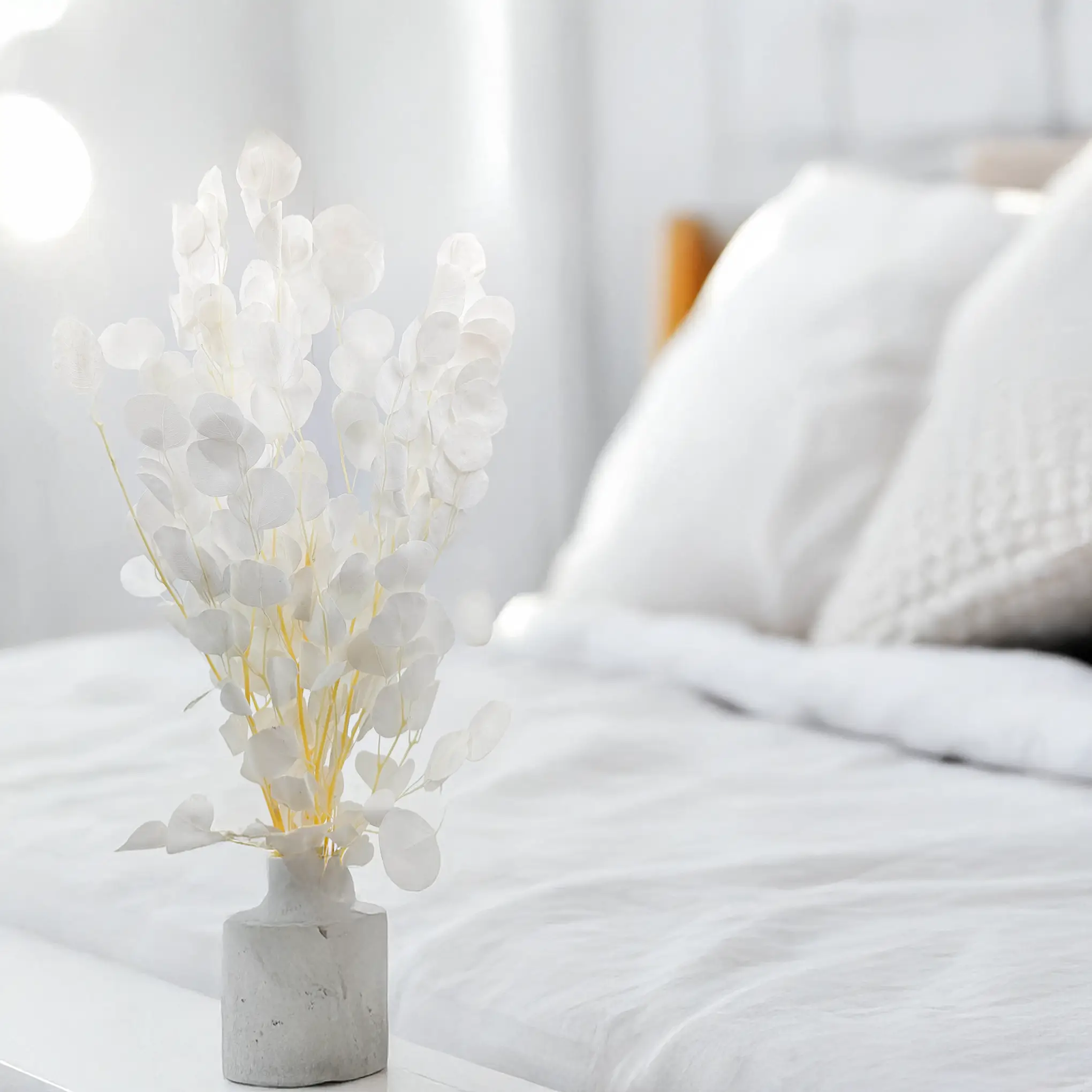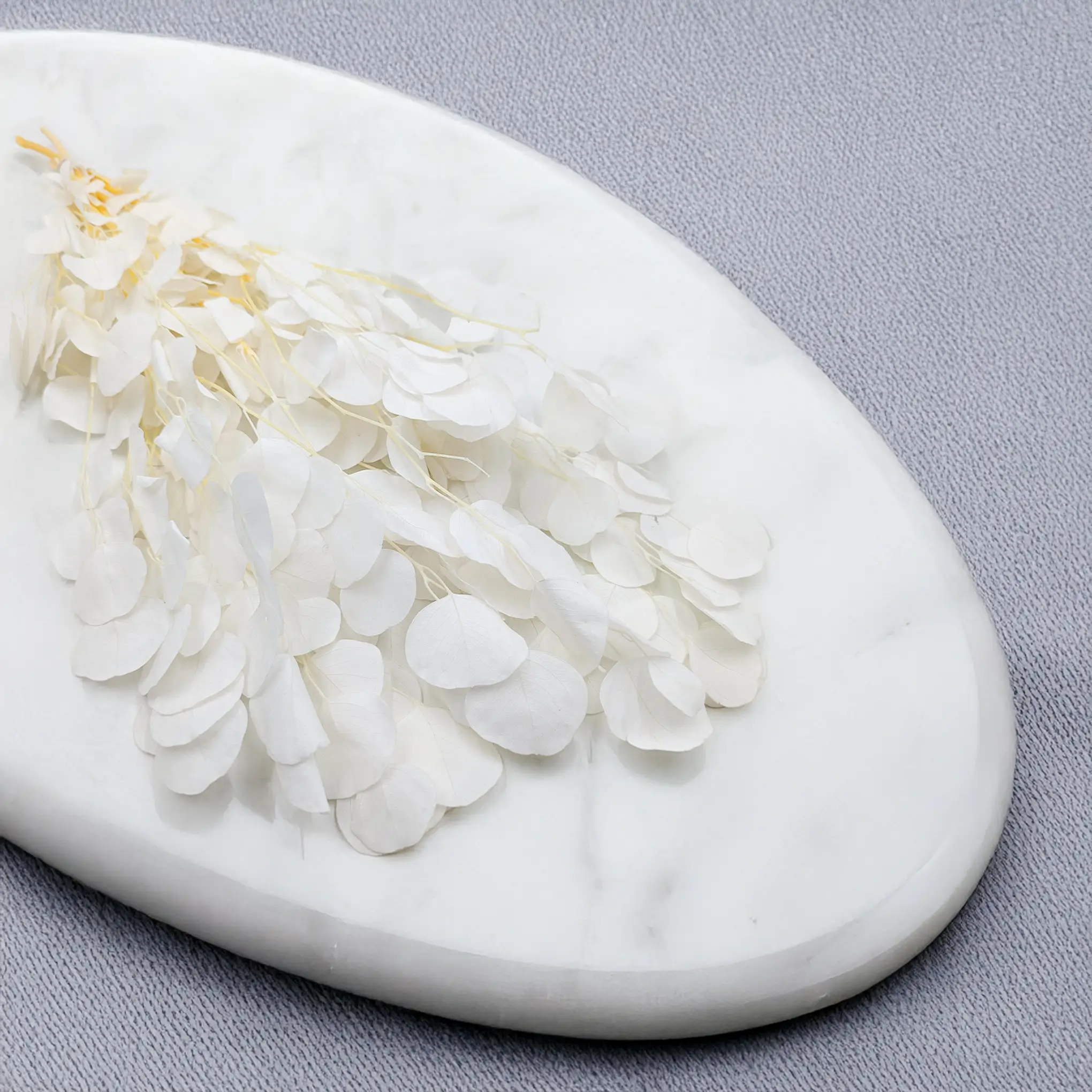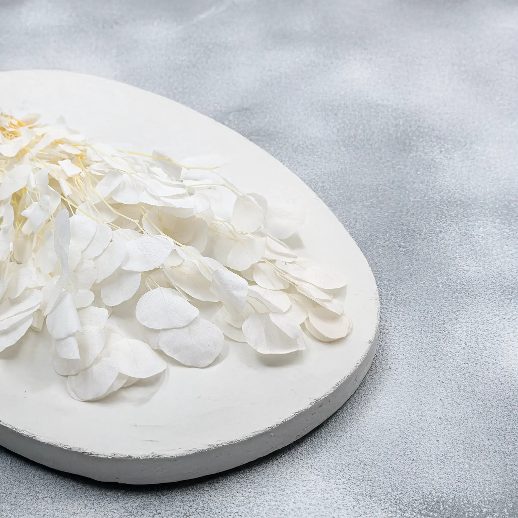 Bielony odcień eukaliptusa to efekt specjalnego procesu rozjaśniania, który nadaje roślinie miękki, kredowy wygląd z nutą beżu i ecru. To kolor neutralny i uniwersalny – pięknie łączy się z pastelami, złotem, naturalnym drewnem i bielą.