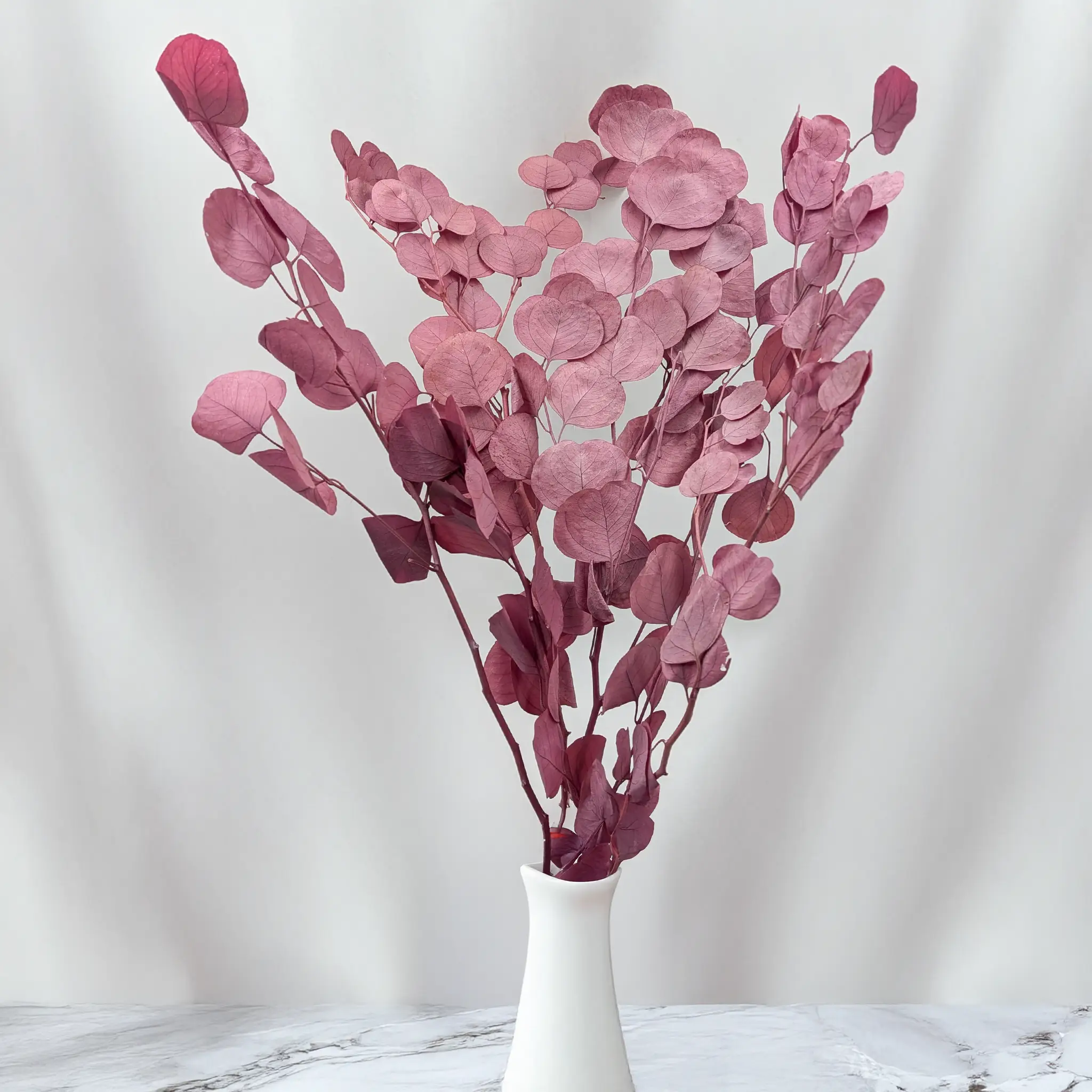 Eukaliptus stabilizowany Populus w kolorze brudnego różu to wyjątkowo elegancka i subtelna propozycja dla kompozycji florystycznych, które mają wprowadzać do wnętrza ciepło, romantyzm i naturalną harmonię. Delikatnie przygaszony odcień różu nadaje roślinie szlachetnego charakteru, dzięki czemu doskonale sprawdza się w dekoracjach ślubnych, aranżacjach stołów, flower boxach oraz bukietach w stylu boho, vintage i soft glamour.
