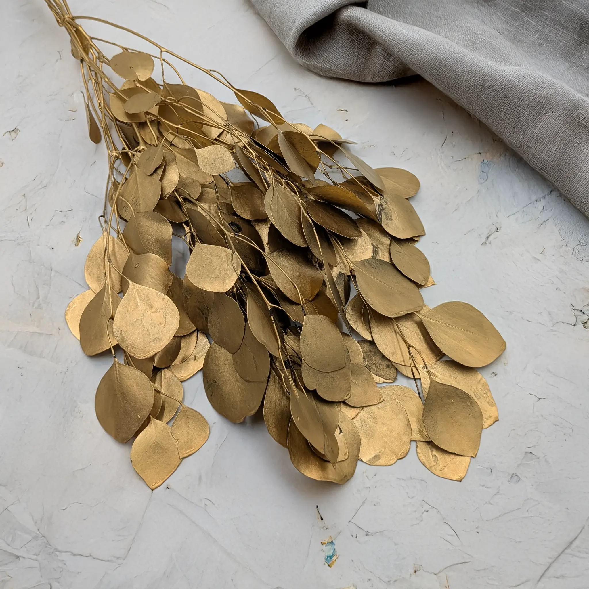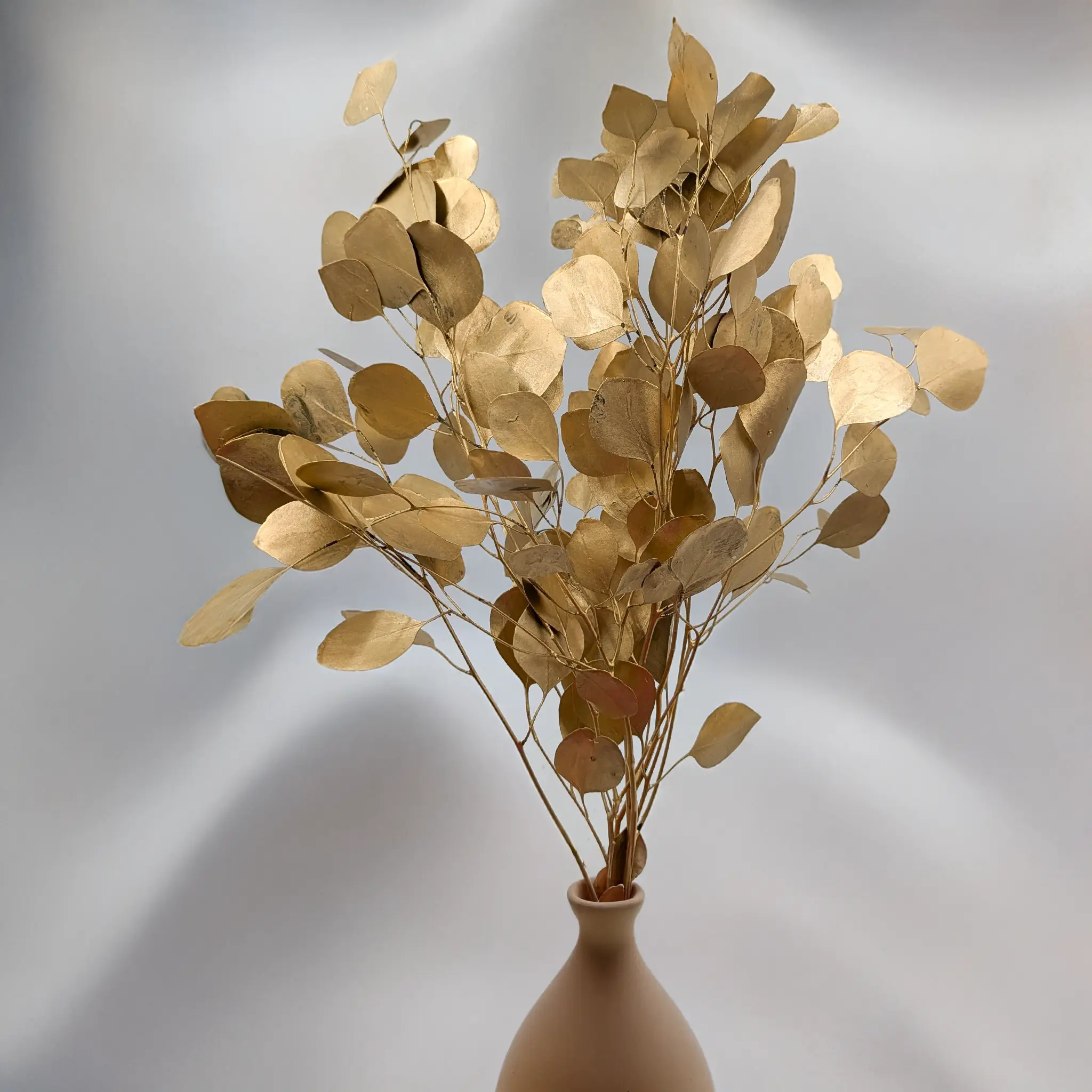 Stabilizowany eukaliptus Populus w kolorze złotym to wyjątkowy dodatek do kompozycji, które mają zachwycać elegancją i świątecznym charakterem. Jego duże, okrągłe liście o subtelnym metalicznym połysku tworzą efekt luksusu i ciepła. Idealny do świątecznych dekoracji, bukietów, stroików, girland oraz eleganckich aranżacji w stylu glamour, klasycznym i nowoczesnym. Stabilizacja sprawia, że zachowuje świeżość i kolor przez wiele miesięcy bez pielęgnacji.