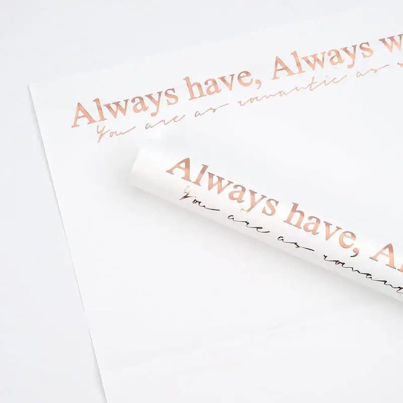 Folia florystyczna - Biała z różowo złotym napisem - Arkusze 50x58 cm