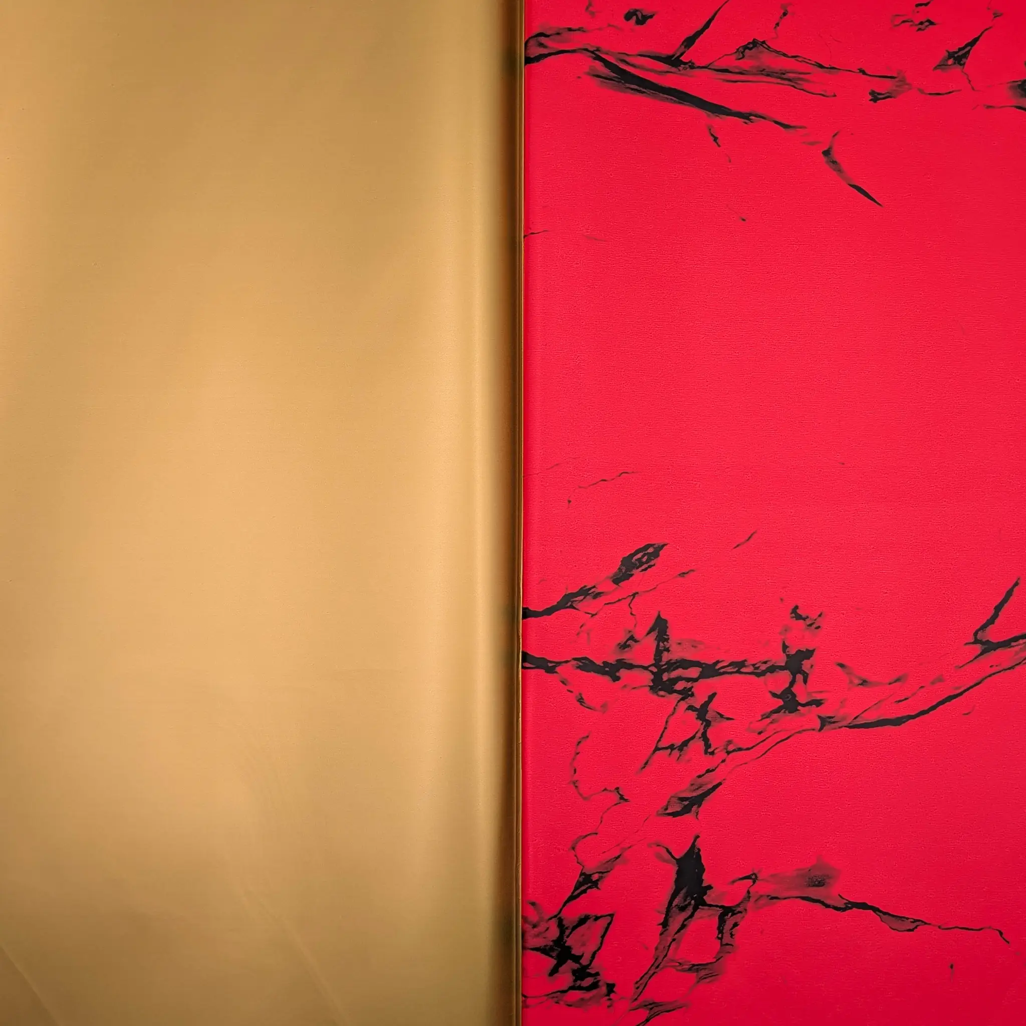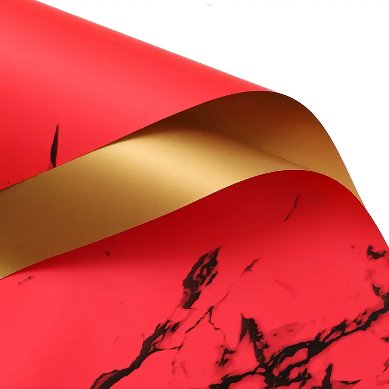 Stone&Shine w czerwonym wariancie marmurkowym to efektowny papier florystyczny dwustronny, który łączy wyrazisty design z eleganckim wykończeniem. Jedna strona arkusza została ozdobiona dynamicznym wzorem marmuru w odcieniach czerwieni, druga natomiast jest gładka i złota, nadając kompozycjom luksusowego charakteru.