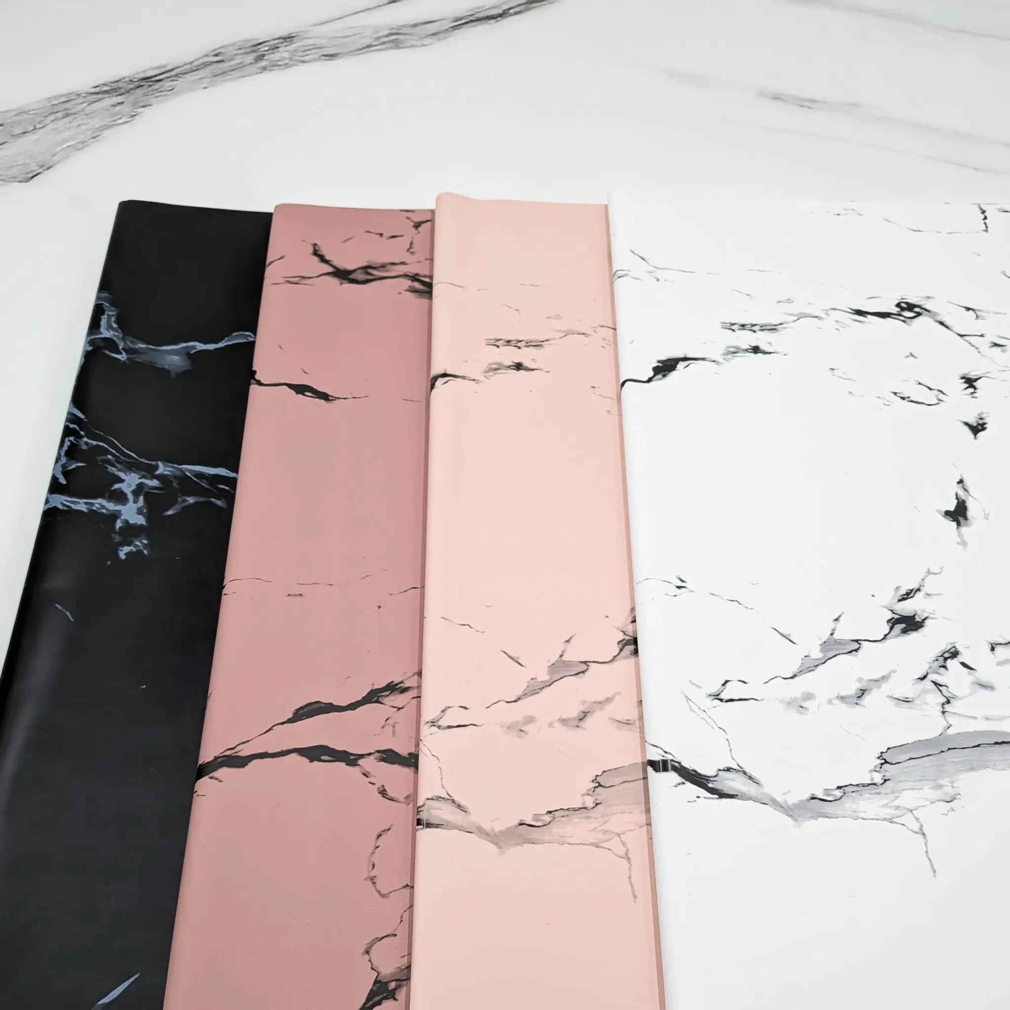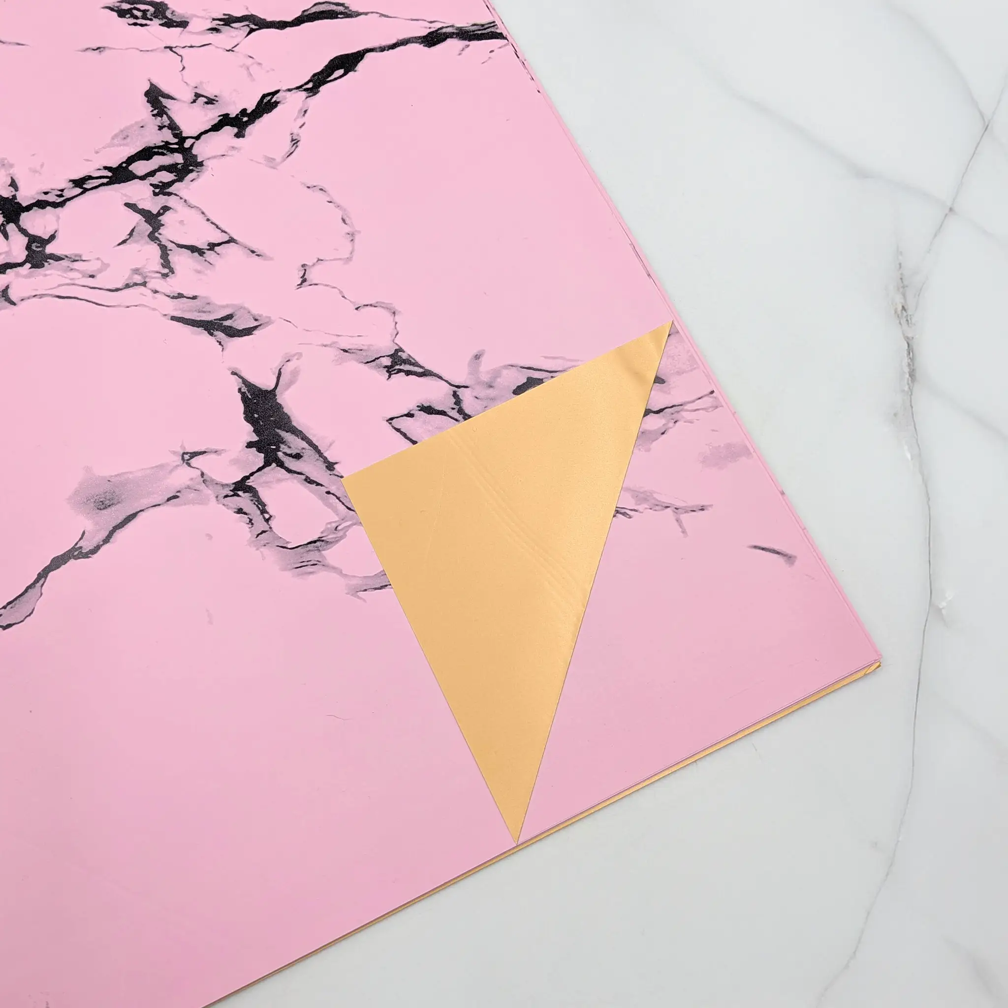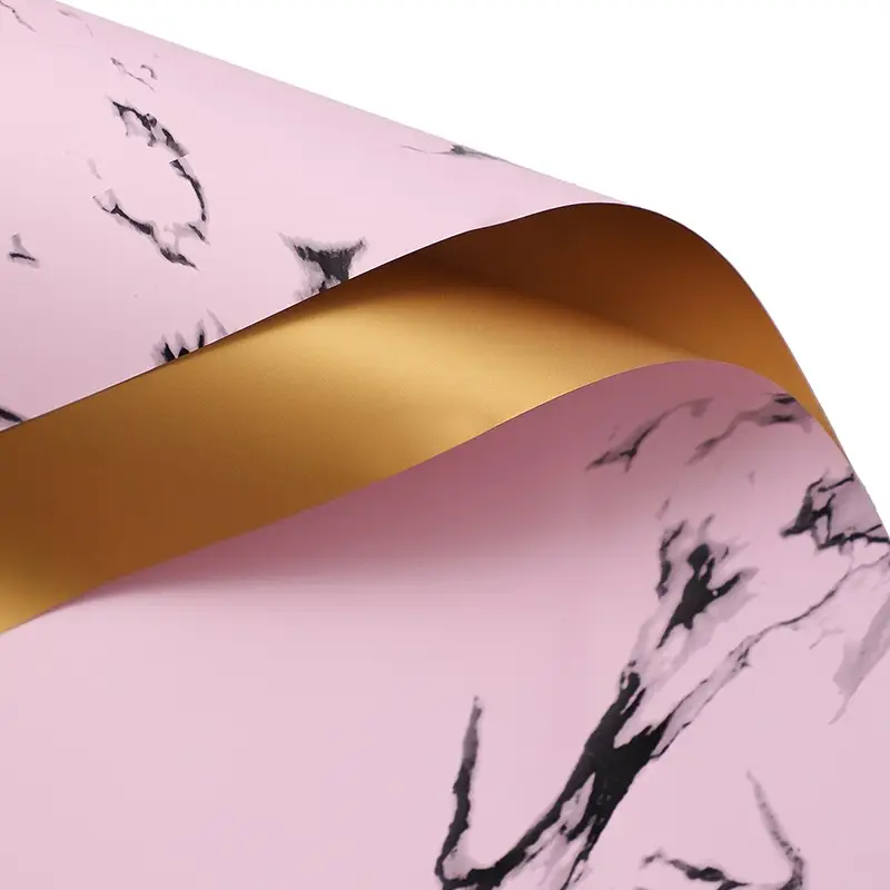 Stone&Shine w kolorze jasnego różu to dwustronna folia florystyczna inspirowana lekkością, świeżością i pastelową elegancją. Jedna strona arkusza posiada delikatny, marmurowy wzór w jasnoróżowym odcieniu, druga jest gładka i złota, co nadaje kompozycjom miękki, elegancki kontrast.