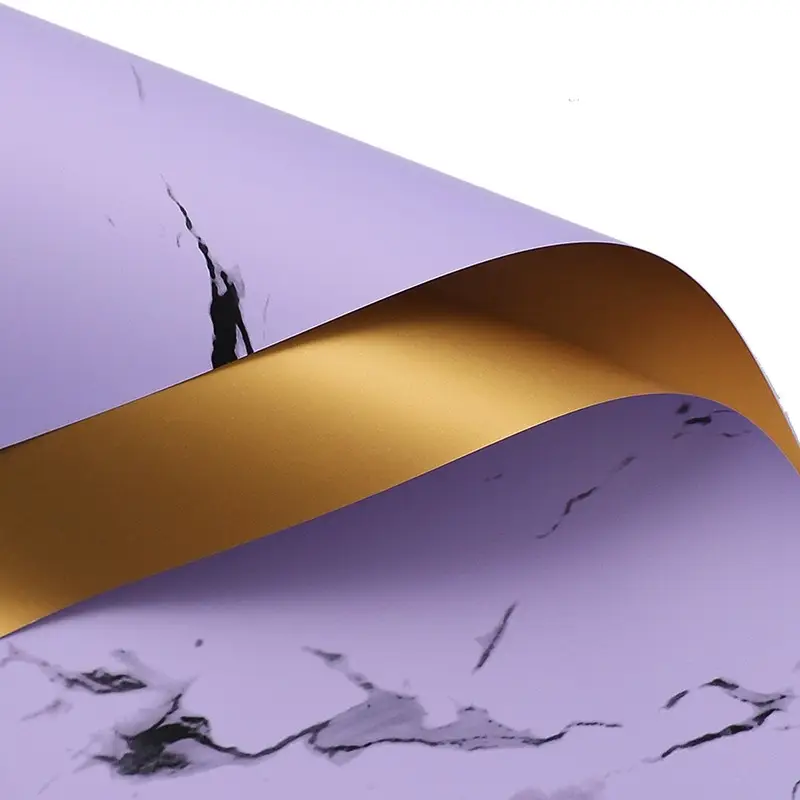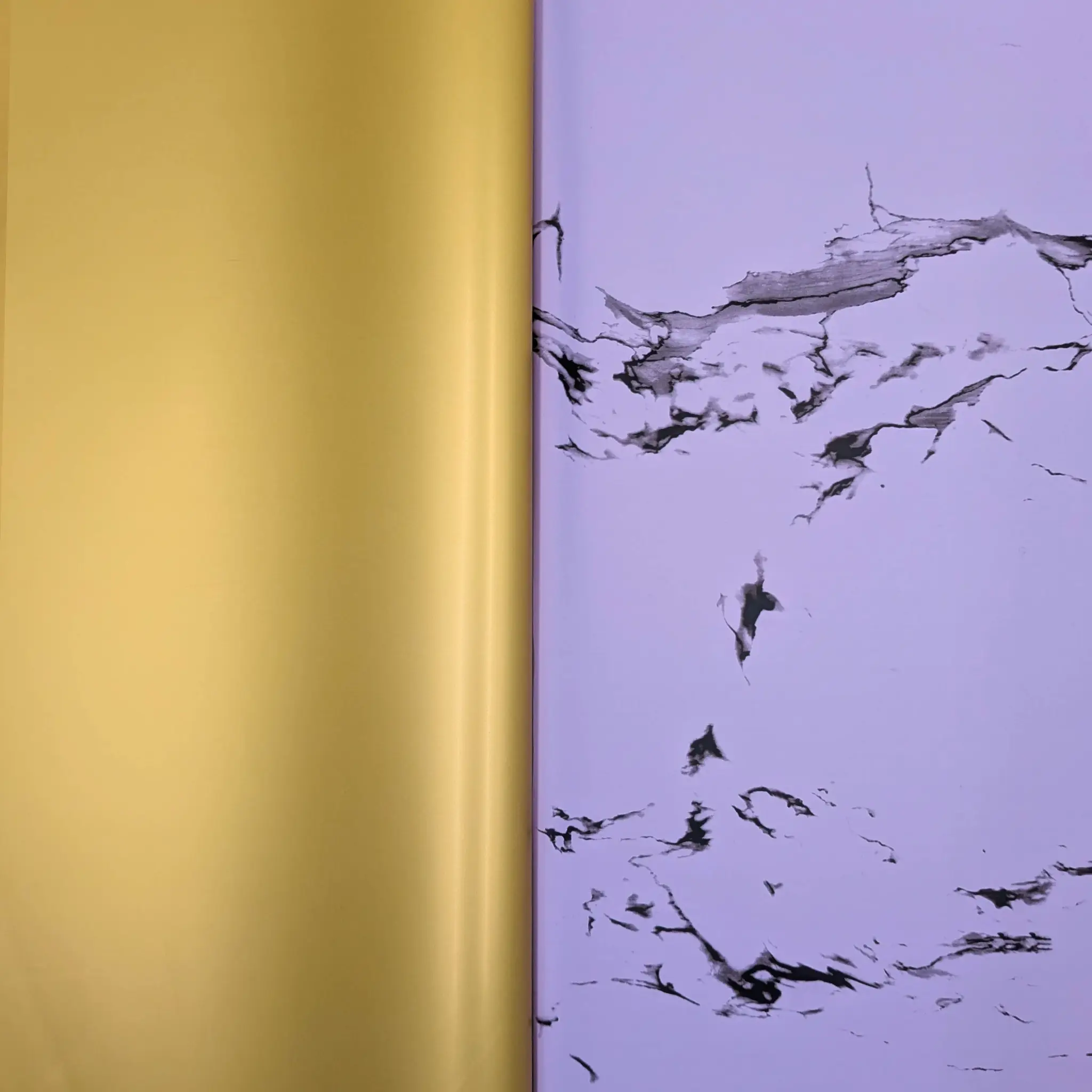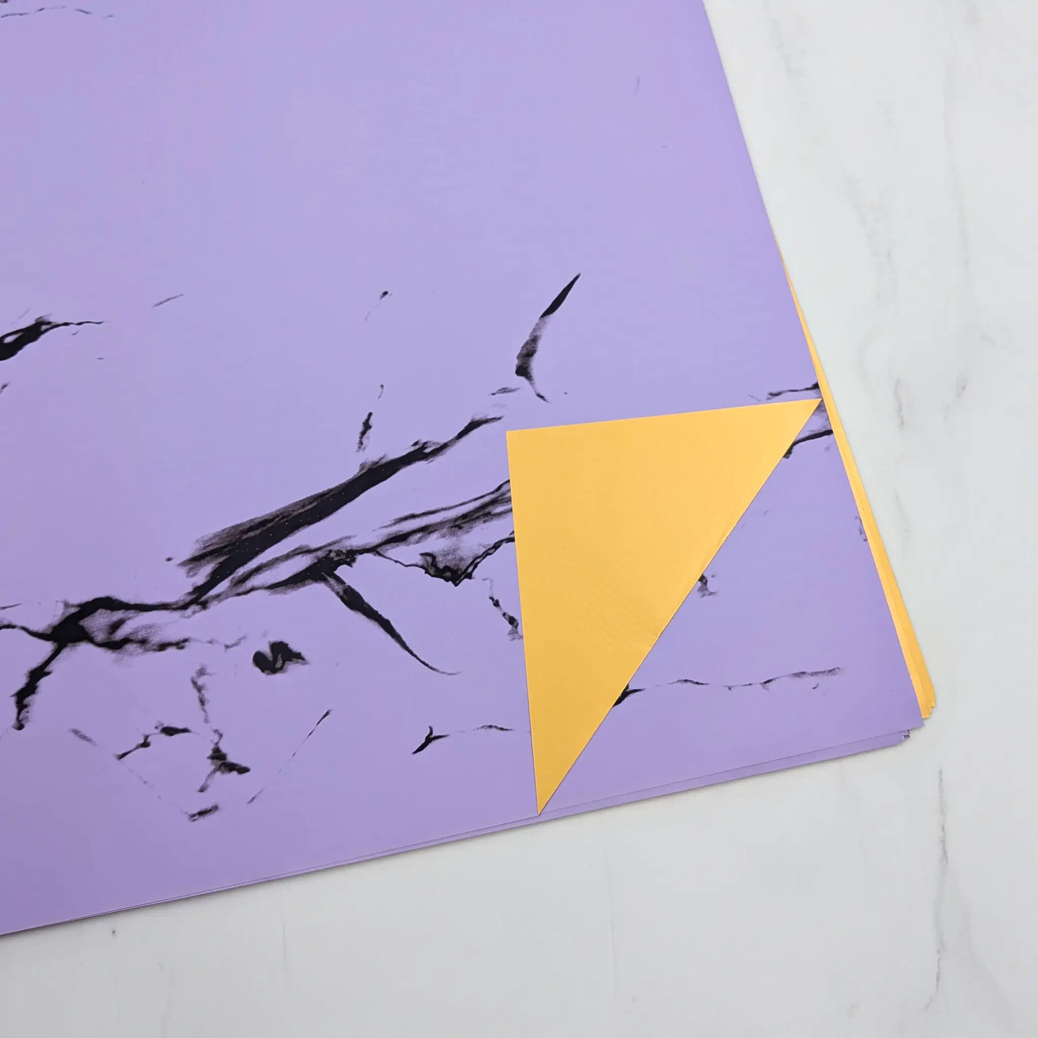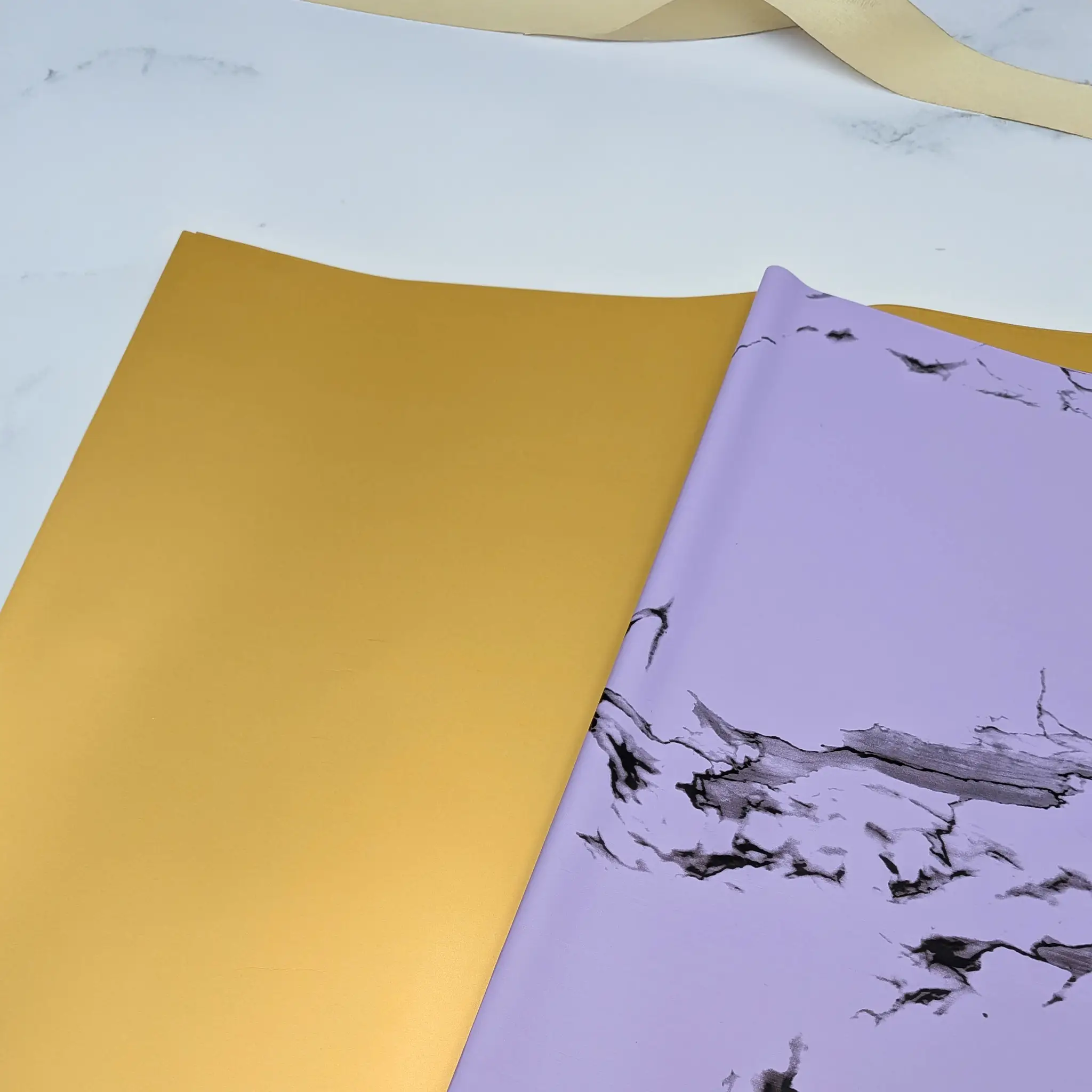 Stone&Shine w liliowej odsłonie marmurkowej to dwustronna folia florystyczna stworzona z myślą o eleganckich i nowoczesnych aranżacjach. Jedna strona arkusza zdobiona jest subtelnym wzorem marmuru w odcieniach lilii, natomiast druga jest gładka i złota, co pozwala uzyskać efekt luksusowego wykończenia kompozycji.