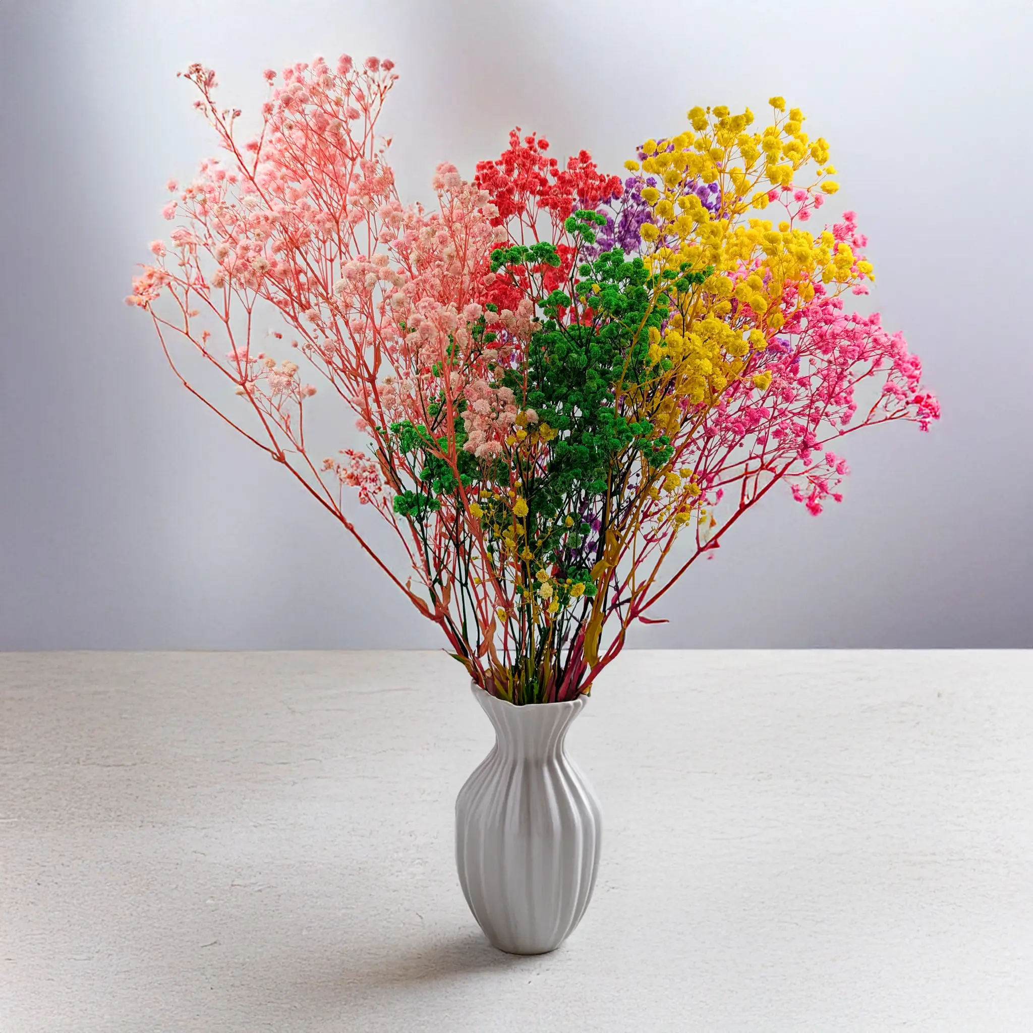 Gipsówka Stabilizowana Royal – Mix to połączenie kilku najpiękniejszych kolorów w jednym efektownym bukiecie. Żywe, nasycone odcienie tworzą wyjątkowy kontrast i sprawiają, że każda aranżacja nabiera wyrazistości oraz nowoczesnego charakteru.