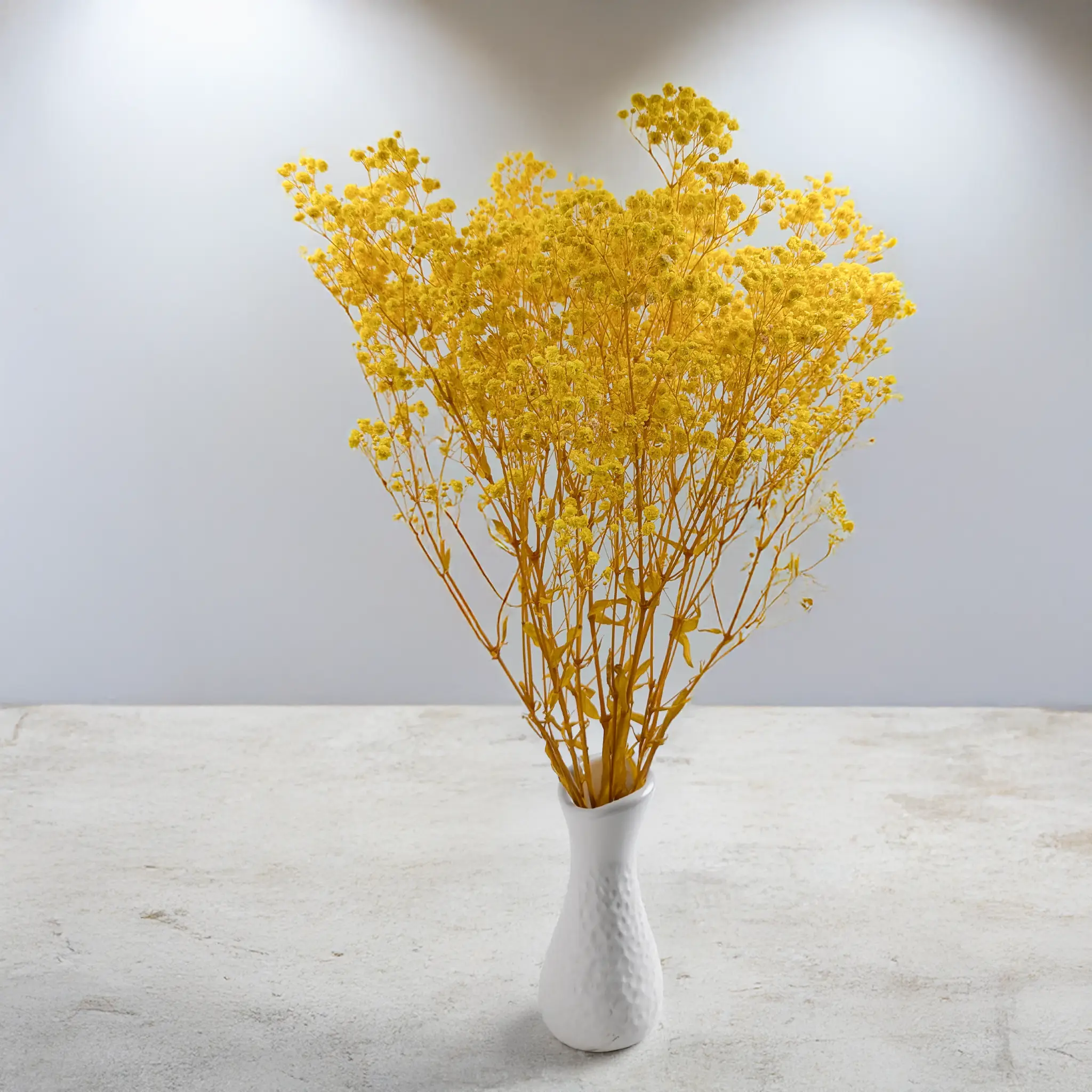 Gipsówka Stabilizowana Royal w kolorze żółtym to energetyczny i optymistyczny akcent, który natychmiast rozświetla każde wnętrze i kompozycję florystyczną. Jej żywy kolor kojarzy się z ciepłem, radością oraz pozytywną energią, dzięki czemu idealnie sprawdza się w dekoracjach okolicznościowych i sezonowych.