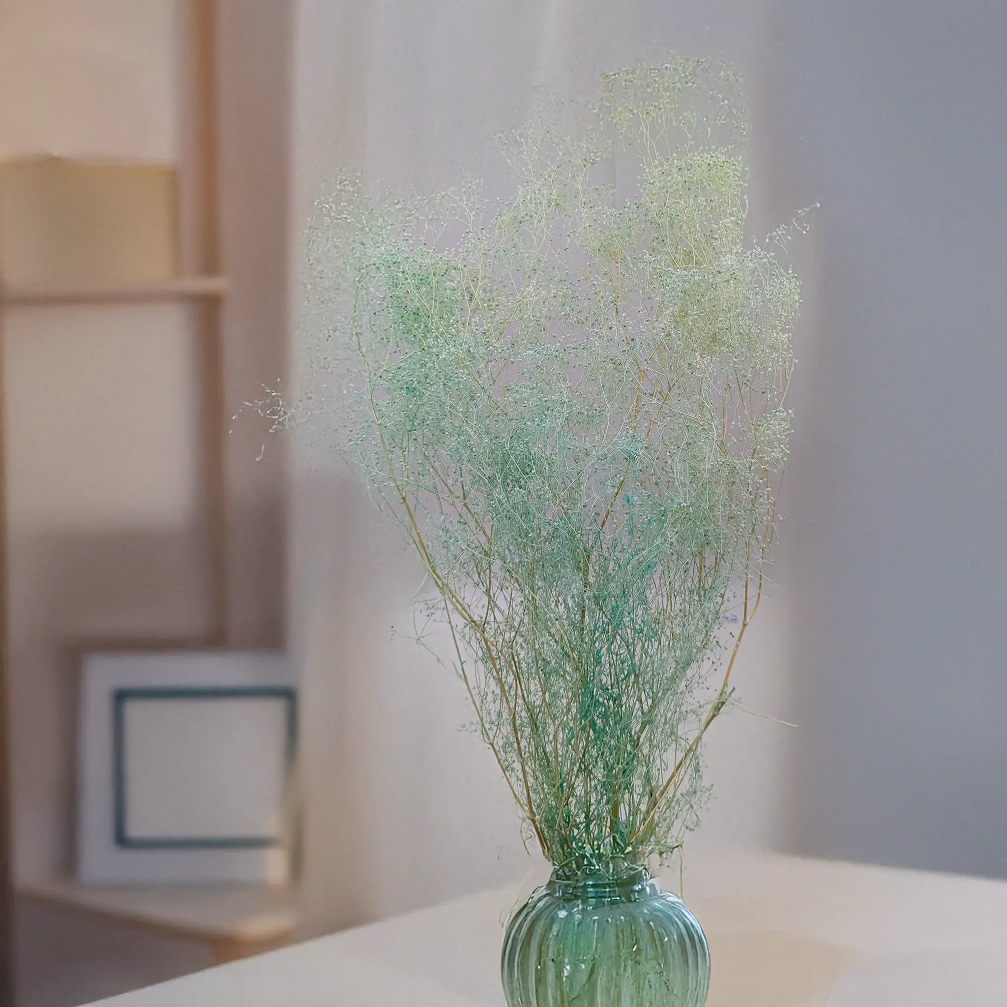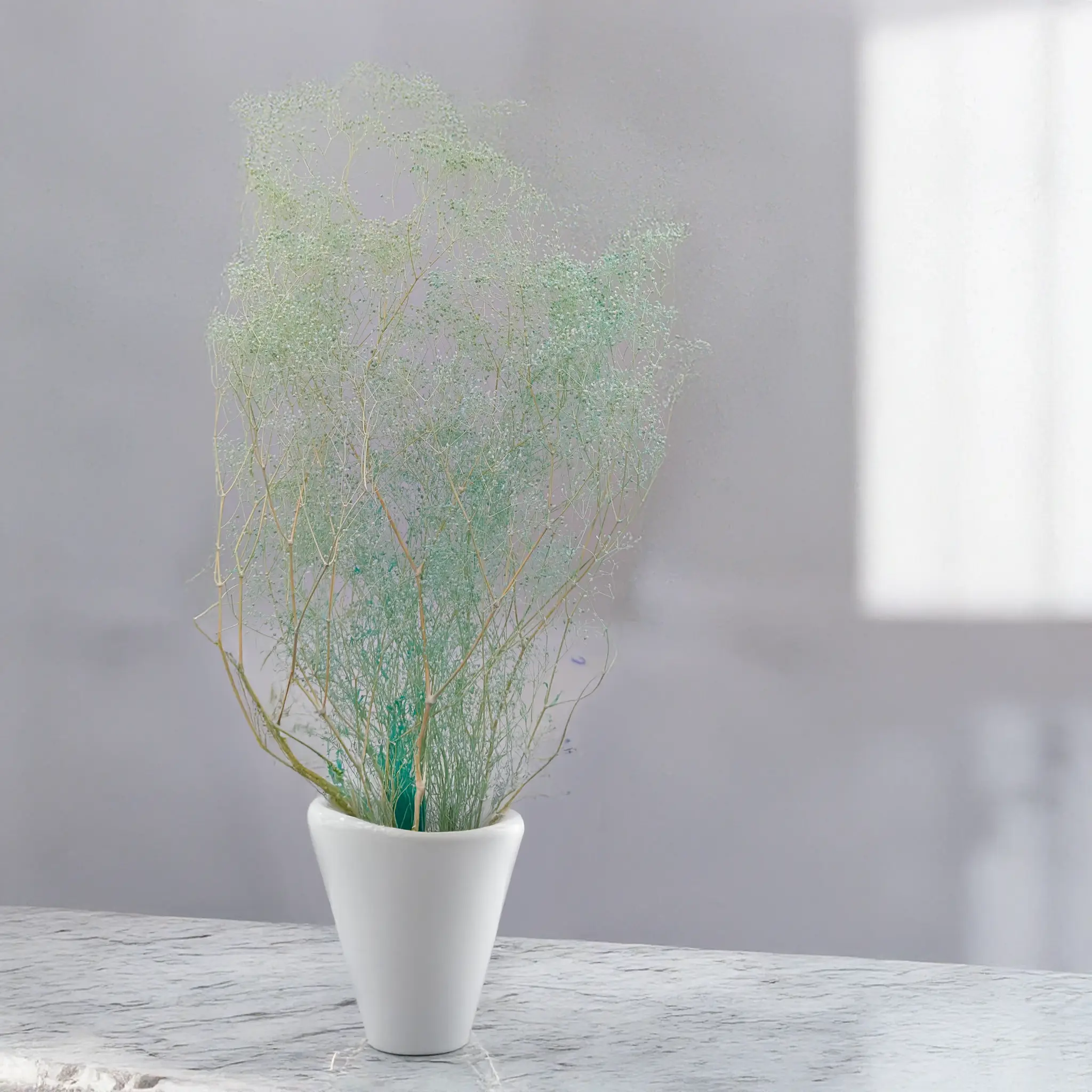 Miętowa gipsówka stabilizowana MINI to wyjątkowy element dekoracyjny, który przyciąga uwagę subtelną, pastelową barwą. Jej świeży, chłodny odcień wprowadza do wnętrz atmosferę spokoju i elegancji. Jest doskonałym dodatkiem do nowoczesnych i minimalistycznych kompozycji.