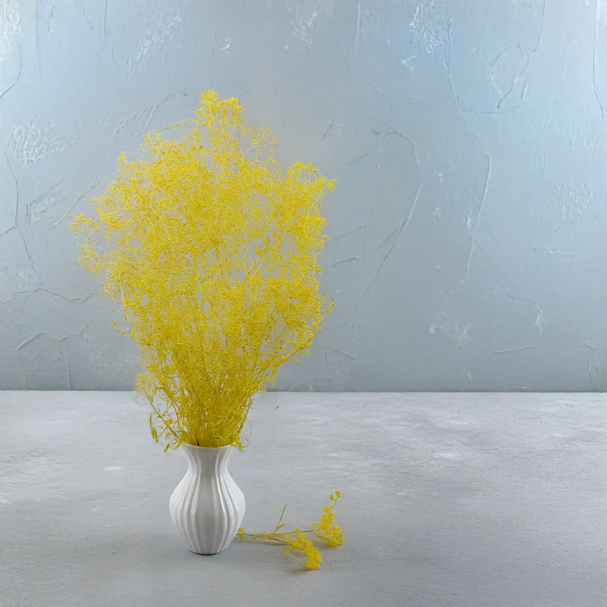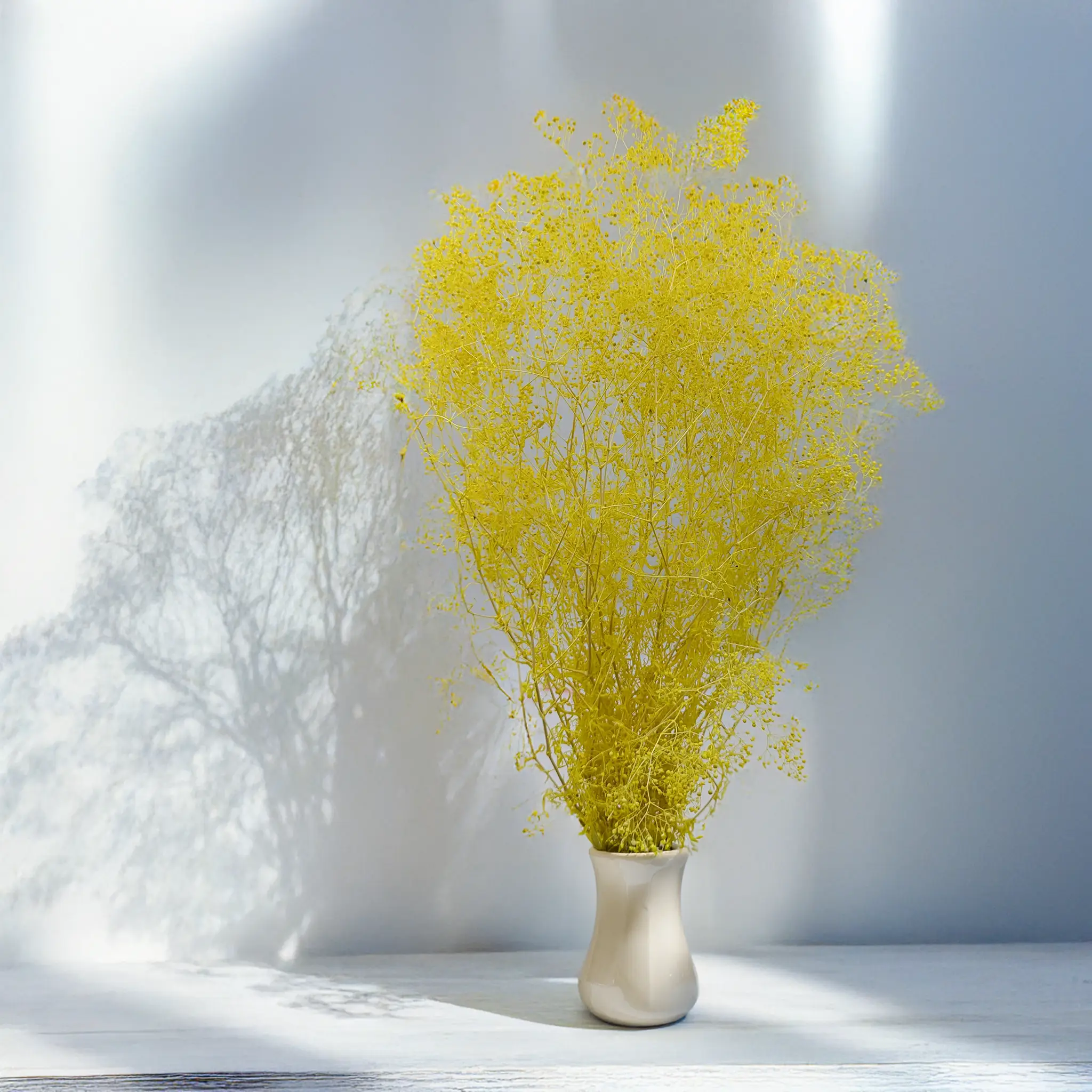 Gipsówka Stabilizowana MINI w kolorze żółtym to idealny wybór do wiosennych i letnich aranżacji. Jej drobne, jasnożółte kwiatuszki wprowadzają optymizm i delikatny urok do każdego wnętrza lub kompozycji.