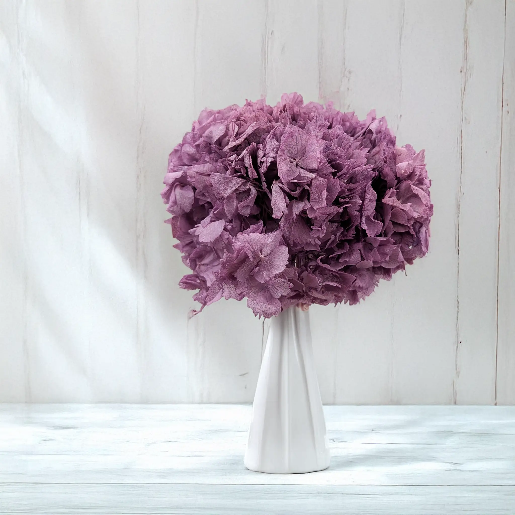 Fioletowa hortensja stabilizowana to wyjątkowa propozycja dla miłośników eleganckich, głębokich barw i subtelnej formy. Jej intensywny odcień doskonale podkreśla styl romantyczny, glamour i boho, a puszysta, wielowymiarowa struktura sprawia, że prezentuje się niezwykle efektownie w aranżacjach ślubnych i okolicznościowych.