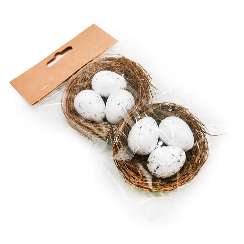 W każdym gniazdku znajdują się 3 jajka styropianowe, białe nakrapiane.