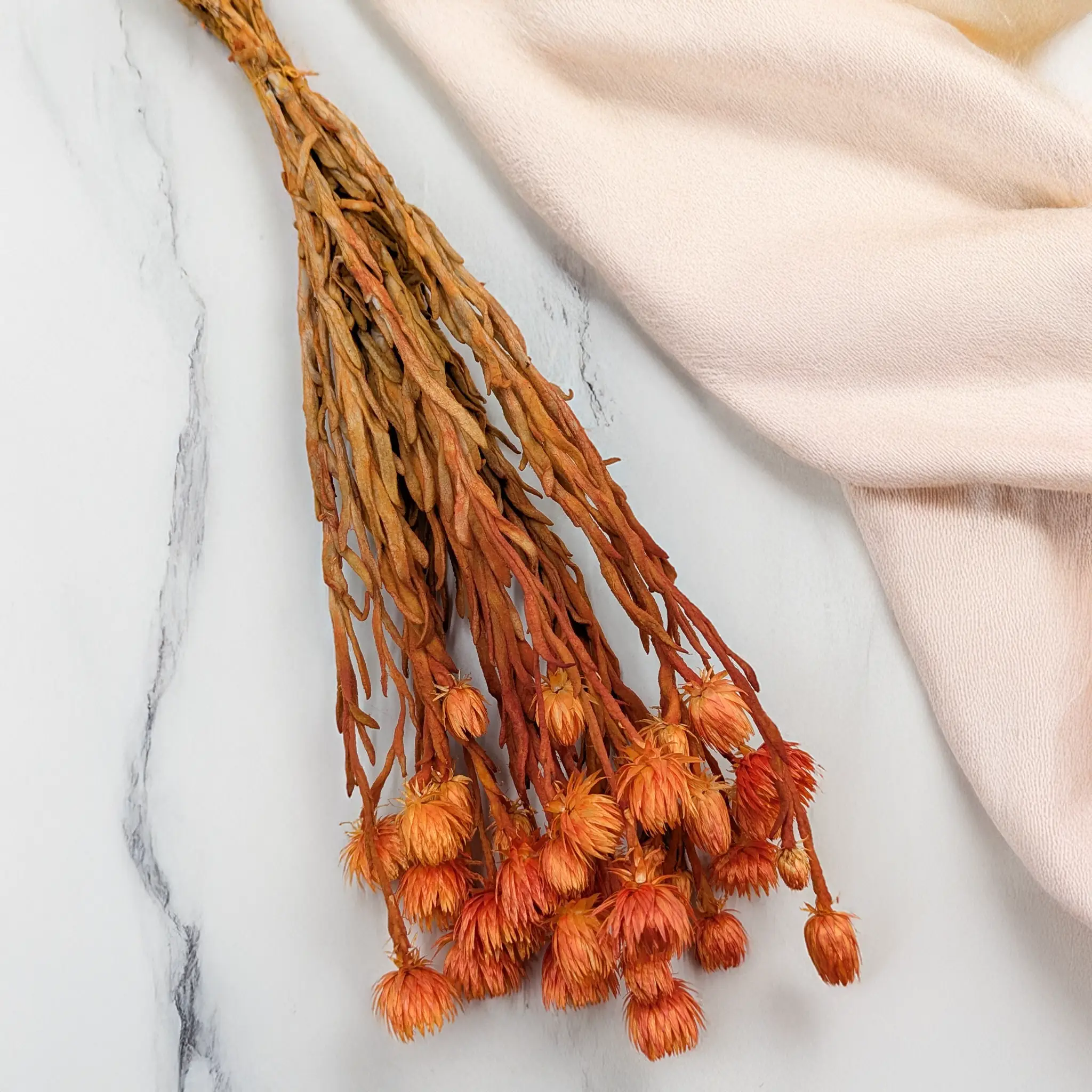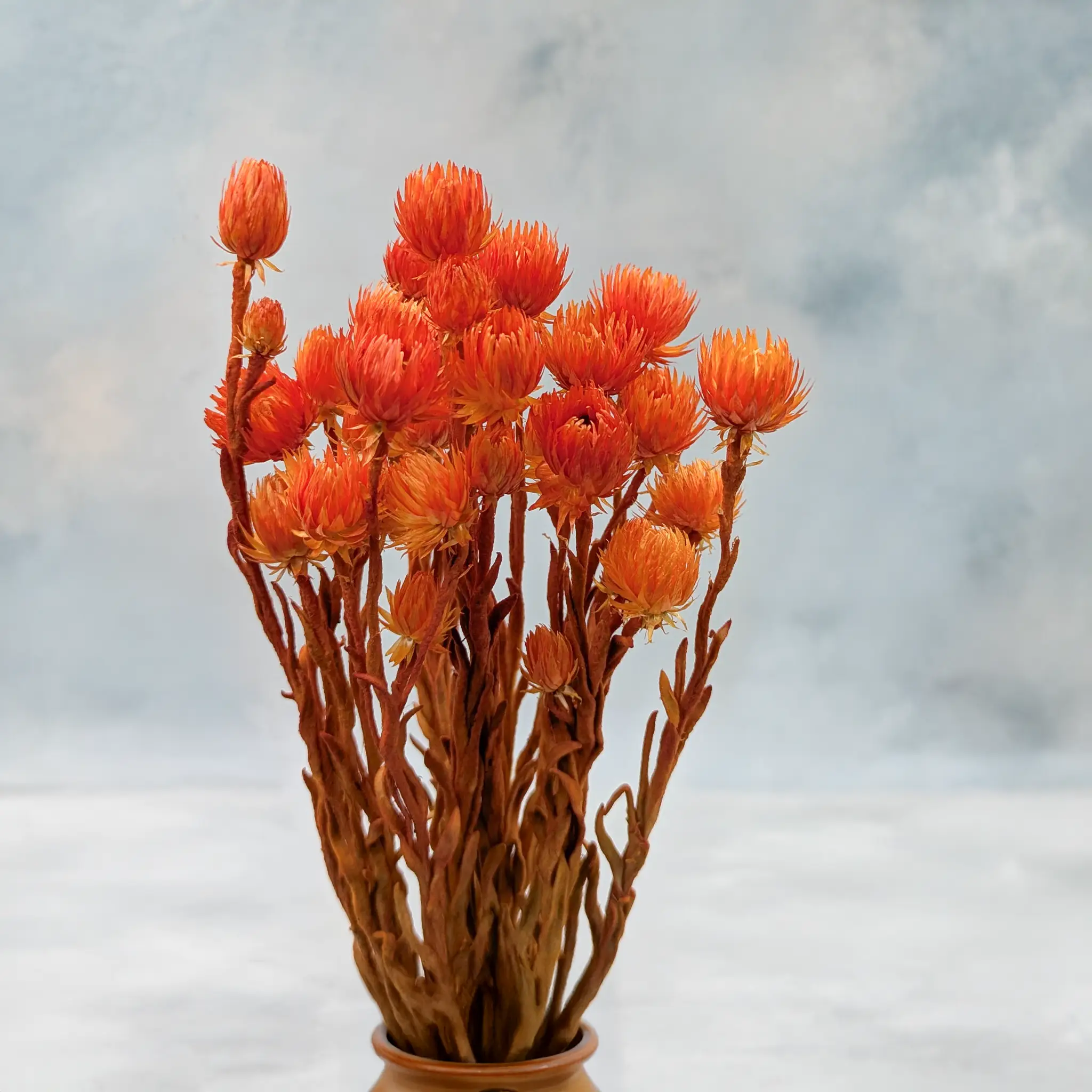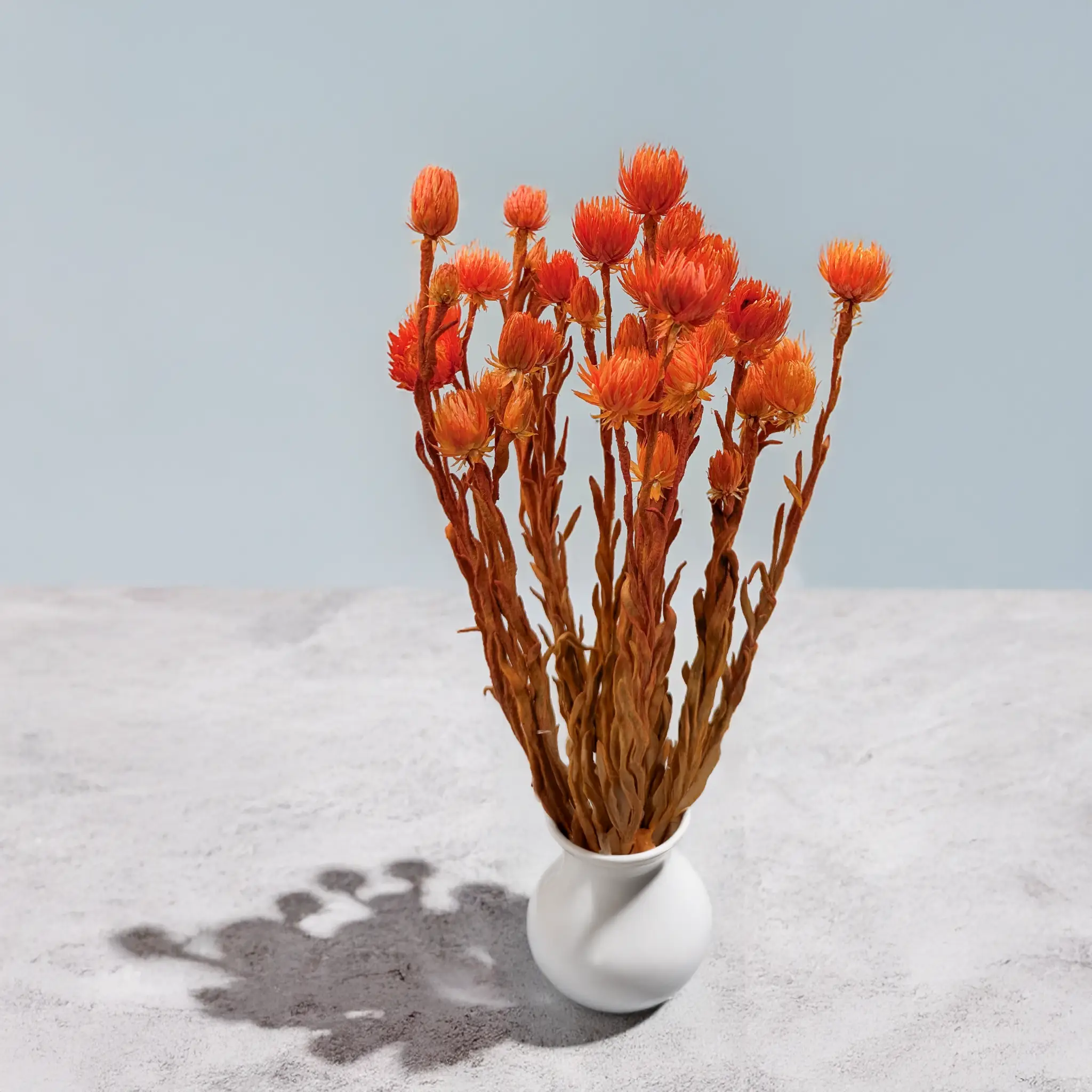 Kaaps Flower w kolorze pomarańczowym to wyjątkowy suszony kwiat o intensywnej barwie, która wprowadza do aranżacji ciepło i energię. Pomarańczowe płatki tworzą mocny akcent dekoracyjny, dzięki czemu doskonale sprawdzają się zarówno w aranżacjach letnich, jak i jesiennych. To kwiat, który przyciąga uwagę i dodaje kompozycjom charakteru.