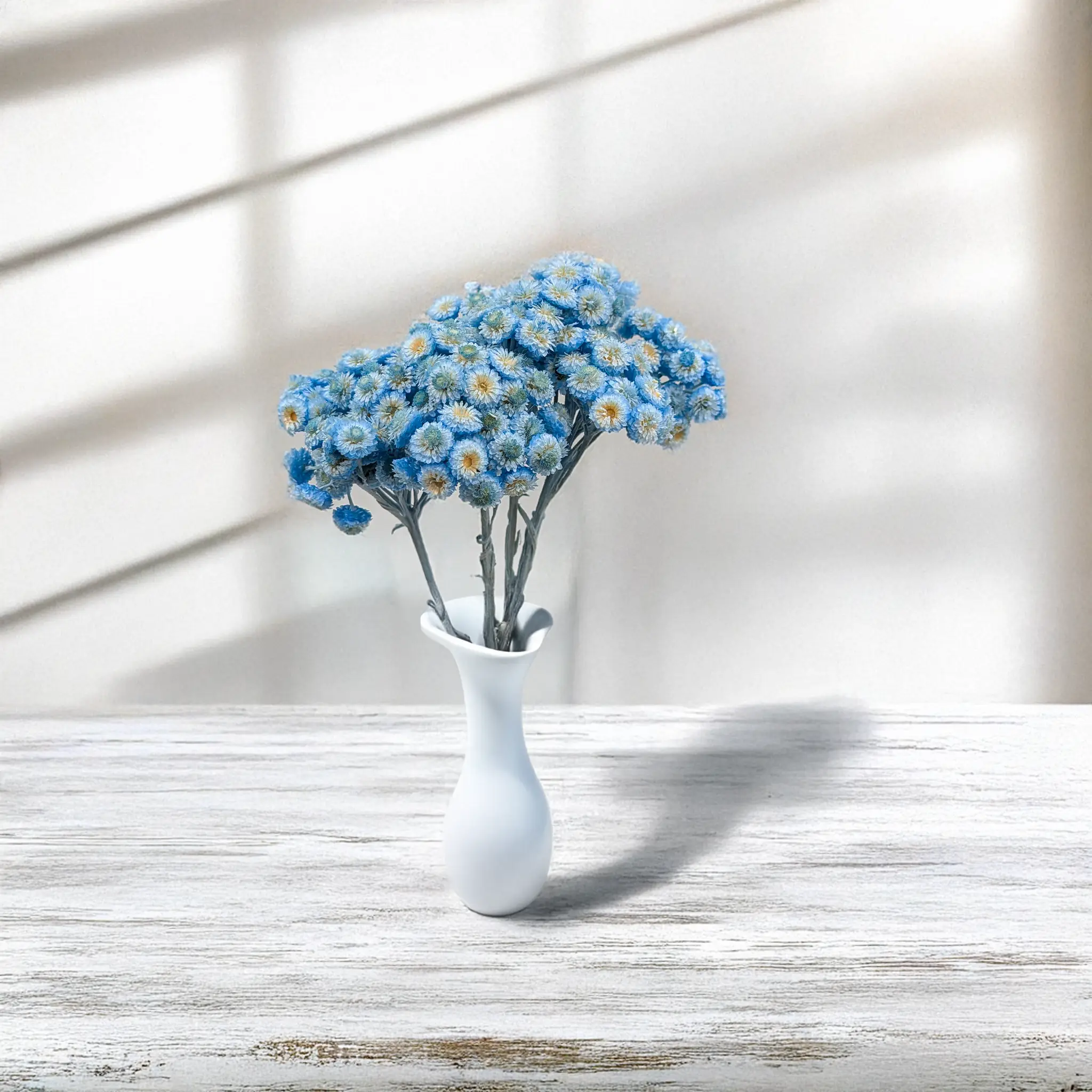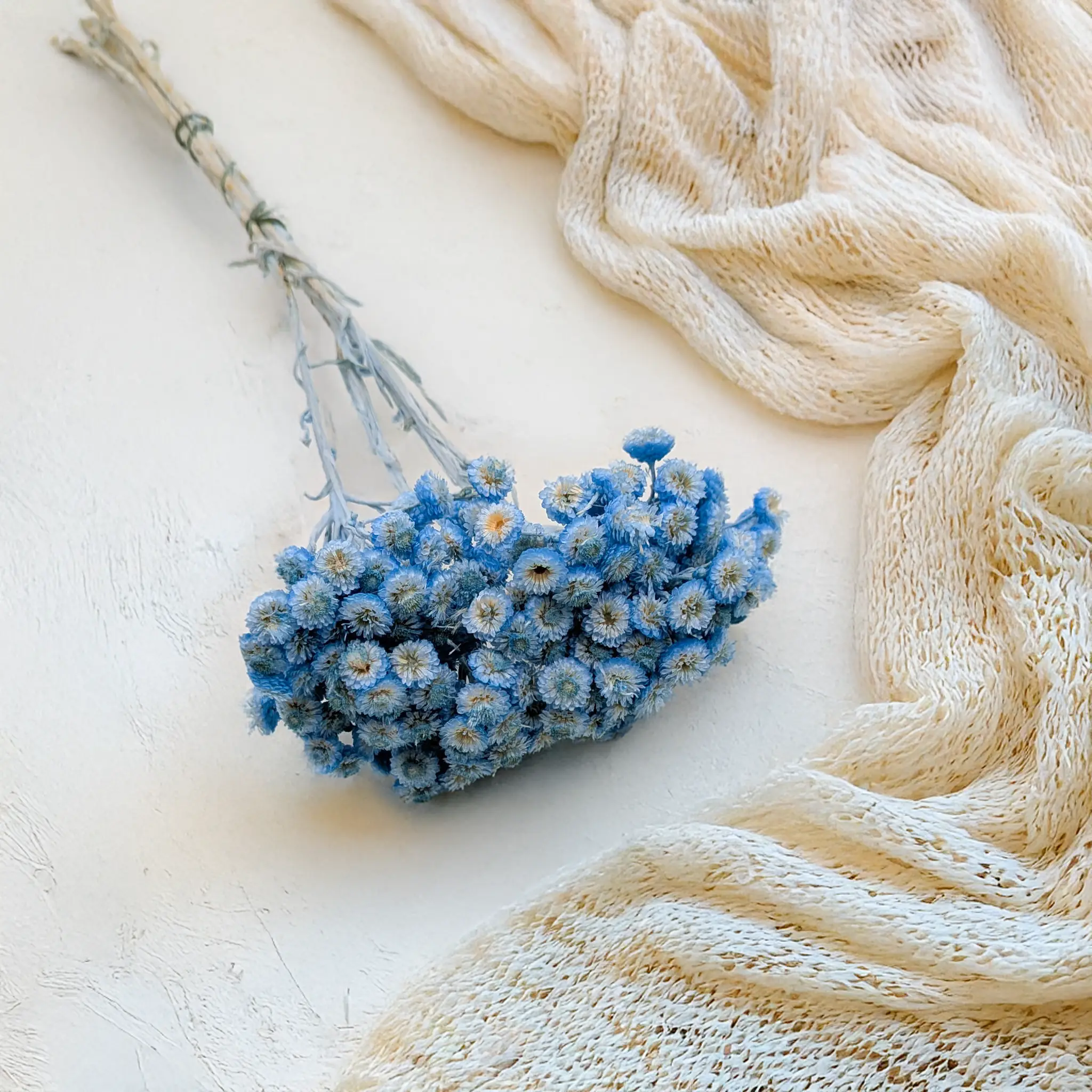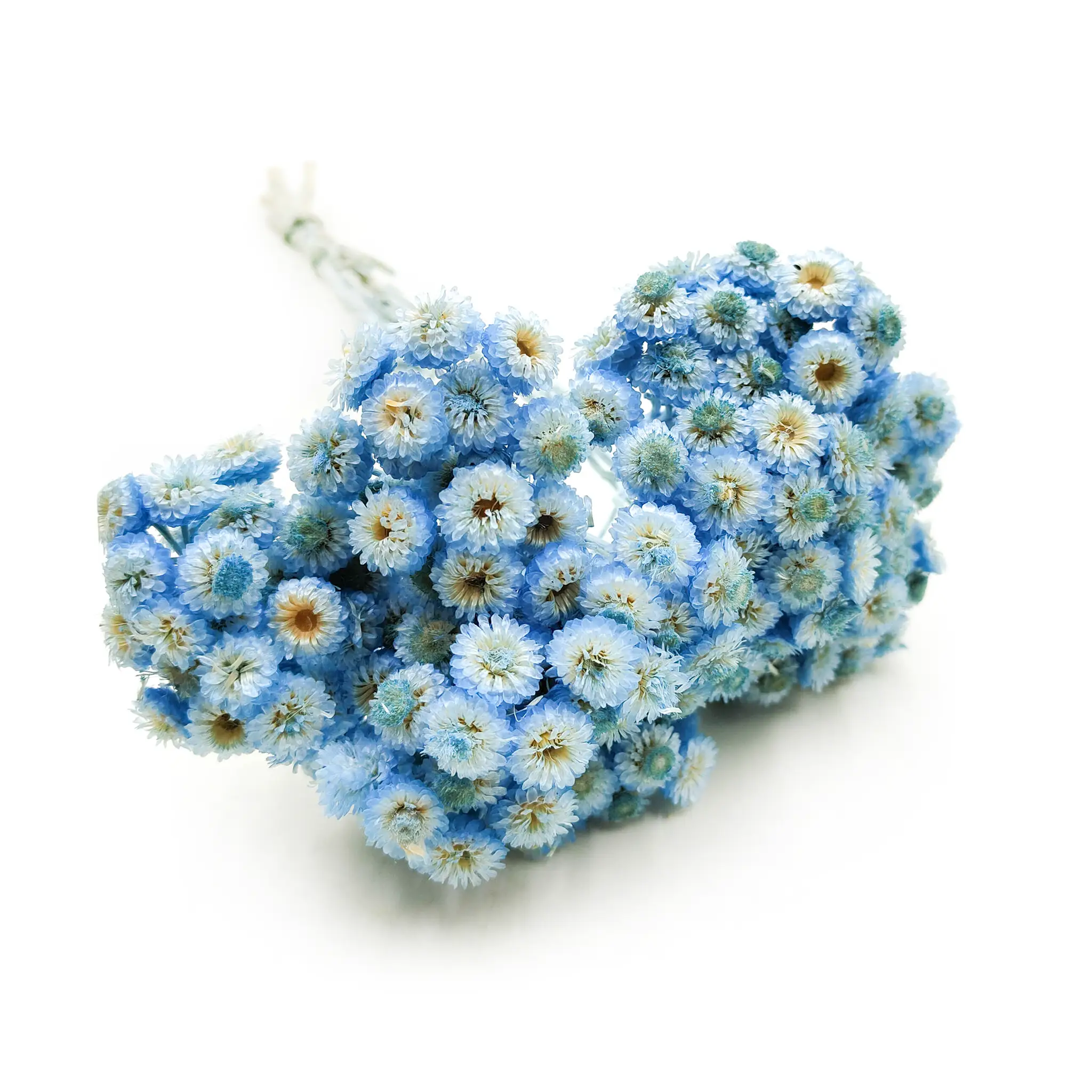 Kocanka włoska suszona w intensywnie niebieskim odcieniu to dekoracyjna roślina o wyjątkowym charakterze. Jej małe, zwarte kwiatostany i delikatne, srebrzyste listki wprowadzają elegancję, świeżość i oryginalność do każdego projektu florystycznego.