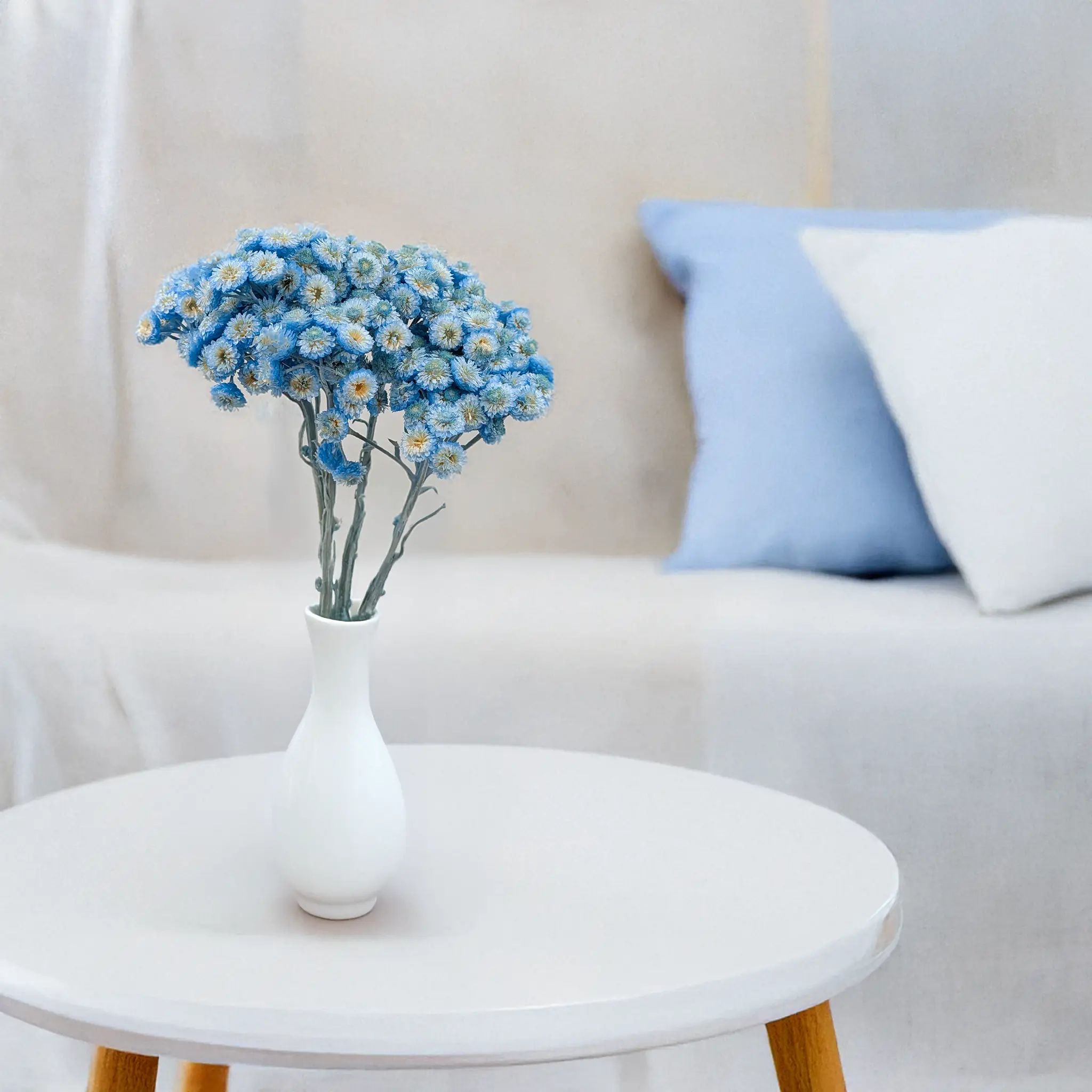 Niebieski symbolizuje spokój, kreatywność i zaufanie, dlatego kocanka w tej barwie doskonale sprawdza się w ślubnych dekoracjach, naturalnych aranżacjach boho oraz kompozycjach DIY. Jest niezwykle trwała i świetnie łączy się z bielą, różem, zielenią czy kolorem słomkowym.