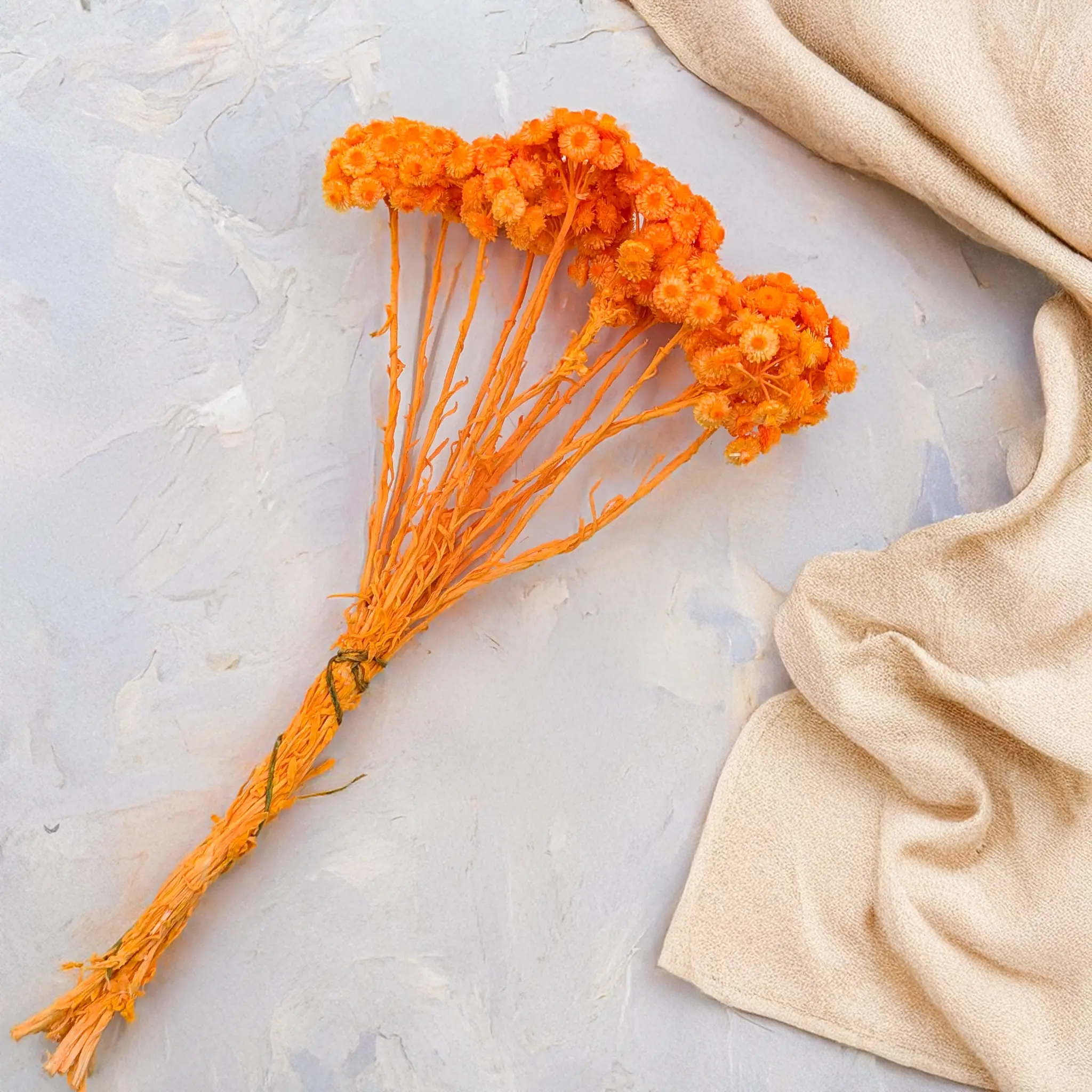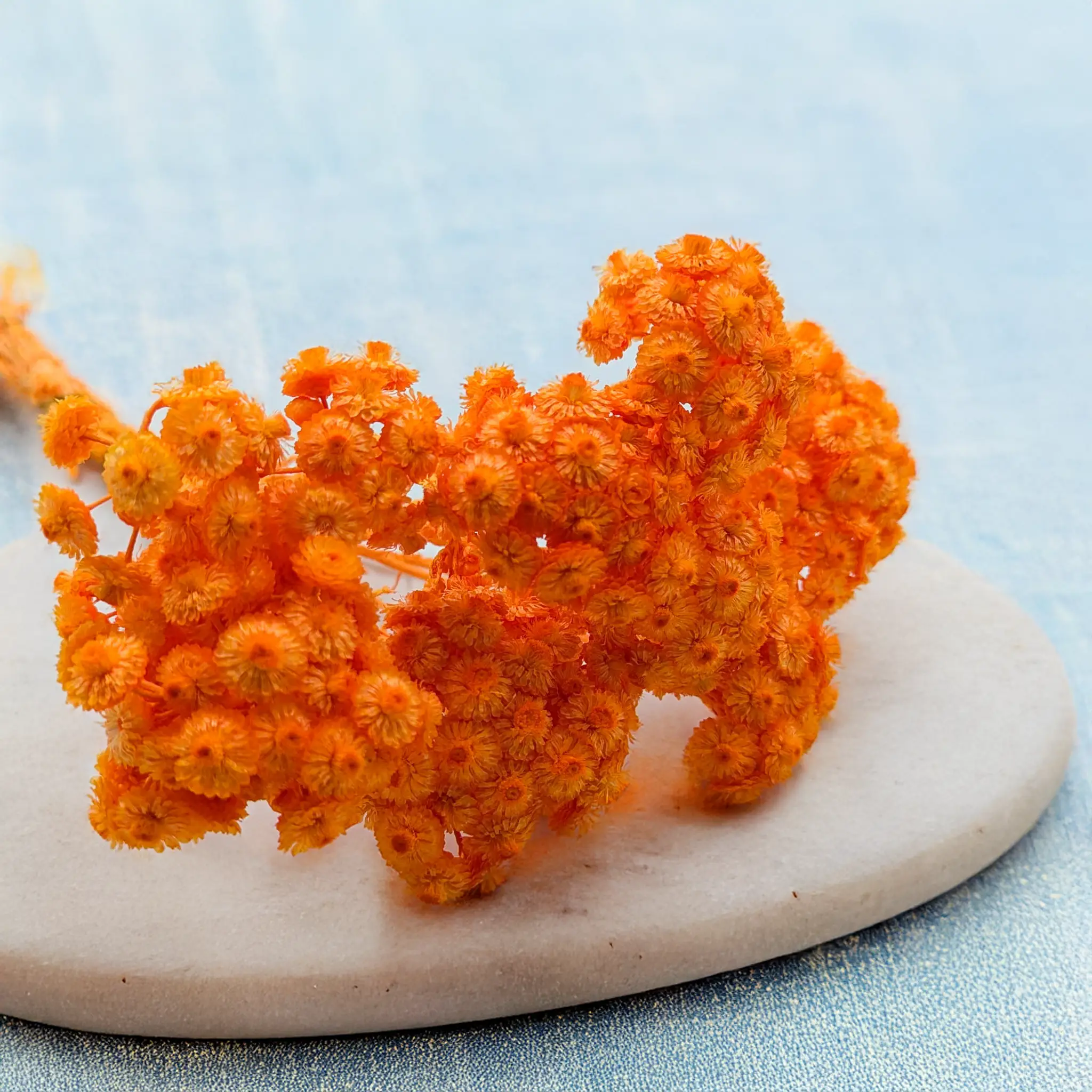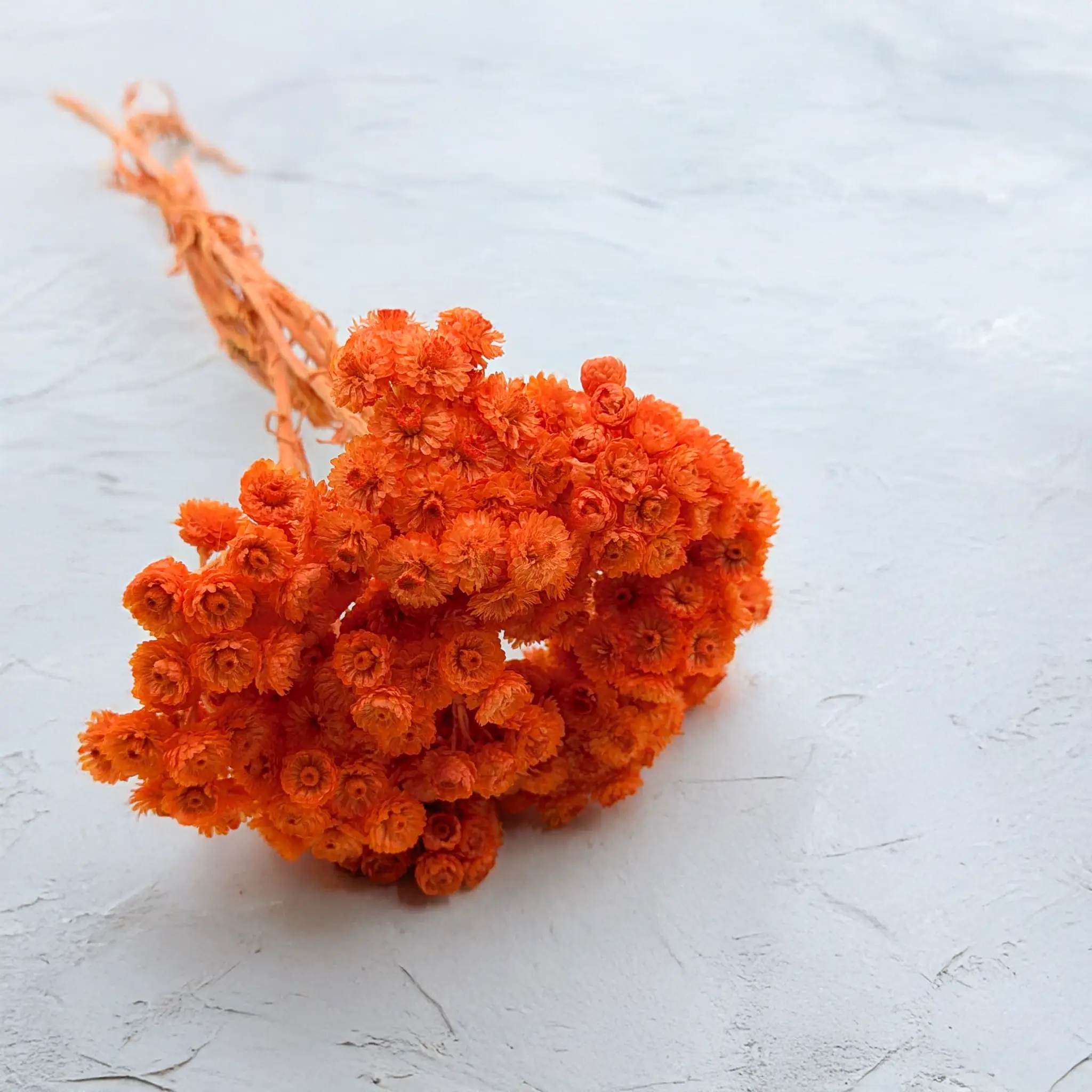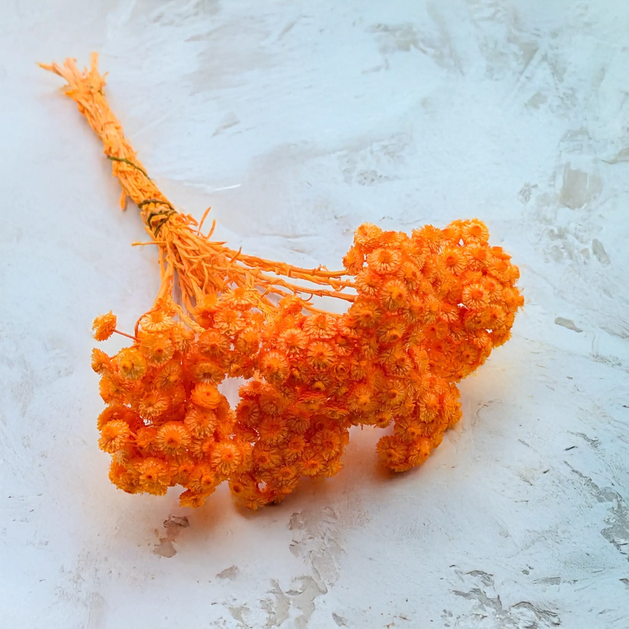 Suszona kocanka włoska (Helichrysum italicum) w intensywnym odcieniu pomarańczowym to energetyczny akcent dekoracyjny, który wprowadza radość, ciepło i optymizm do każdej przestrzeni. Barwione na soczysty kolor kwiaty zachowują swoją charakterystyczną strukturę – są suche, sztywne i trwałe, dzięki czemu świetnie sprawdzają się w kompozycjach, które mają przyciągać uwagę i utrzymywać swój wygląd przez długi czas.