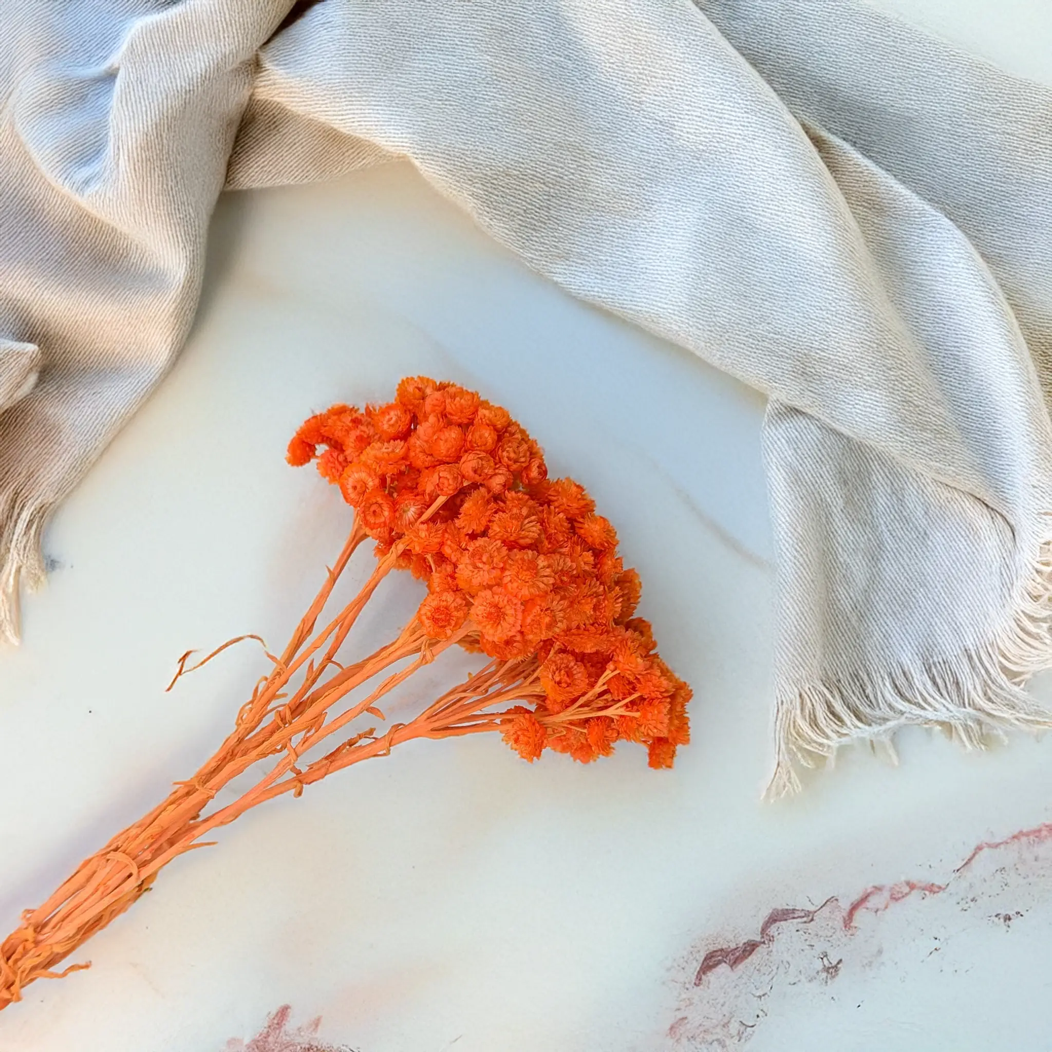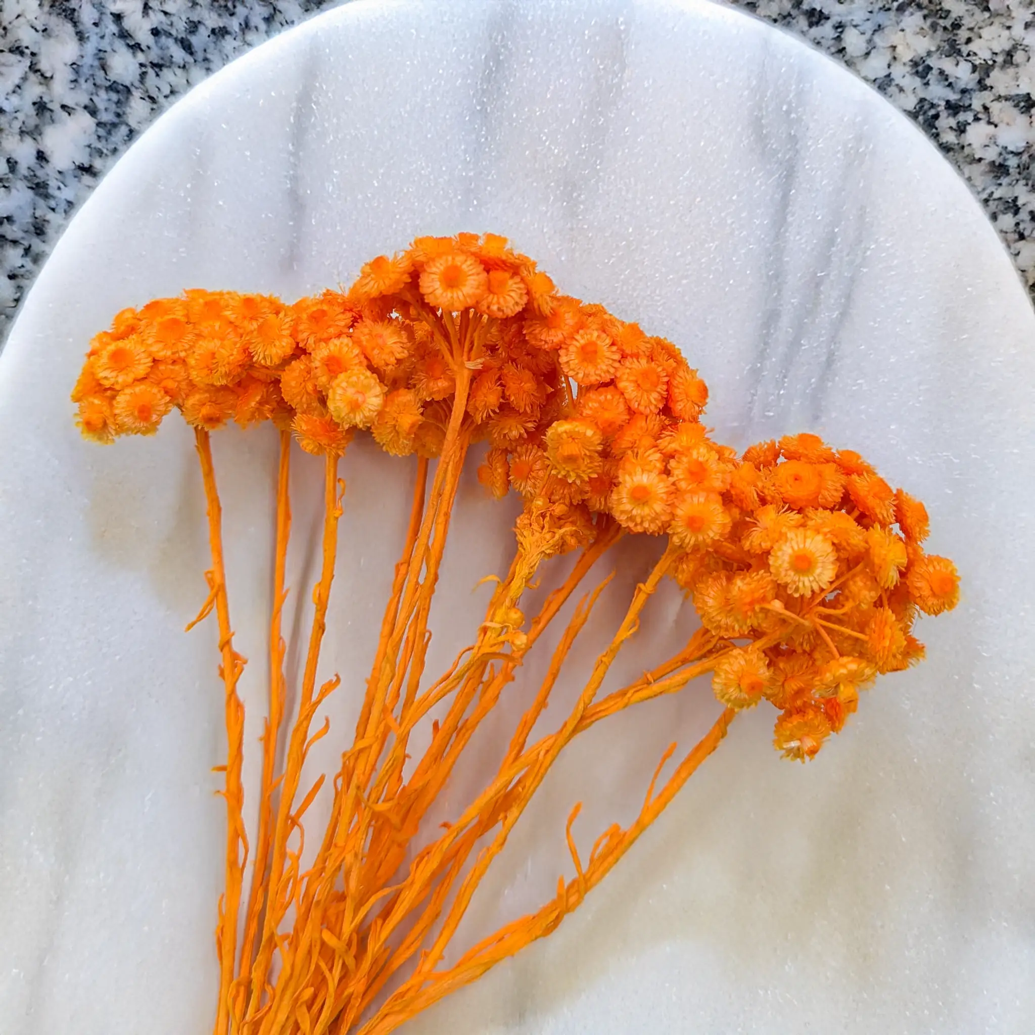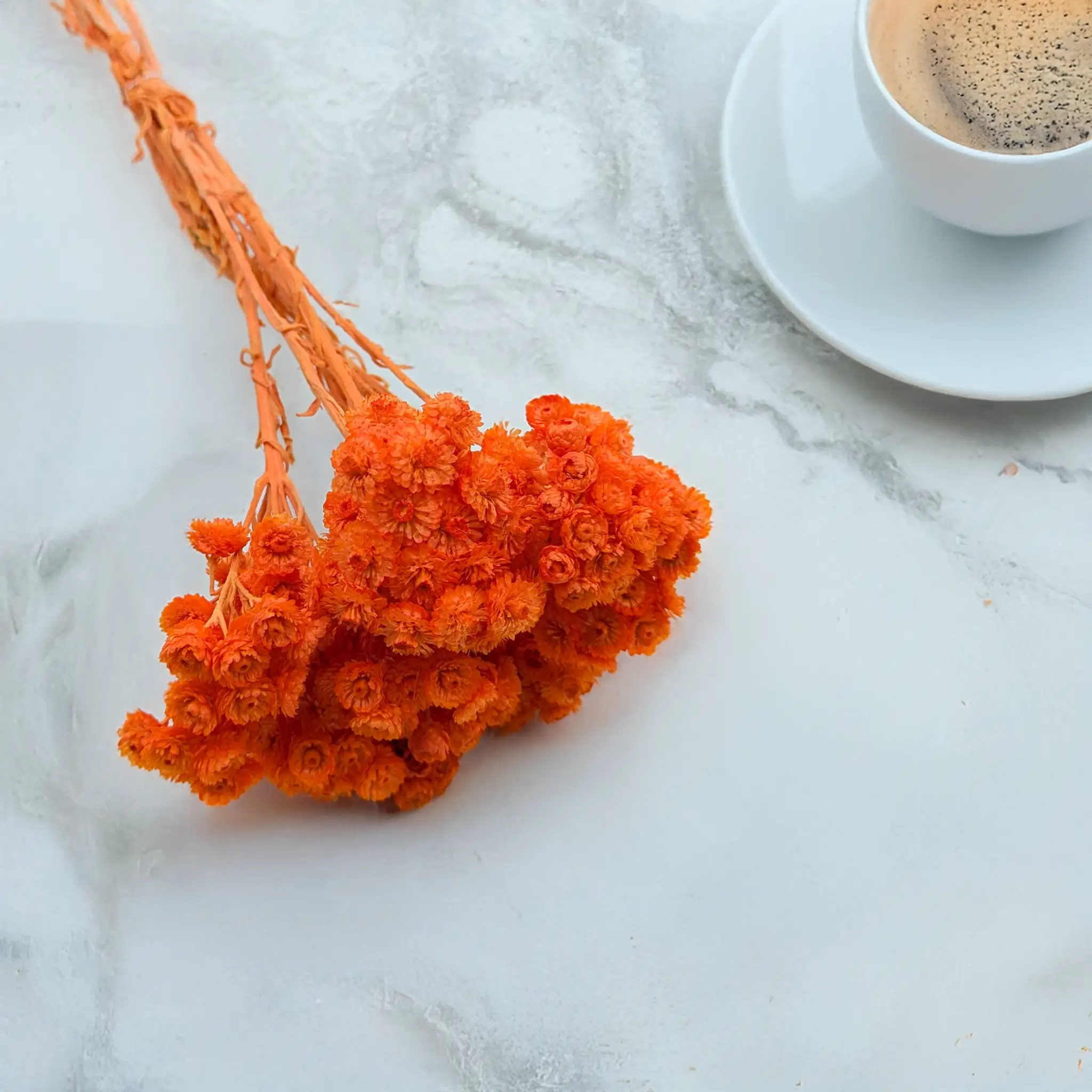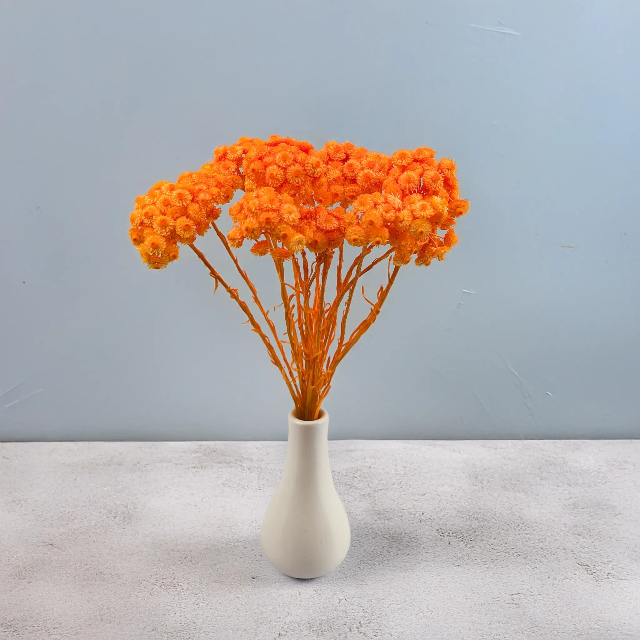 Suszona kocanka włoska (Helichrysum italicum) w intensywnym odcieniu pomarańczowym to energetyczny akcent dekoracyjny, który wprowadza radość, ciepło i optymizm do każdej przestrzeni. Barwione na soczysty kolor kwiaty zachowują swoją charakterystyczną strukturę – są suche, sztywne i trwałe, dzięki czemu świetnie sprawdzają się w kompozycjach, które mają przyciągać uwagę i utrzymywać swój wygląd przez długi czas.