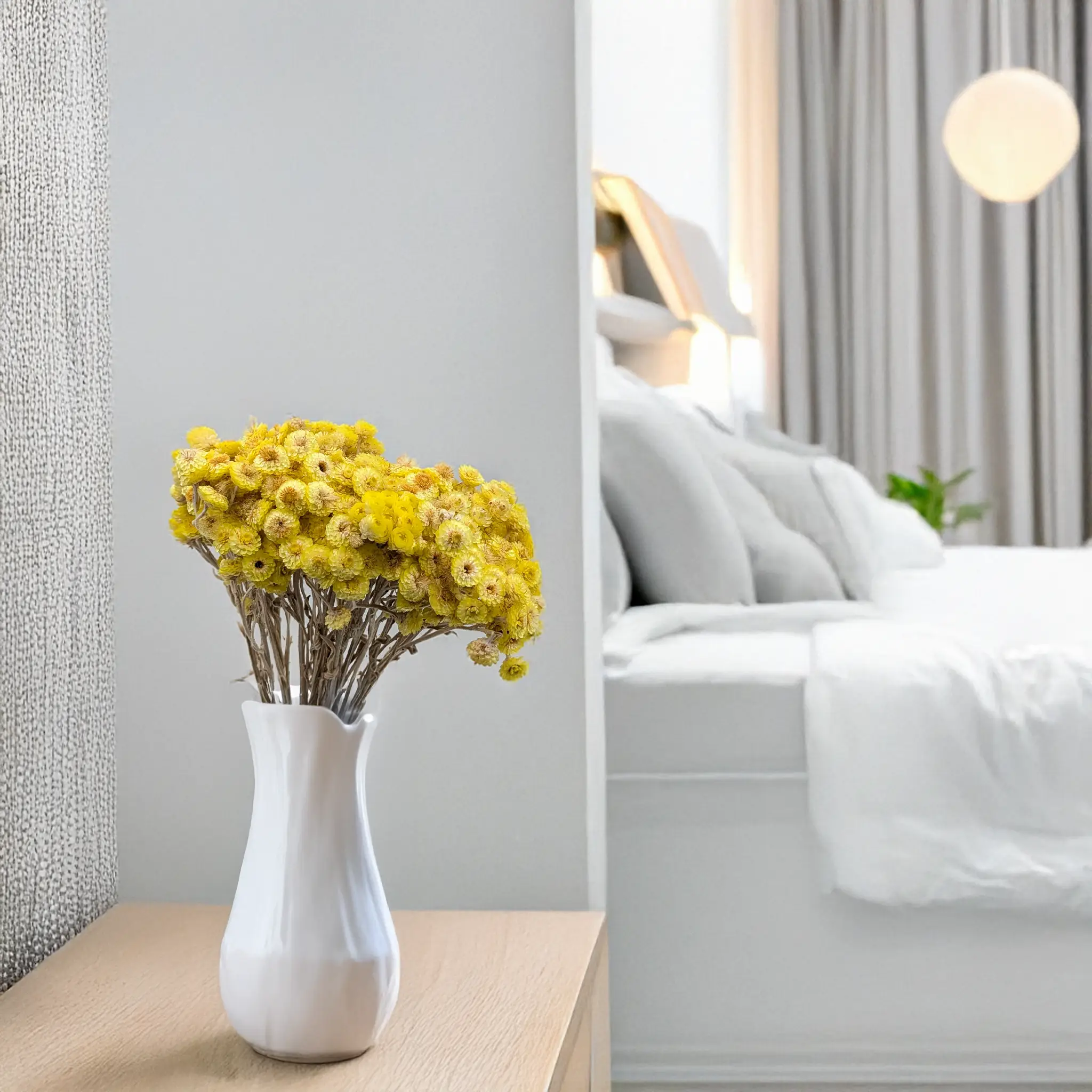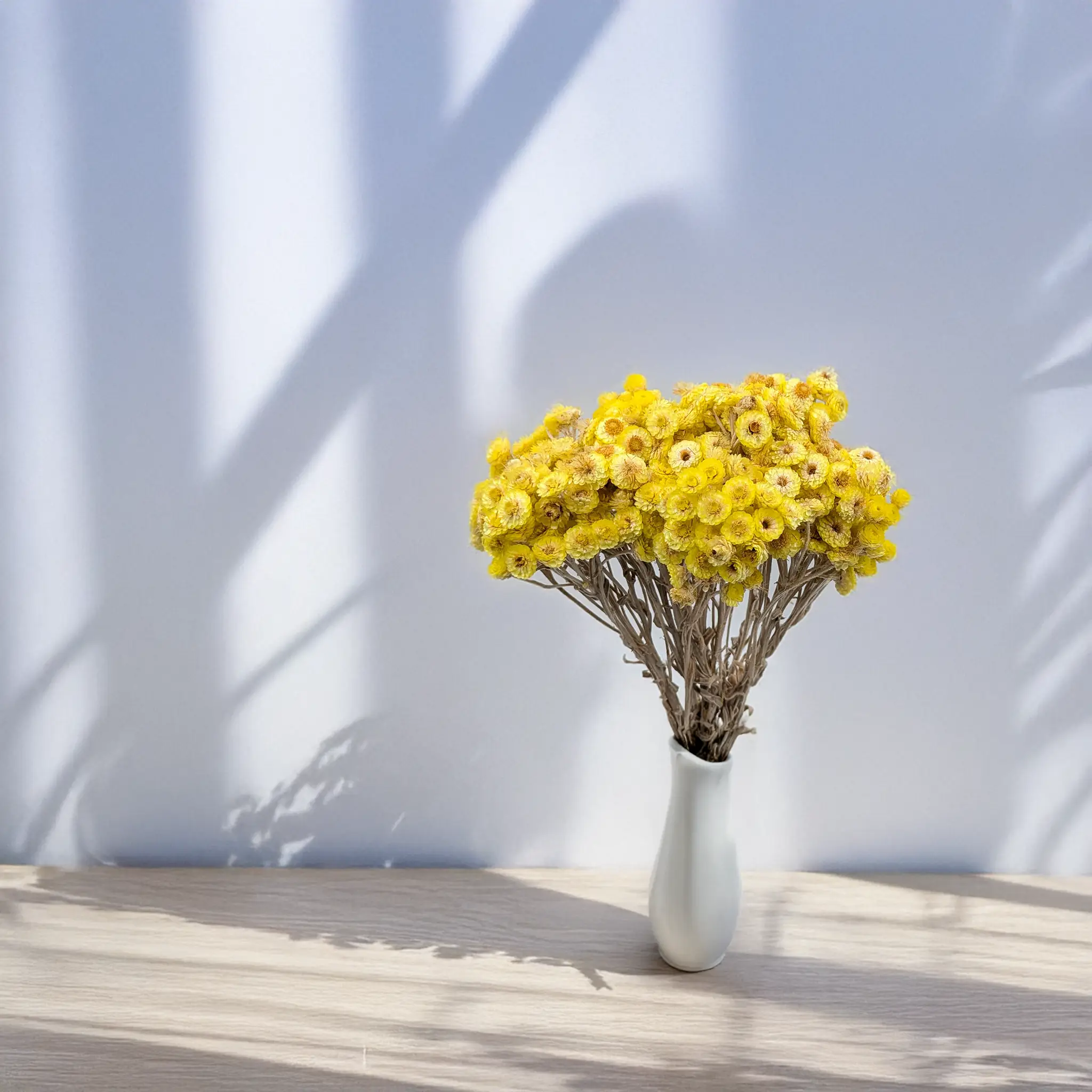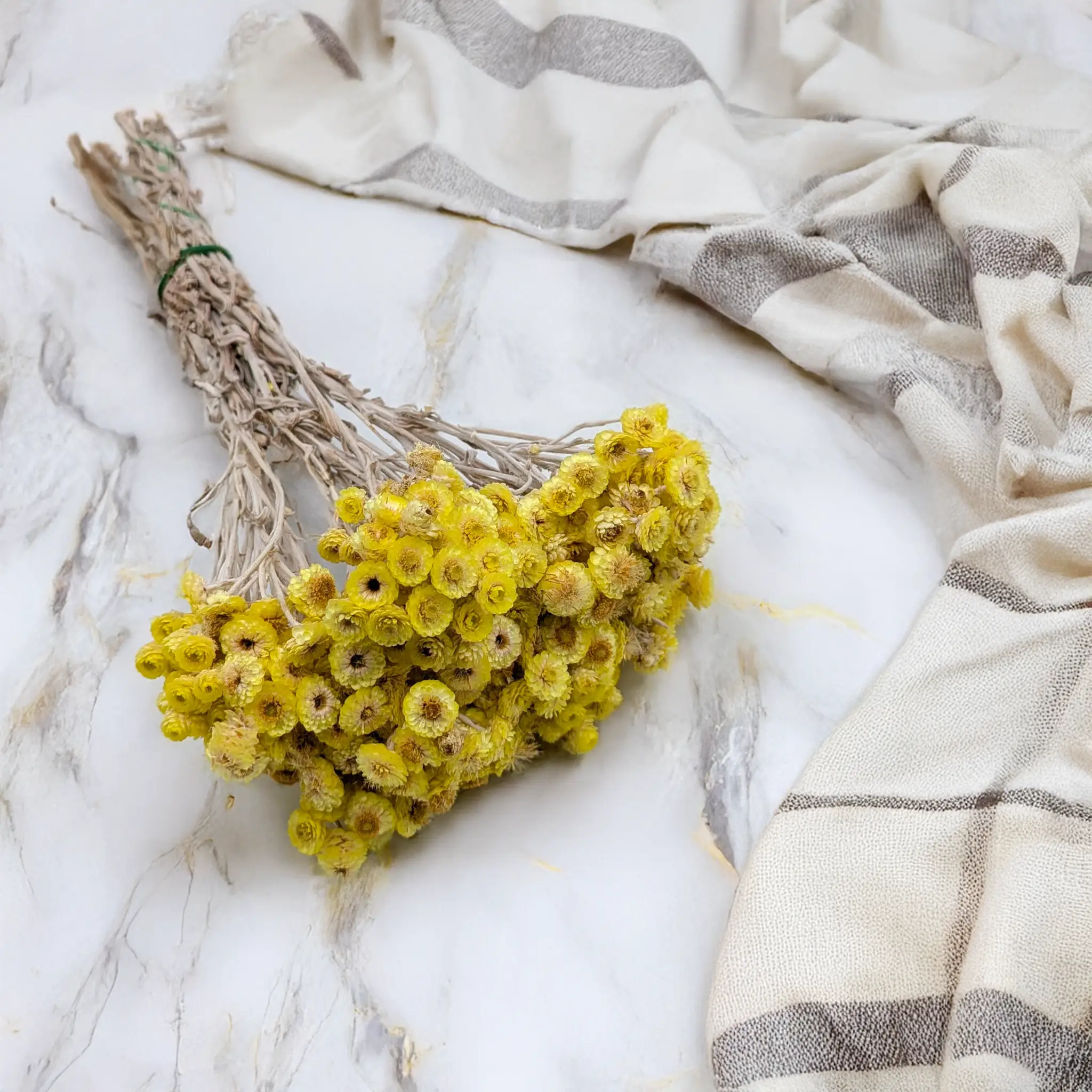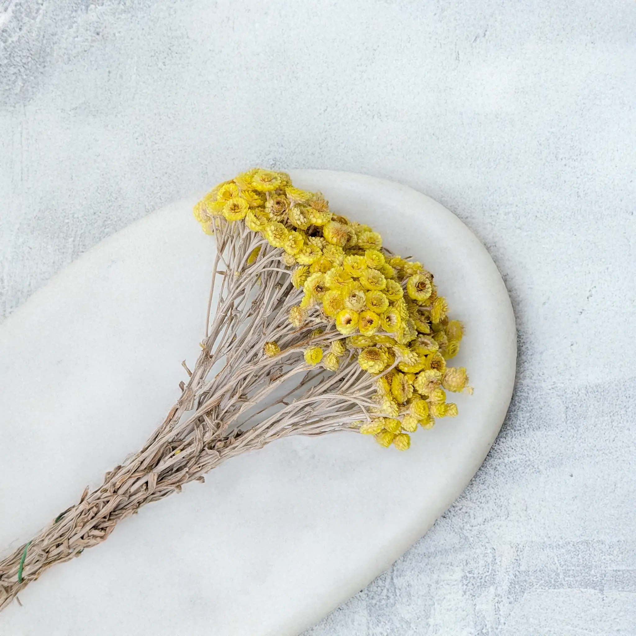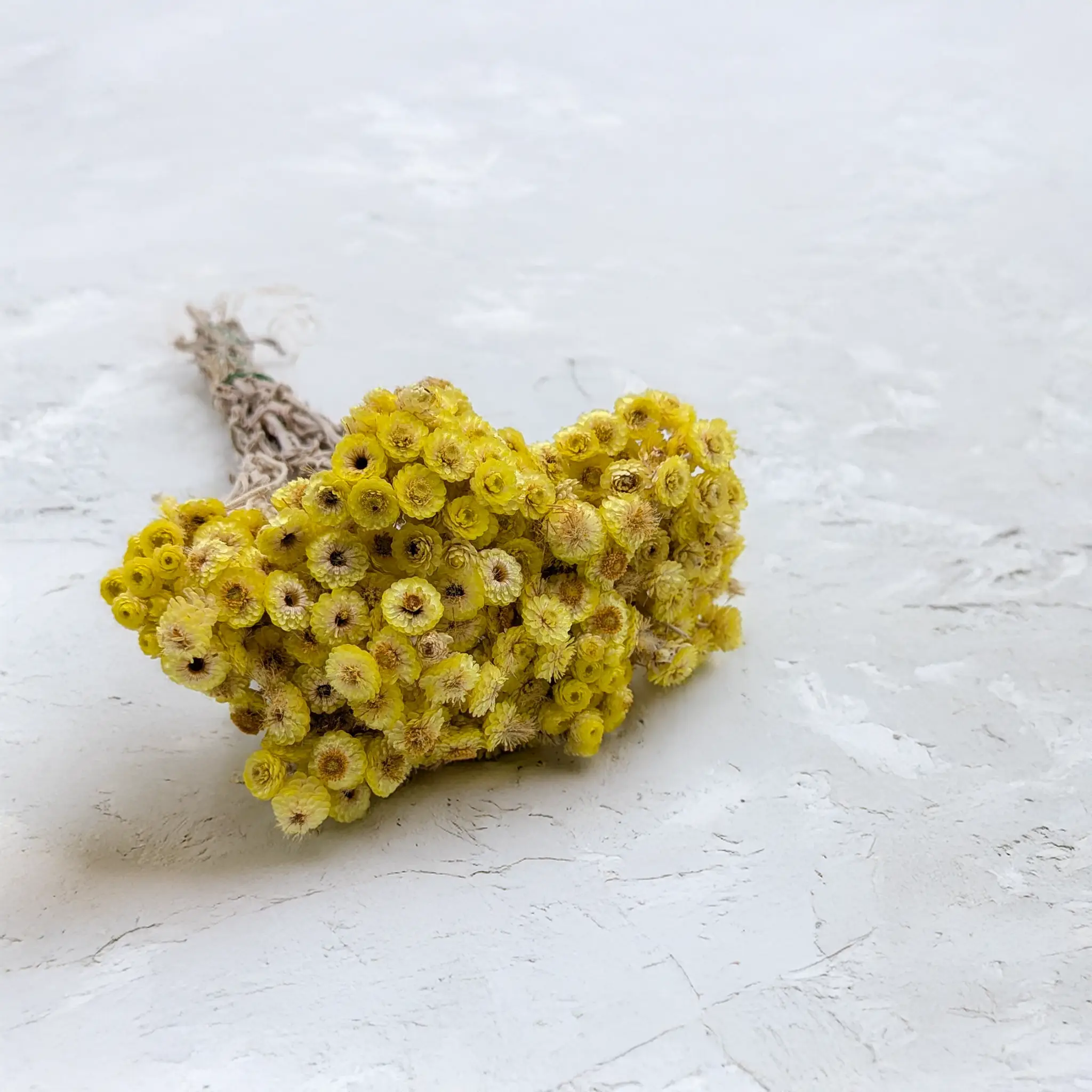 Kolor żółty symbolizuje radość, optymizm i trwałość, co czyni kocankę włoską doskonałym wyborem na dekoracje o pozytywnym wydźwięku. Idealnie komponuje się z innymi naturalnymi suszami – gipsówką, phalarisem, lagurusem, glixią – tworząc kompozycje o naturalnym, rustykalnym i boho stylu.