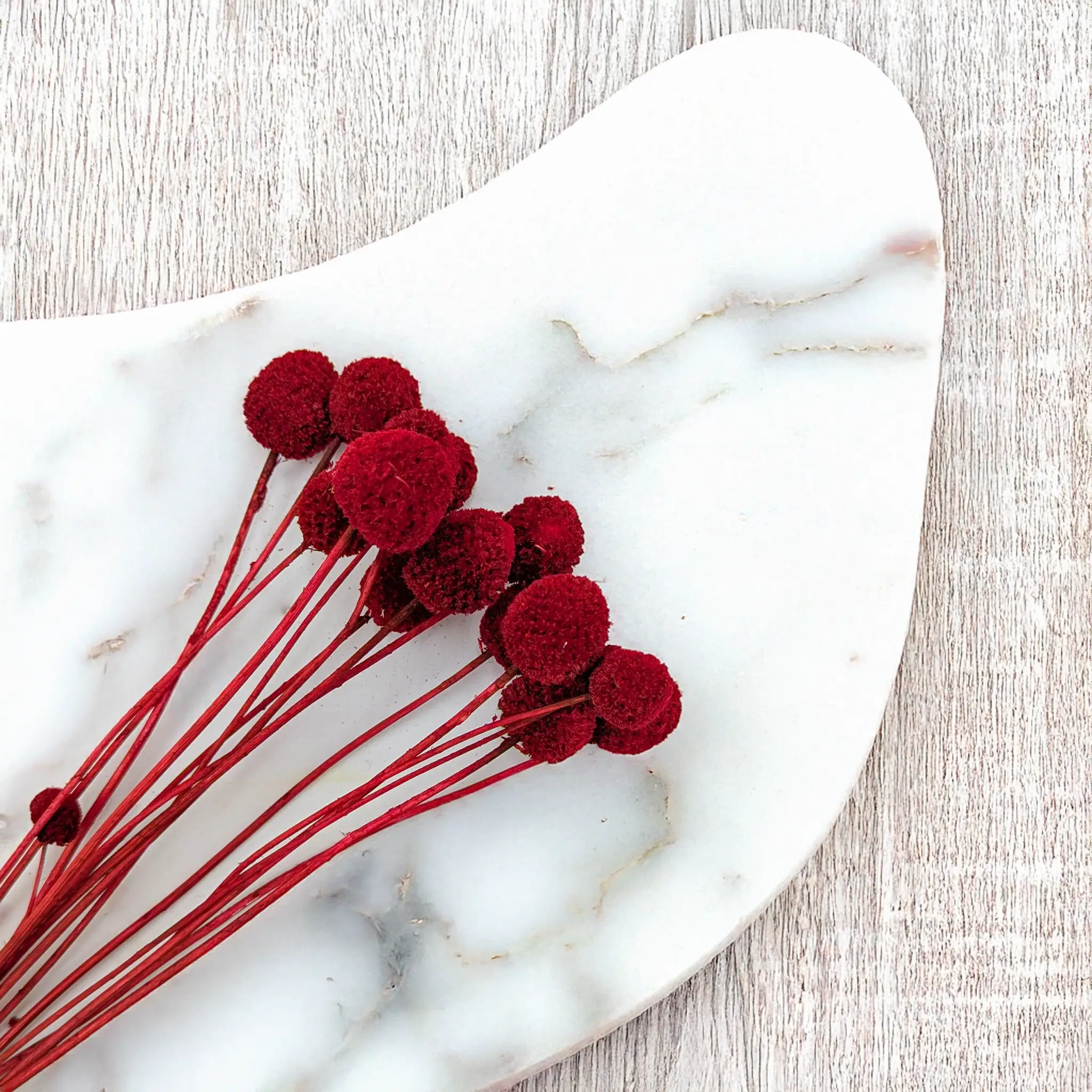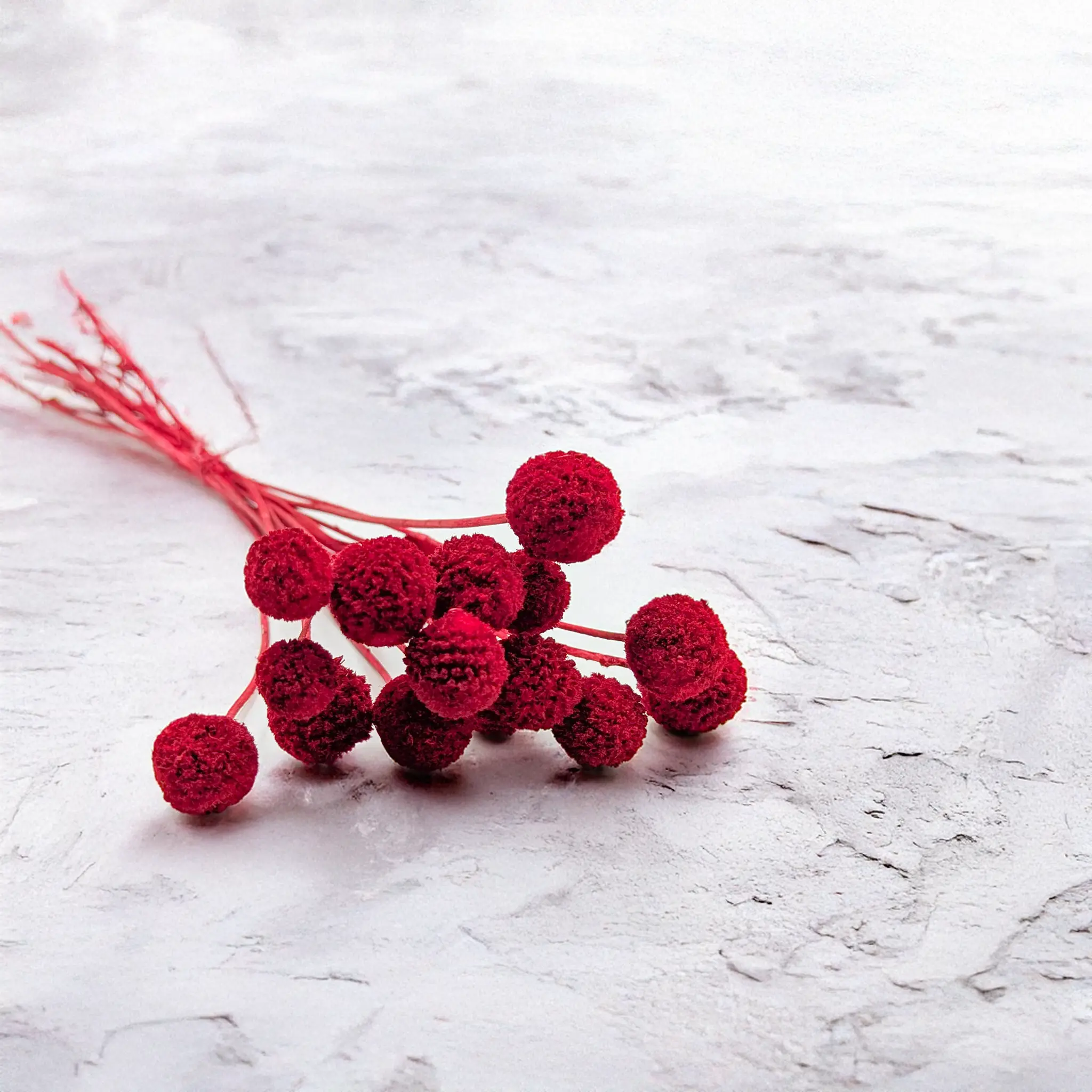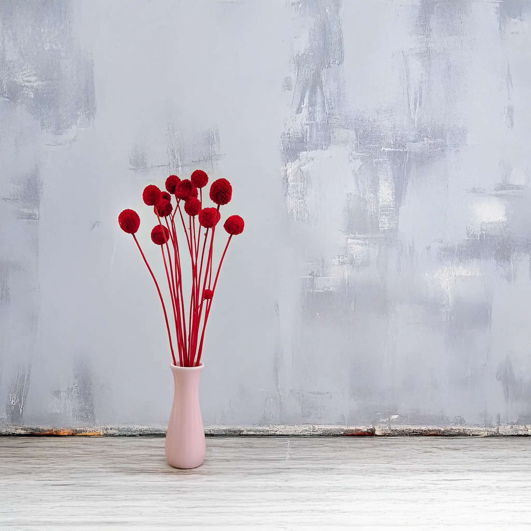 Czerwień symbolizuje energię, namiętność, siłę i odwagę. Wprowadza dynamikę i wyrazistość do przestrzeni, dlatego suszona kraspedia w tej barwie idealnie sprawdzi się w kompozycjach wymagających mocnego akcentu.