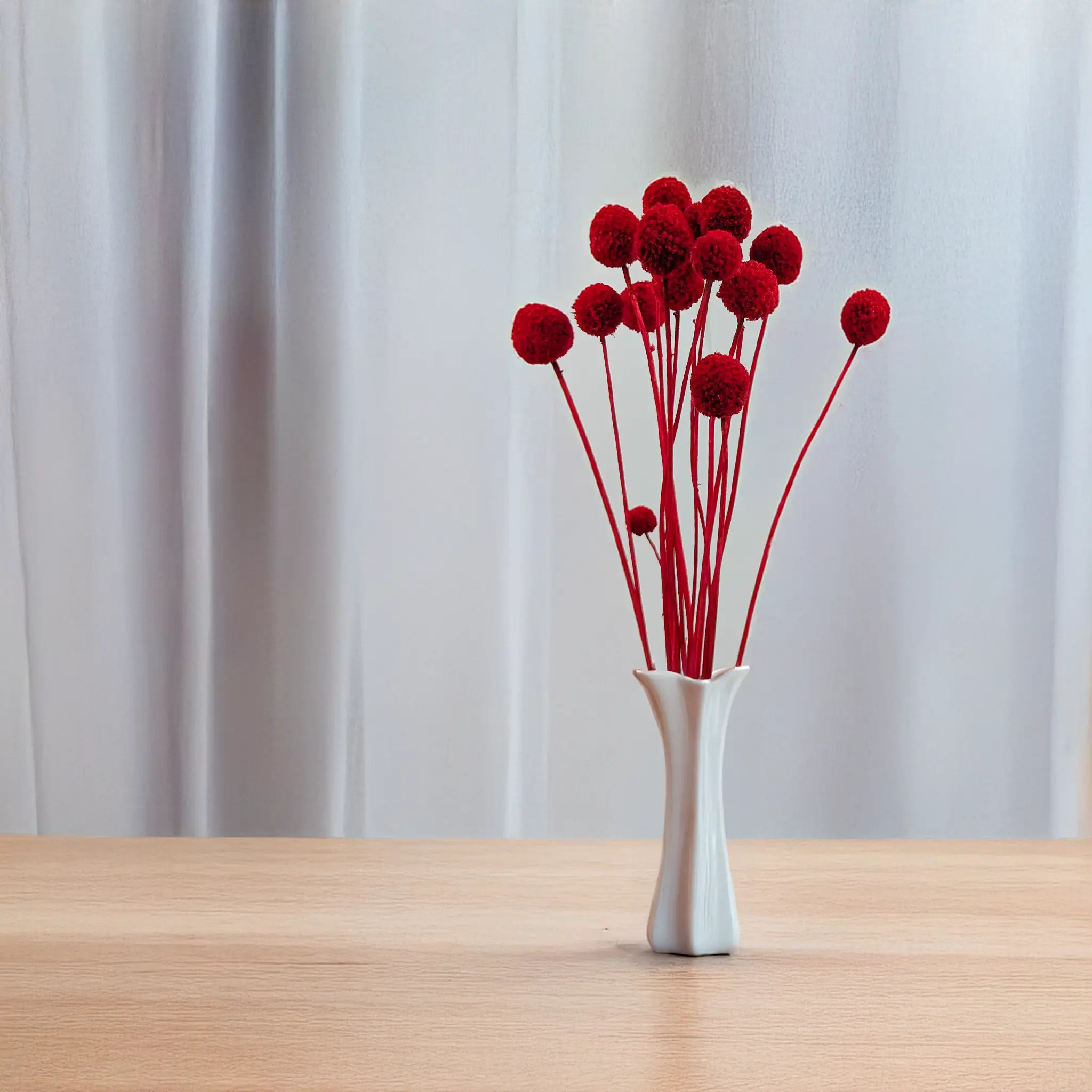 Suszona kraspedia w intensywnym czerwonym kolorze to dekoracyjny akcent florystyczny, który przyciąga uwagę geometrycznym kształtem i nasyconym kolorem. Jej kuliste kwiatostany na smukłych łodygach świetnie prezentują się zarówno w nowoczesnych, jak i klasycznych aranżacjach.