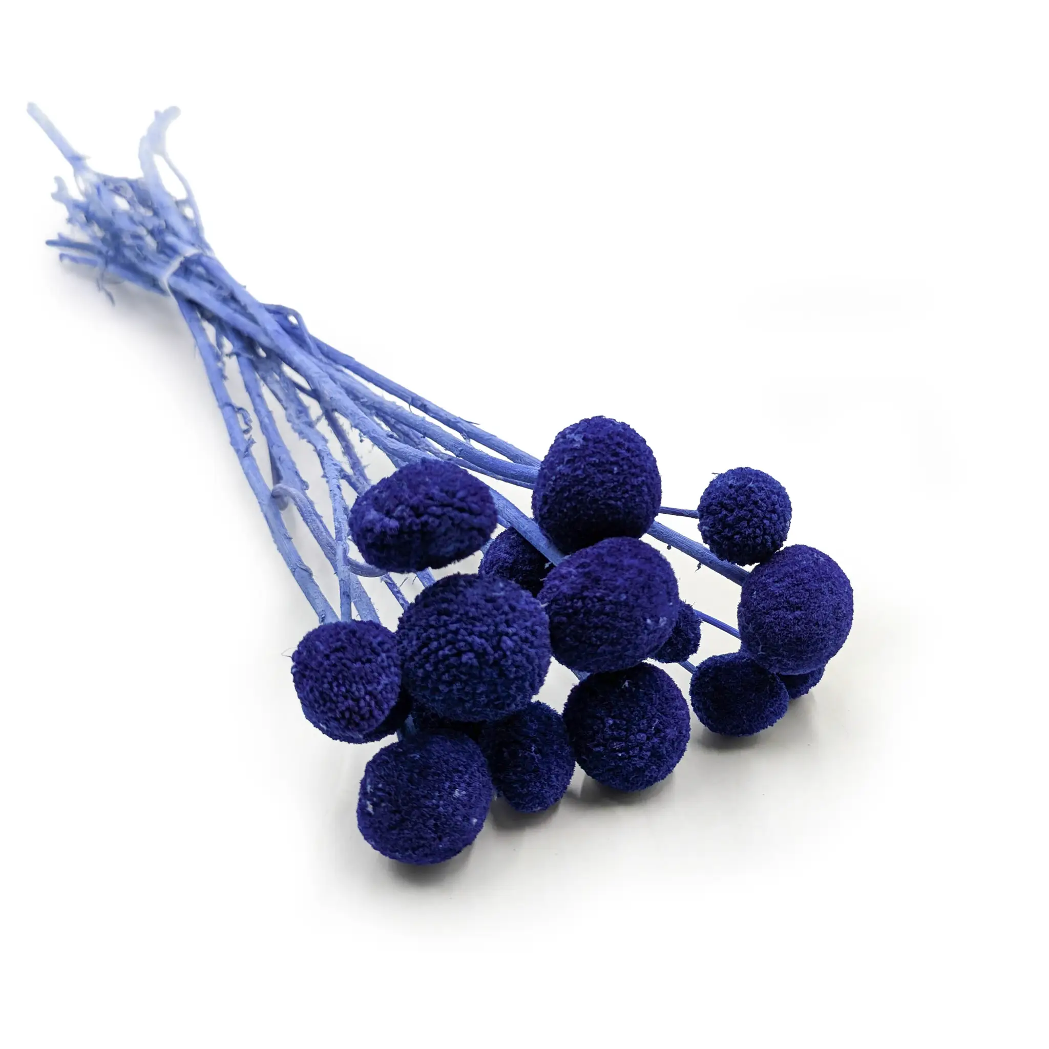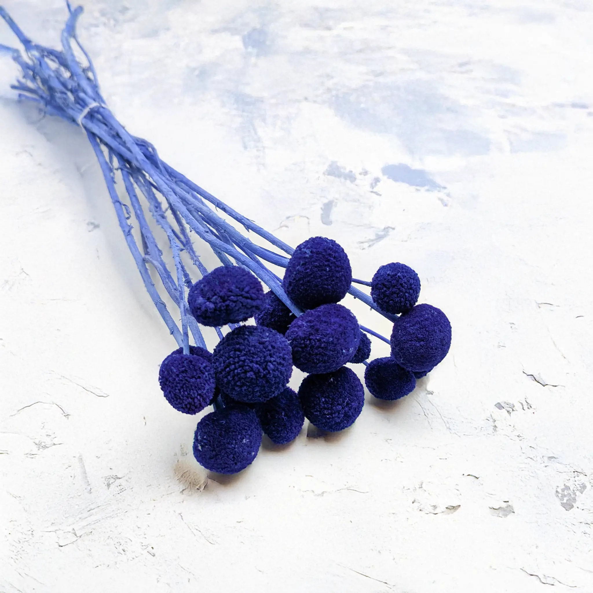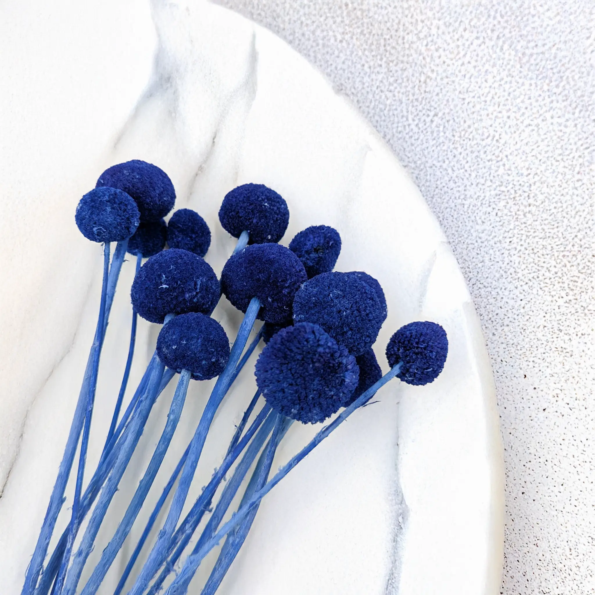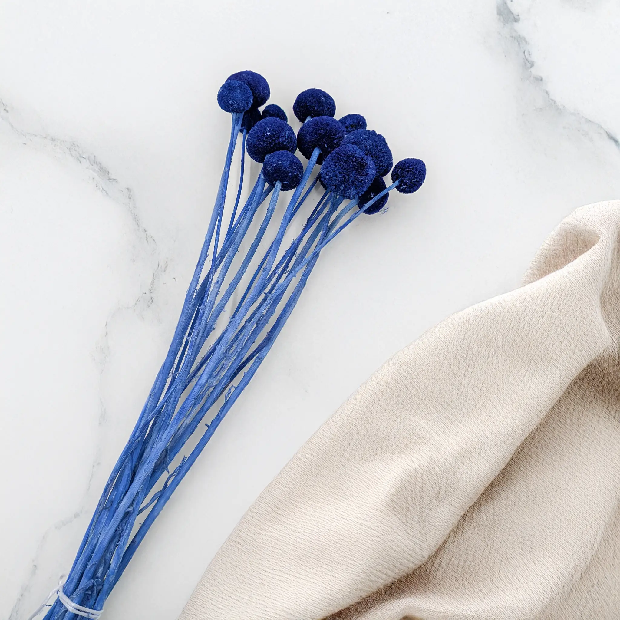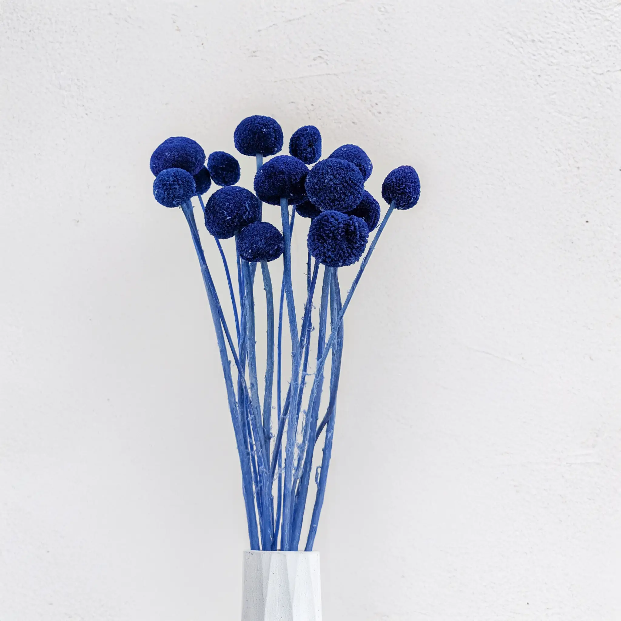 Suszona Kraspedia (Craspedia Extra) w intensywnym niebieskim kolorze to dekoracyjny hit do kompozycji w stylu boho, rustykalnym i nowoczesnym. Jej idealnie kuliste kwiatostany przyciągają uwagę i nadają przestrzeni elegancki charakter.