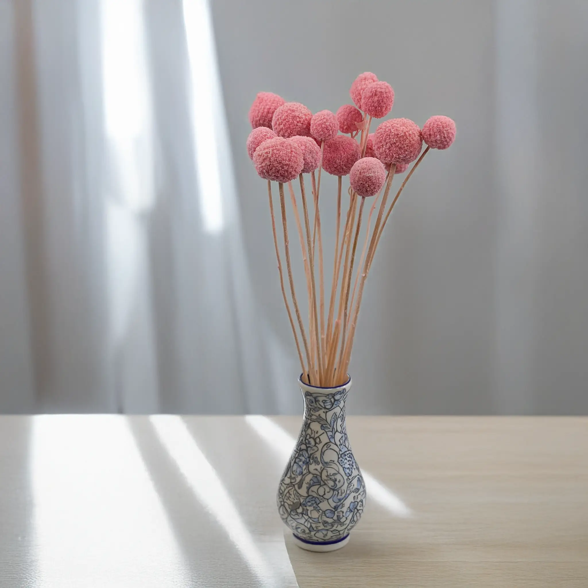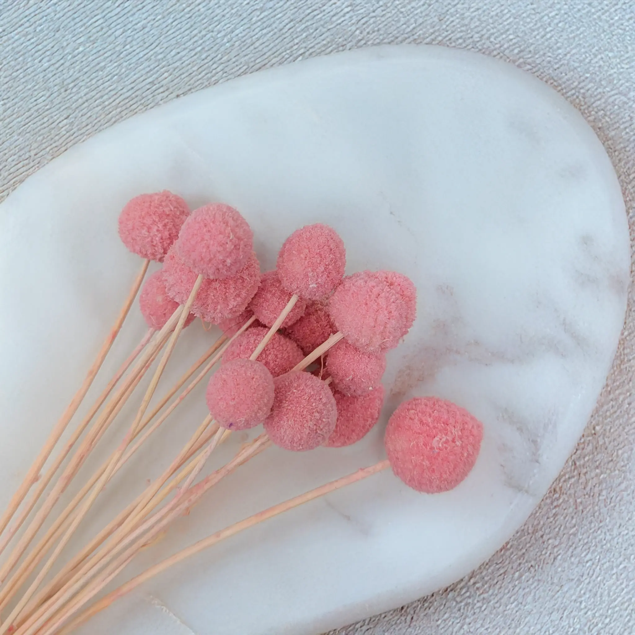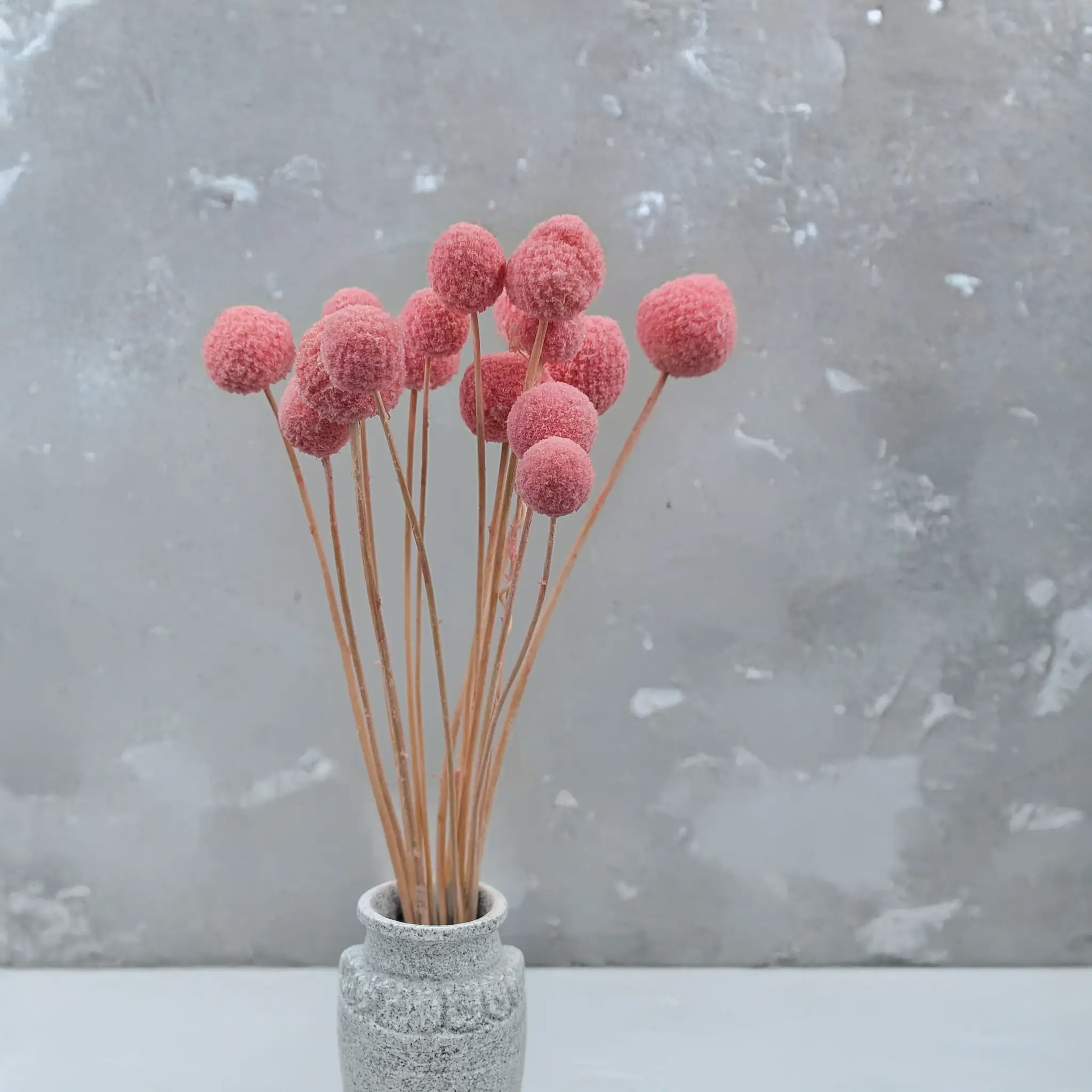 Różowa kraspedia (Craspedia Extra), znana również jako Billy Balls, to zachwycający element dekoracyjny, który wnosi do każdej aranżacji odrobinę optymizmu i koloru. Jej kuliste kwiatostany w intensywnym, nasyconym różu przyciągają wzrok i doskonale komponują się z innymi suszonymi roślinami oraz naturalnymi trawami.