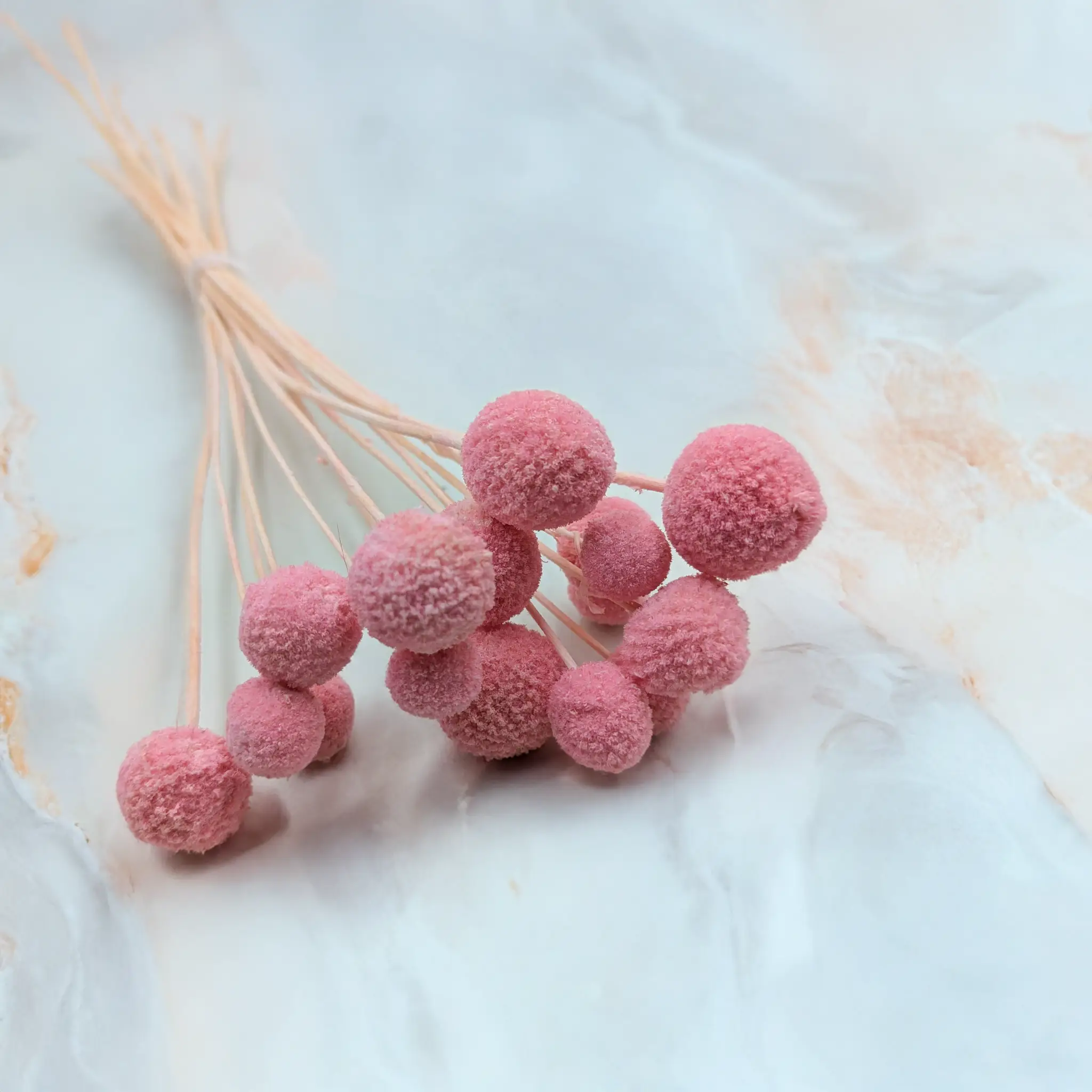Każda wiązka to produkt naturalny – mogą wystąpić różnice w odcieniach, długości czy wielkości kwiatostanów. Z czasem barwiona kraspedia może nieznacznie tracić intensywność koloru. Przechowywać w miejscu suchym, z dala od słońca i źródeł ciepła.