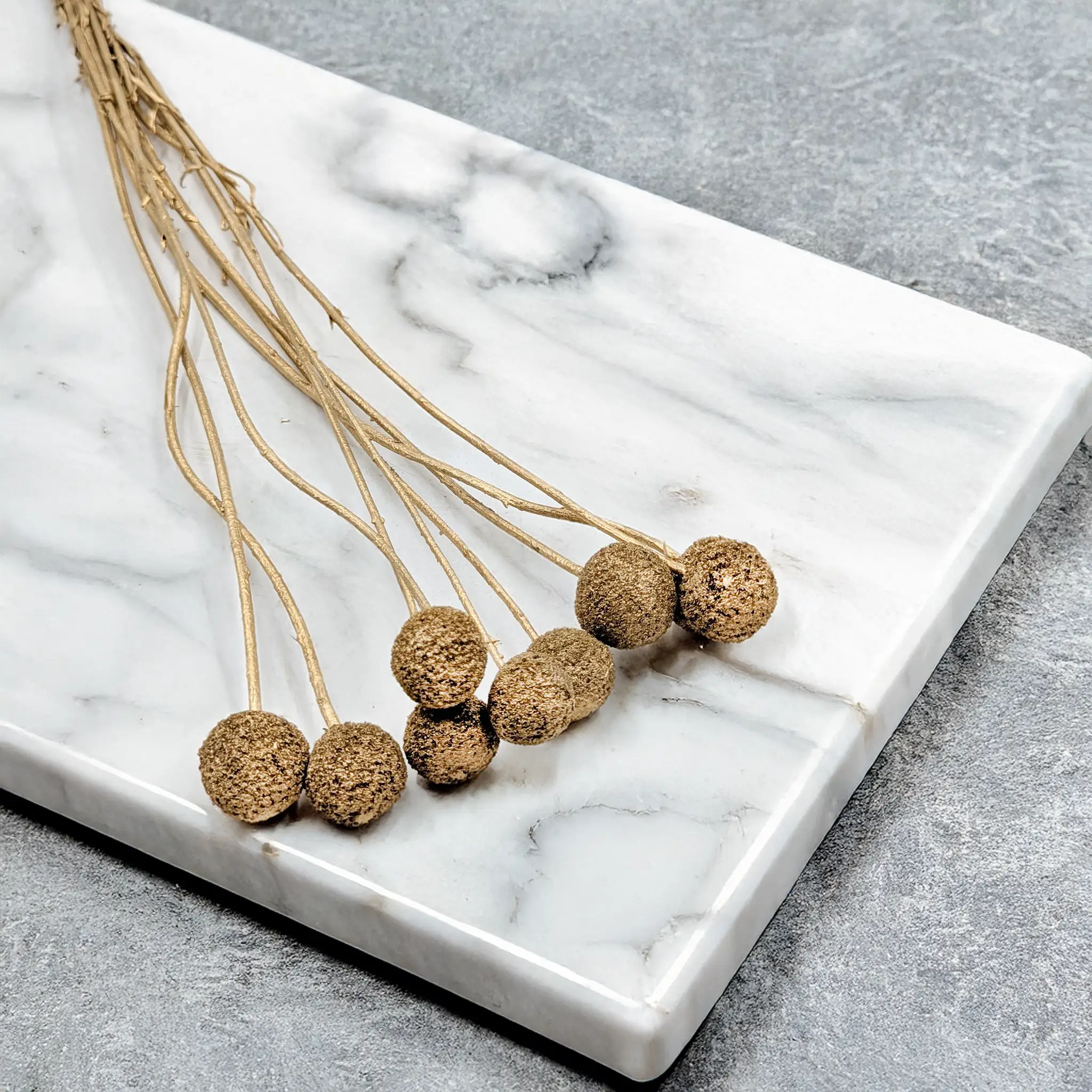 Kraspedia złota to wyjątkowy susz dekoracyjny o ciepłym, metalicznym odcieniu, który łączy w sobie elegancję i świąteczny blask. Jej kuliste kwiatostany wprowadzą do każdej aranżacji luksusowy akcent i nowoczesny charakter. Produkt został delikatnie barwiony, dzięki czemu zachowuje intensywny kolor i trwałość przez długi czas. Doskonale pasuje do stylów glamour, boho, nowoczesnego oraz klasycznego.