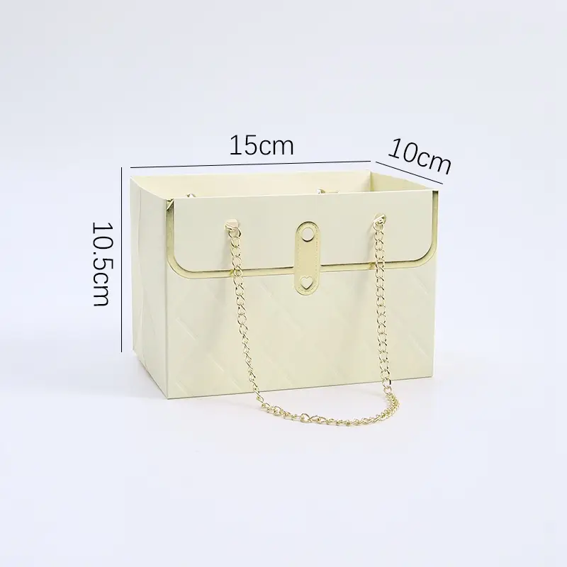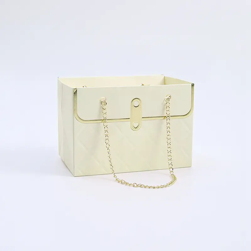 Box wykonany jest z wysokiej jakości papieru w pikowanym wzorze w kolorze ciepłego beżu, z metalowym łańcuszkiem w odcieniu złota, co nadaje mu charakter luksusowego dodatku. Jego kobieca forma i neutralna, elegancka kolorystyka sprawiają, że idealnie sprawdzi się jako prezent, dekoracja ślubna, kompozycja florystyczna na Dzień Matki czy wyjątkowe urodziny.