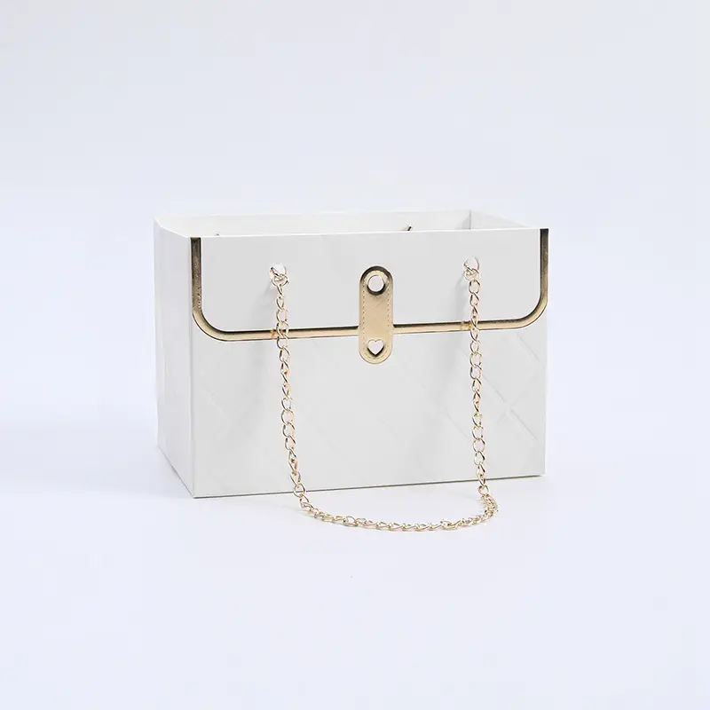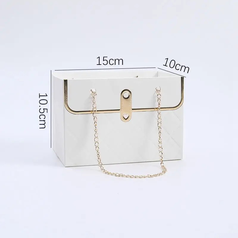 Box wykonany jest z wysokiej jakości papieru w pikowanym wzorze w kolorze czystej bieli, z metalowym łańcuszkiem w odcieniu złota, co nadaje mu charakter luksusowego dodatku. Jego kobieca forma i jasna, klasyczna kolorystyka sprawiają, że idealnie sprawdzi się jako prezent, dekoracja ślubna, kompozycja florystyczna na Dzień Matki czy wyjątkowe urodziny.