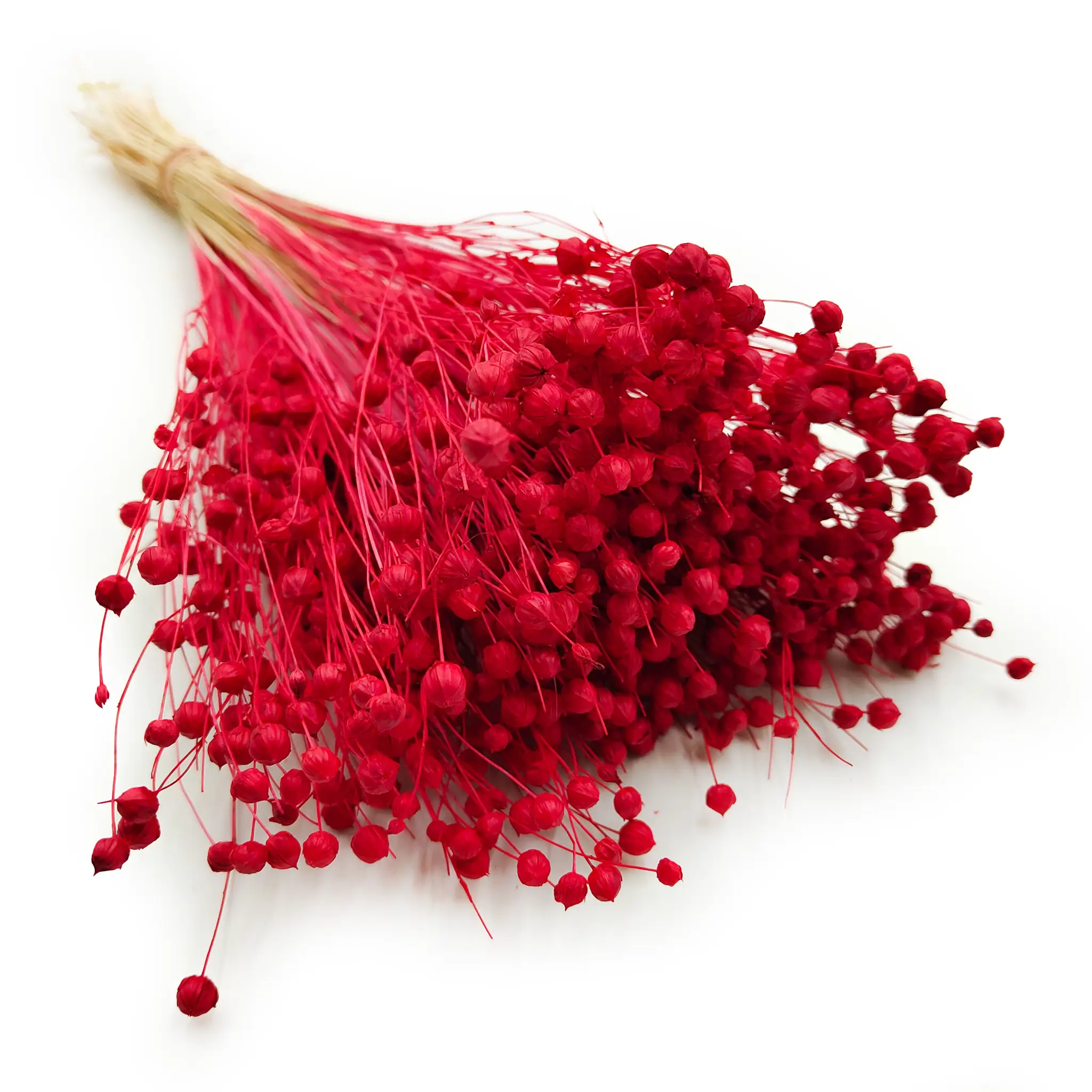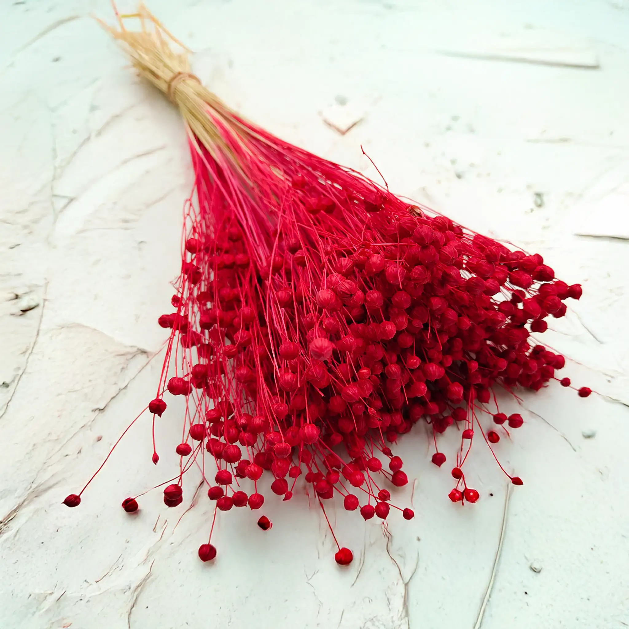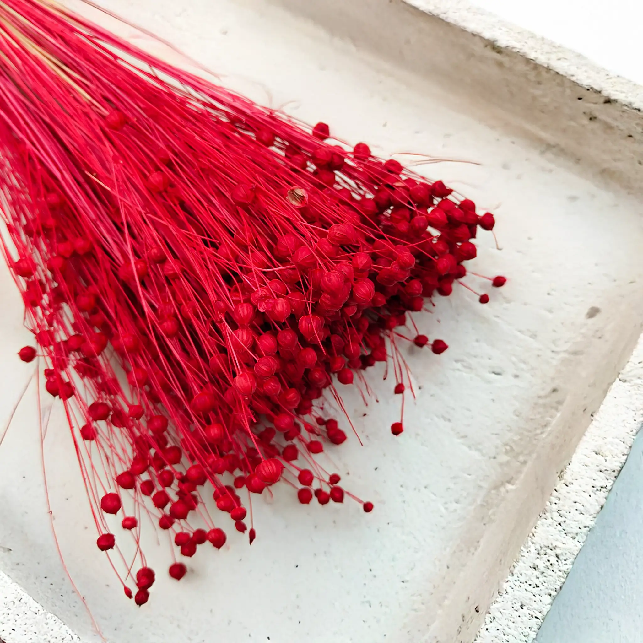 Len suszony w intensywnym czerwonym kolorze to wyrazista dekoracja, która przyciąga wzrok i nadaje pomieszczeniu wyjątkowego charakteru. Czerwień symbolizuje energię, miłość i pasję – doskonale pasuje do wnętrz, które mają emanować siłą i elegancją.