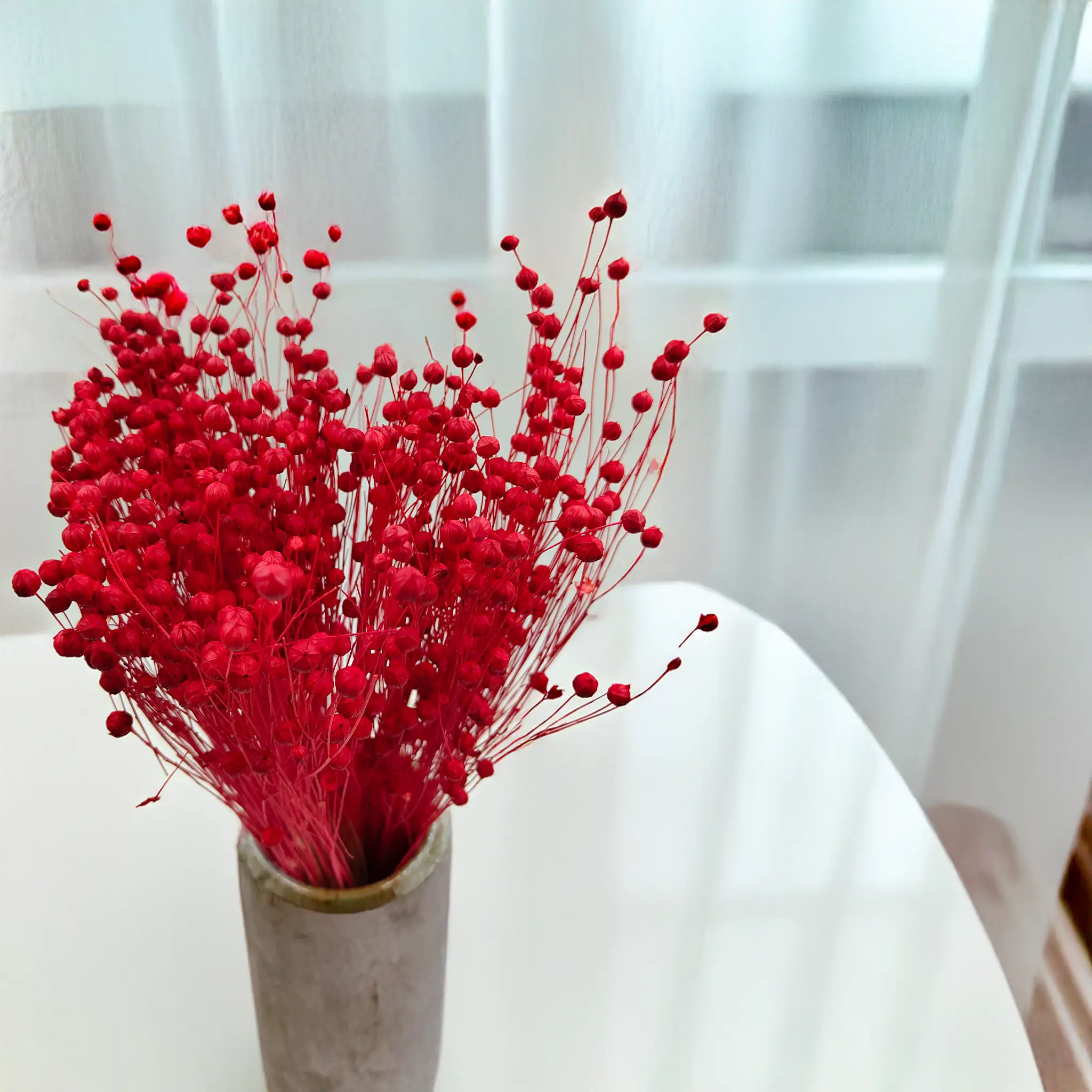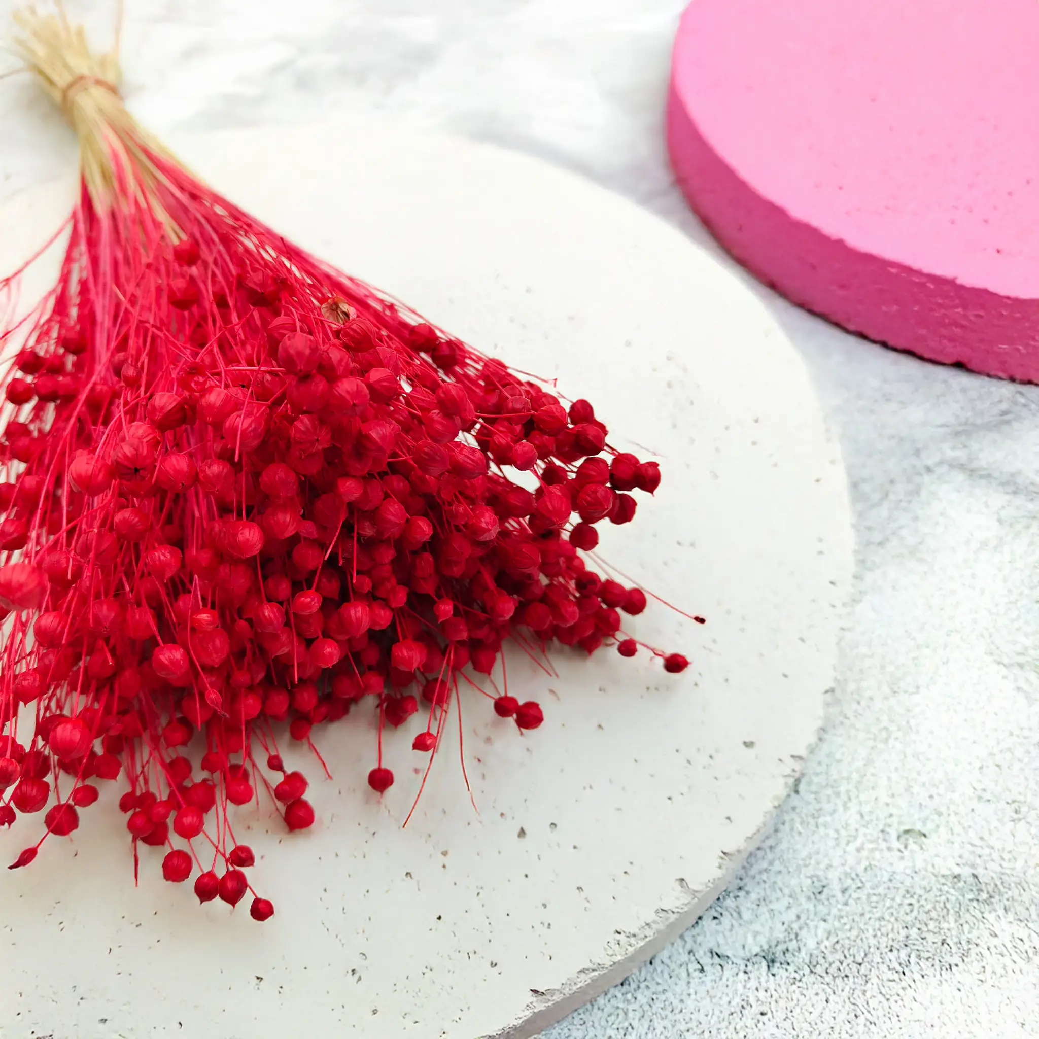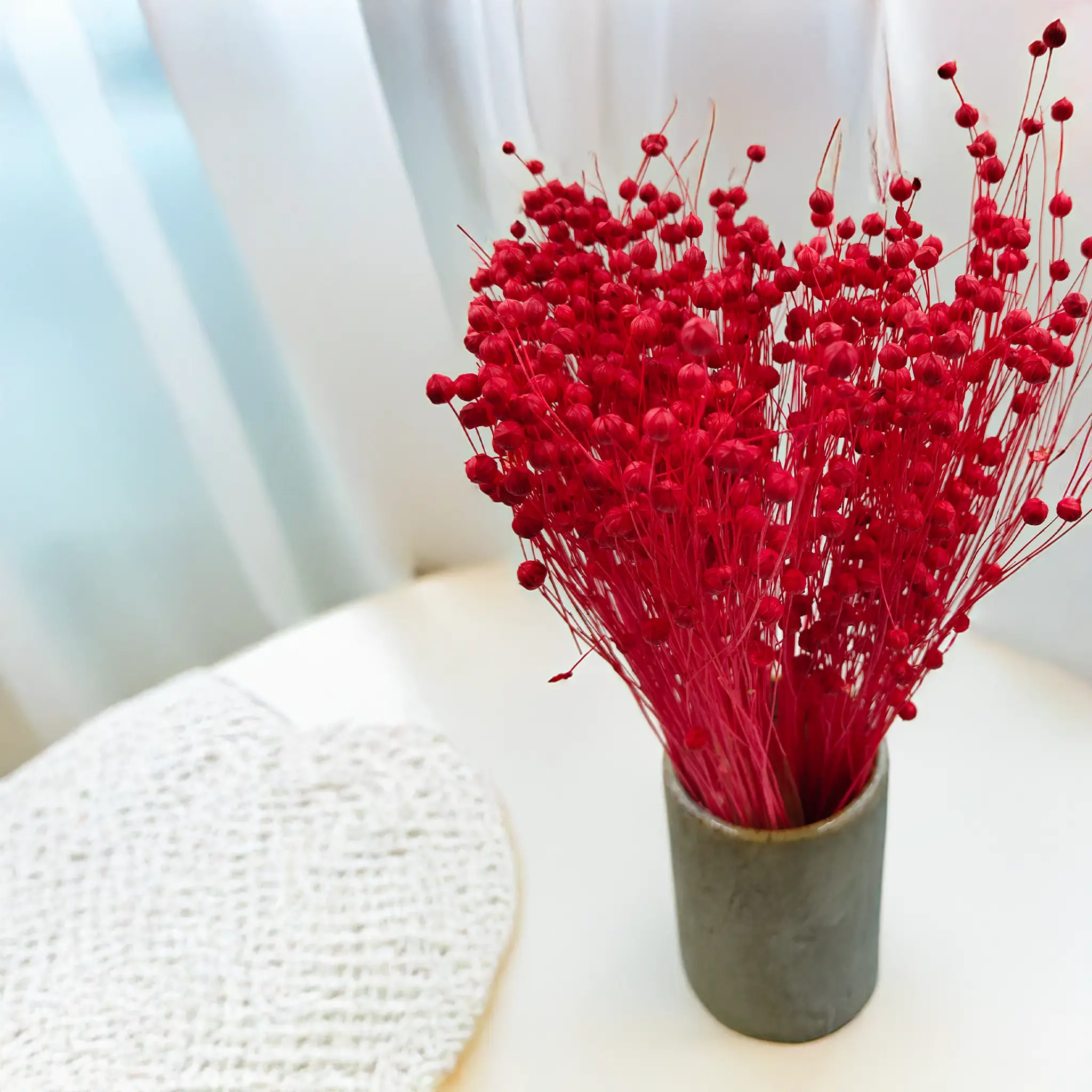 Len suszony w intensywnym czerwonym kolorze to wyrazista dekoracja, która przyciąga wzrok i nadaje pomieszczeniu wyjątkowego charakteru. Czerwień symbolizuje energię, miłość i pasję – doskonale pasuje do wnętrz, które mają emanować siłą i elegancją.