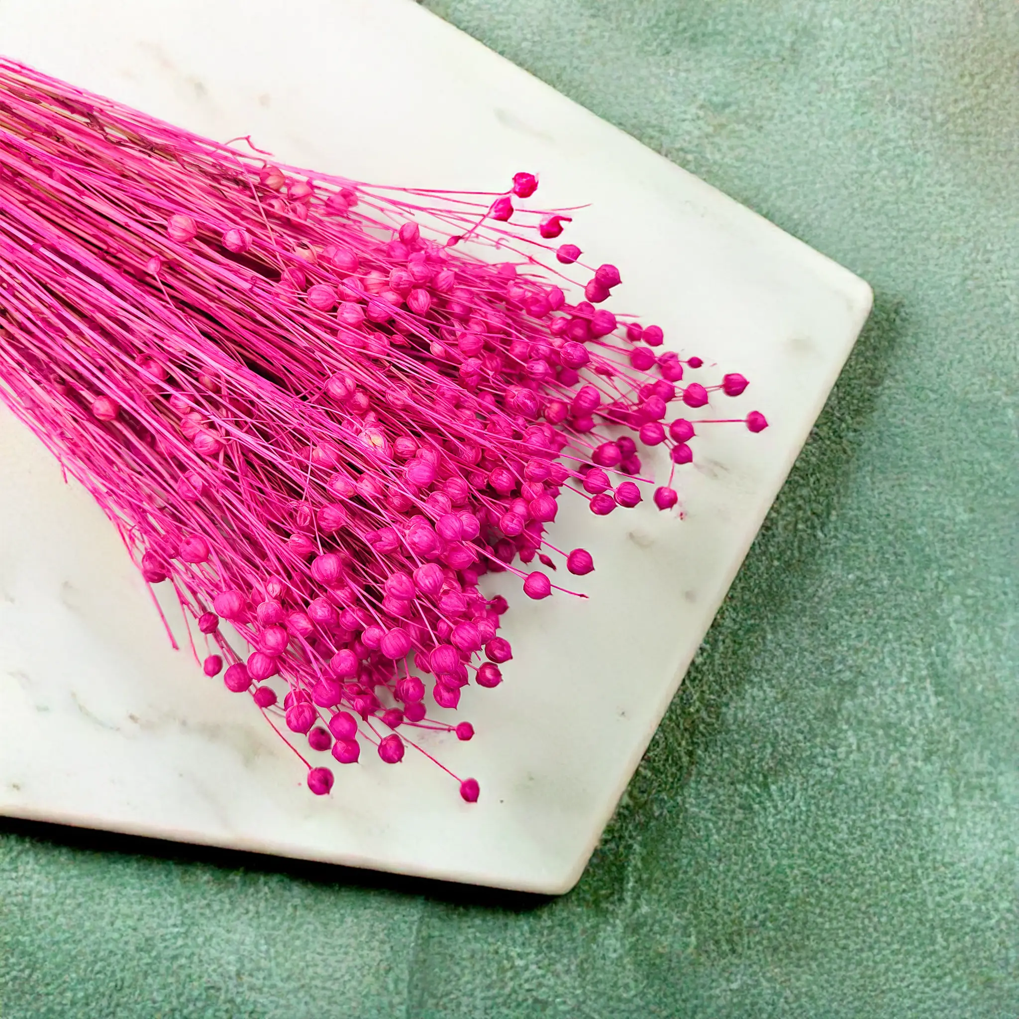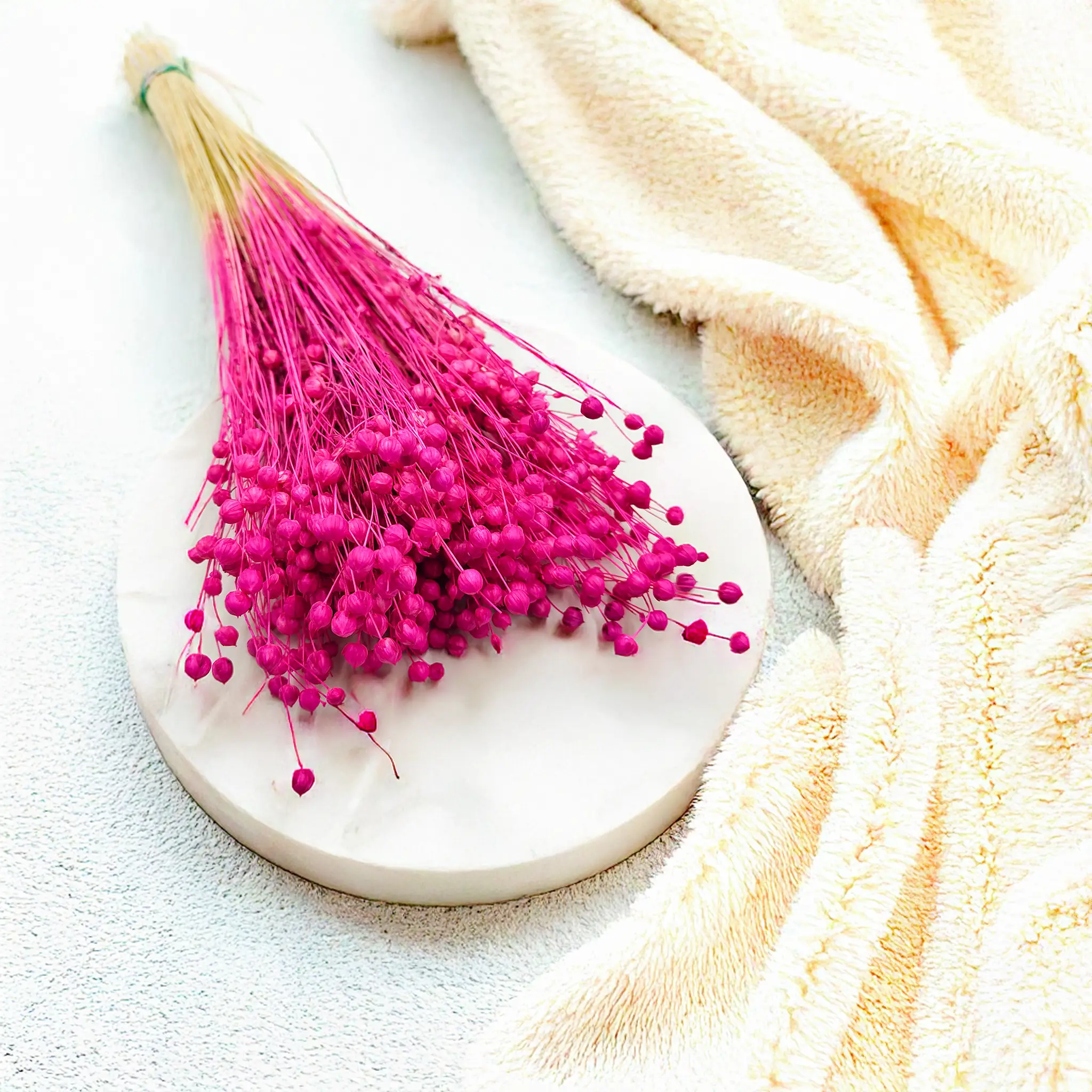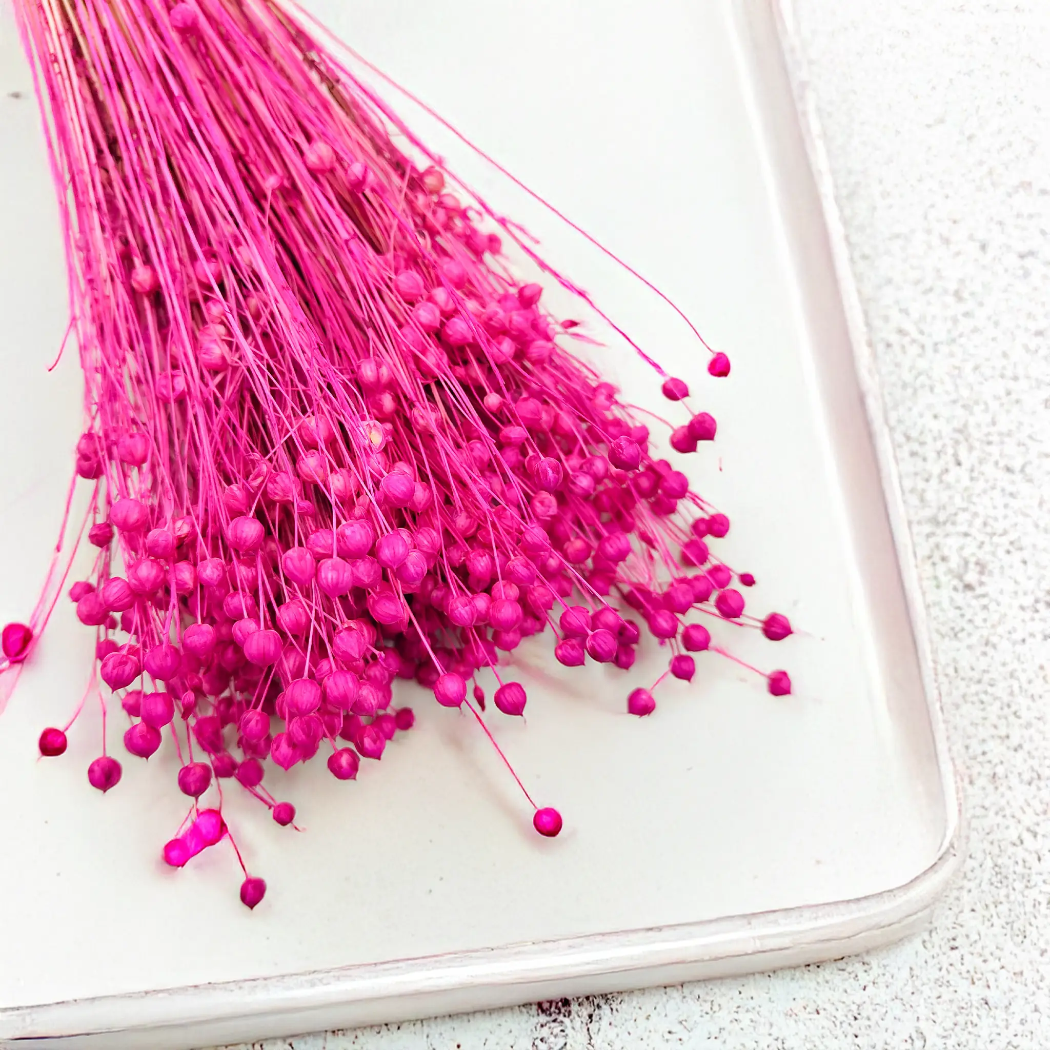 Suszony len w kolorze fuksji to dekoracyjny hit dla tych, którzy szukają mocnego, nowoczesnego akcentu kolorystycznego. Odcień fuksji dodaje kompozycjom energii, radości i wyrazistości, a jednocześnie zachowuje naturalny charakter rośliny.