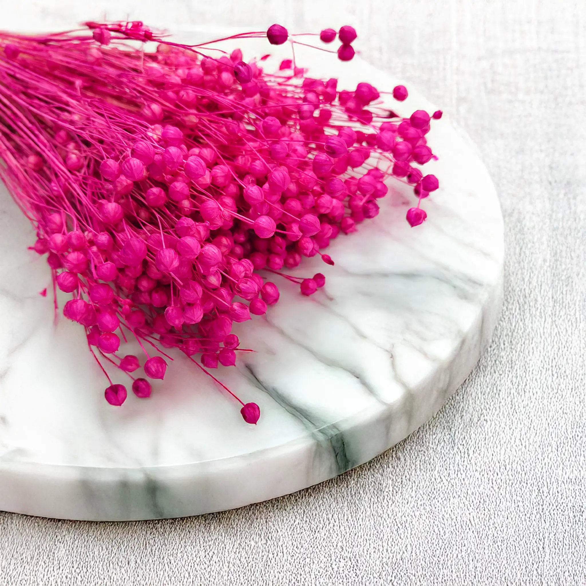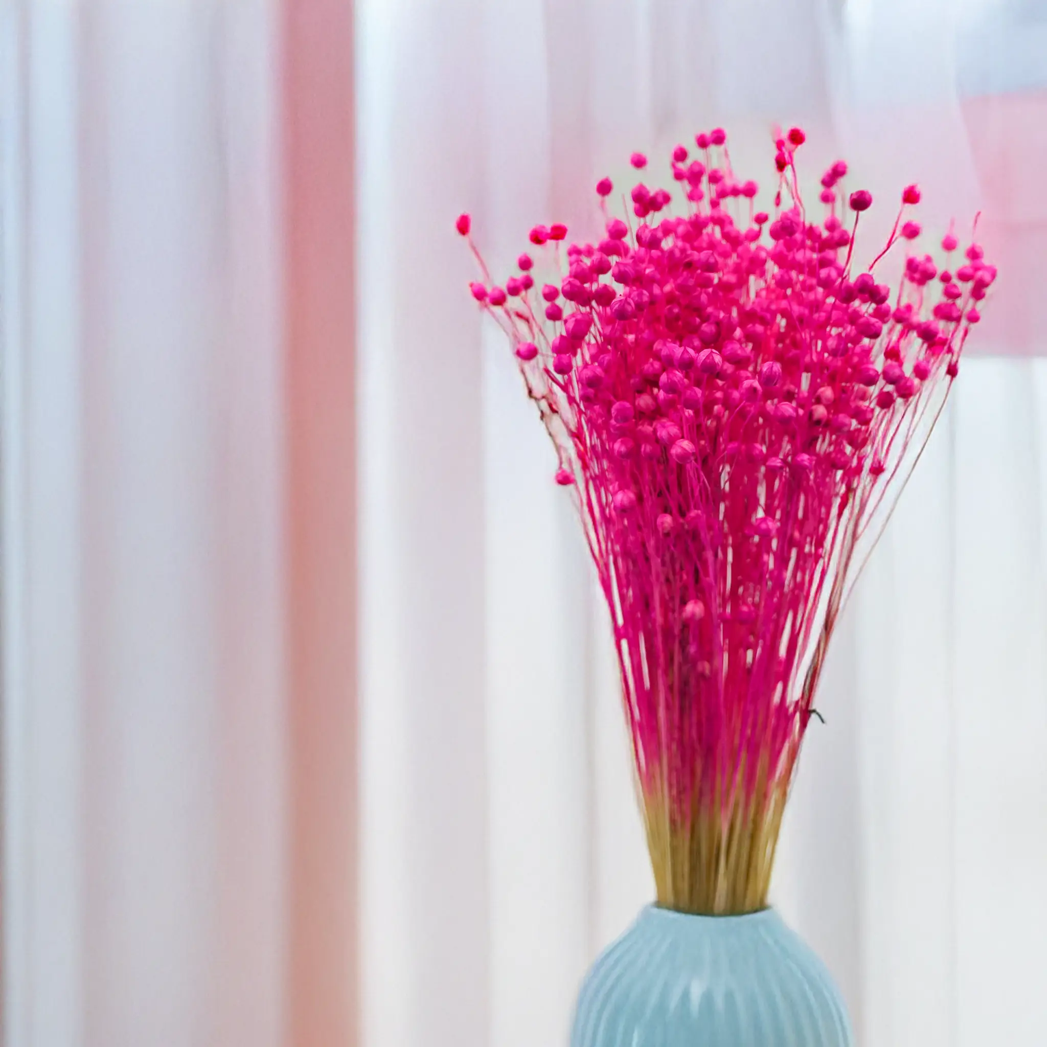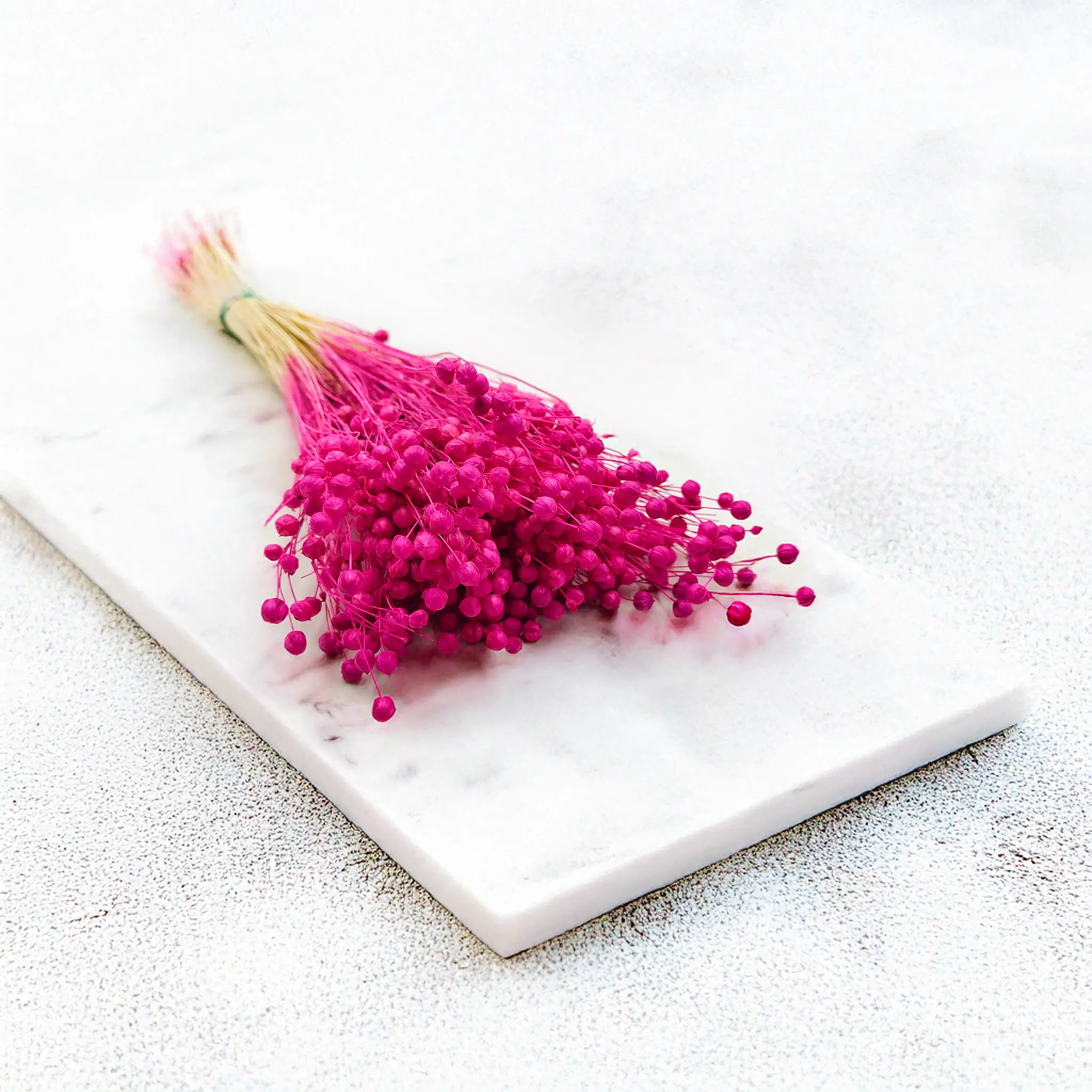 Suszony len w kolorze fuksji to dekoracyjny hit dla tych, którzy szukają mocnego, nowoczesnego akcentu kolorystycznego. Odcień fuksji dodaje kompozycjom energii, radości i wyrazistości, a jednocześnie zachowuje naturalny charakter rośliny.