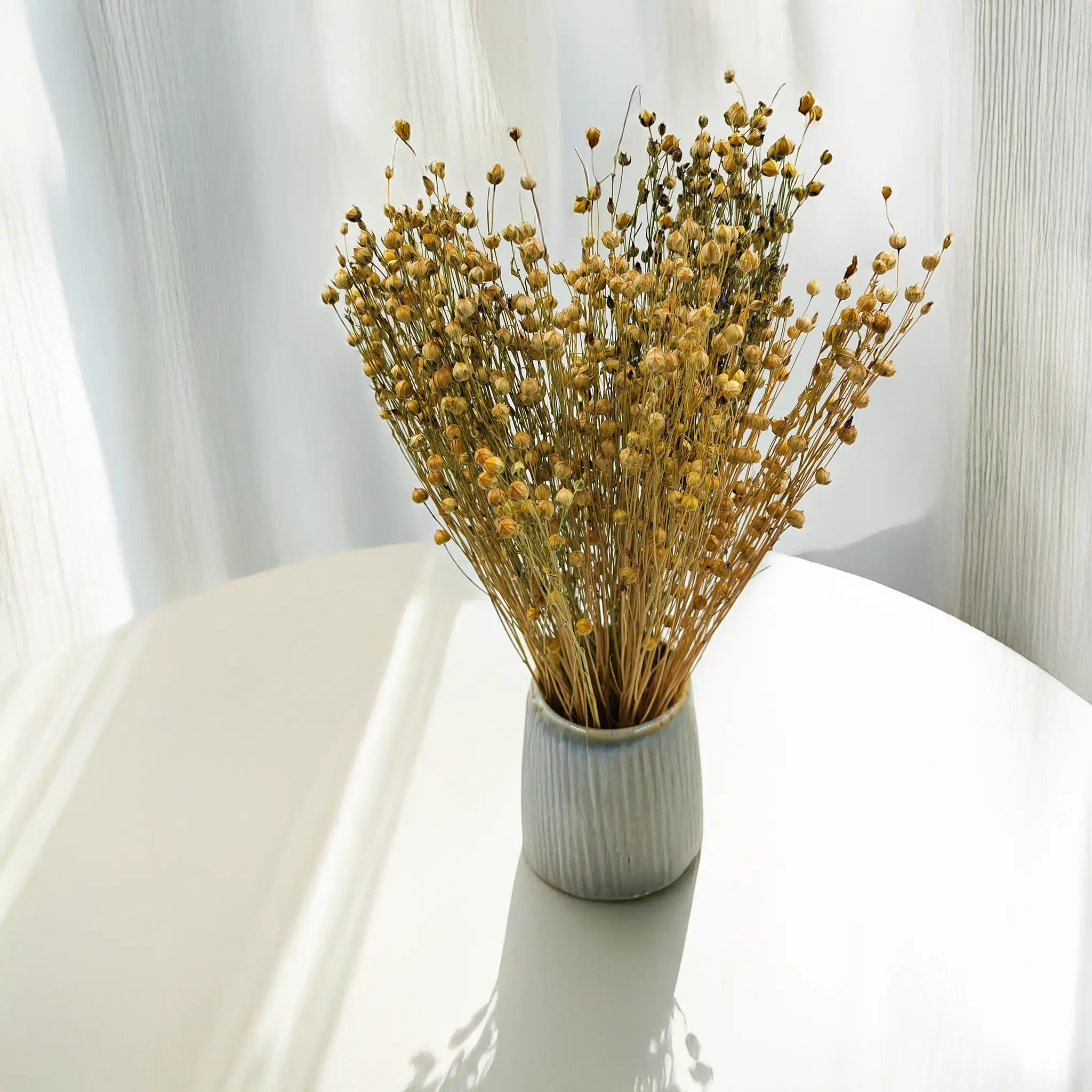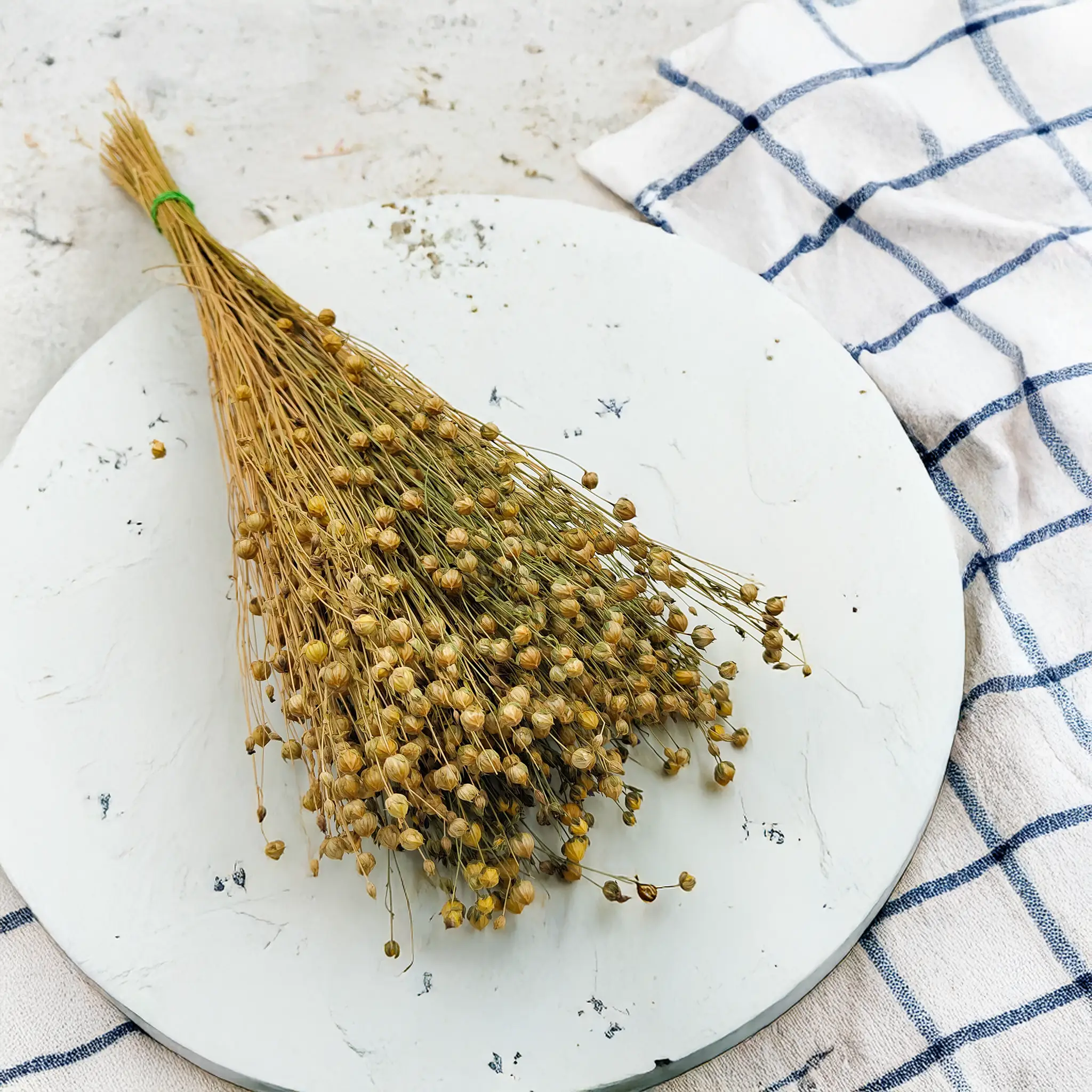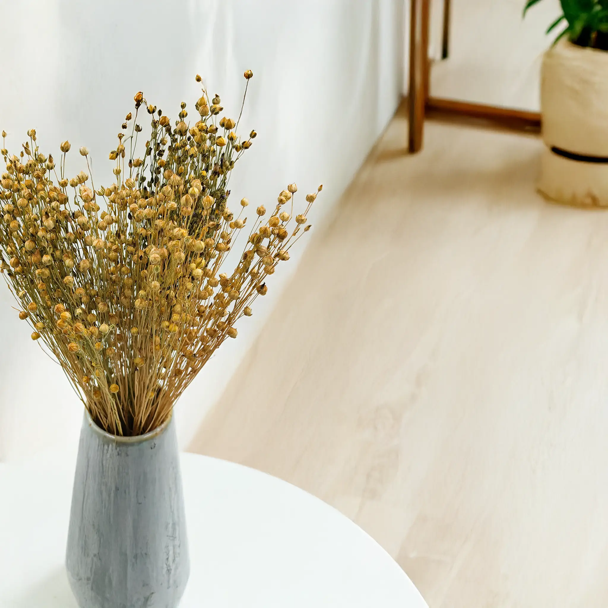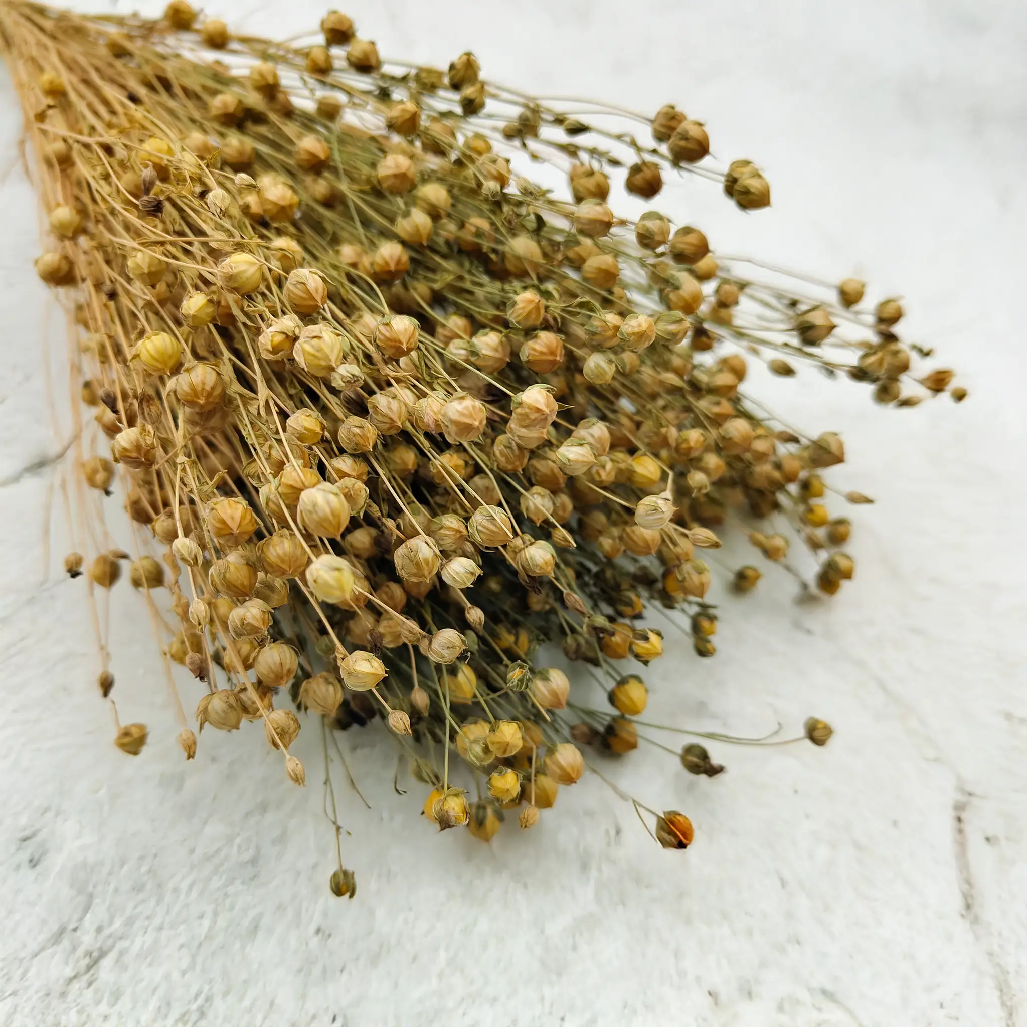 Len suszony w naturalnym, złoto-beżowym odcieniu to kwintesencja organicznej elegancji. Zachwyca prostotą i neutralnym wyglądem, dzięki czemu doskonale uzupełnia aranżacje w stylu boho, rustykalnym, skandynawskim i klasycznym.