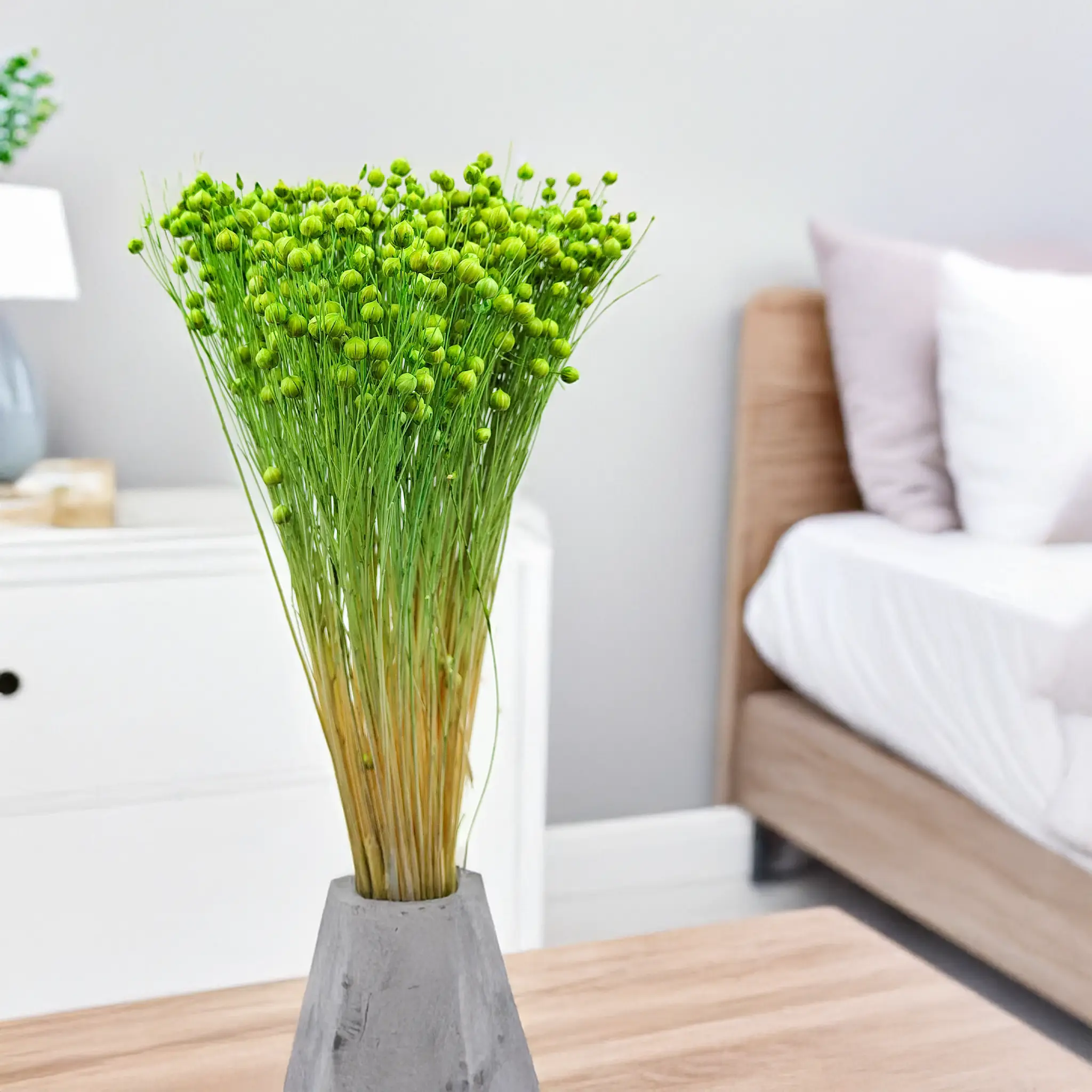 Len suszony nie wymaga pielęgnacji. Zachowuje kolor i strukturę przez wiele miesięcy, co czyni go praktycznym wyborem dla osób szukających trwałych, estetycznych rozwiązań florystycznych.