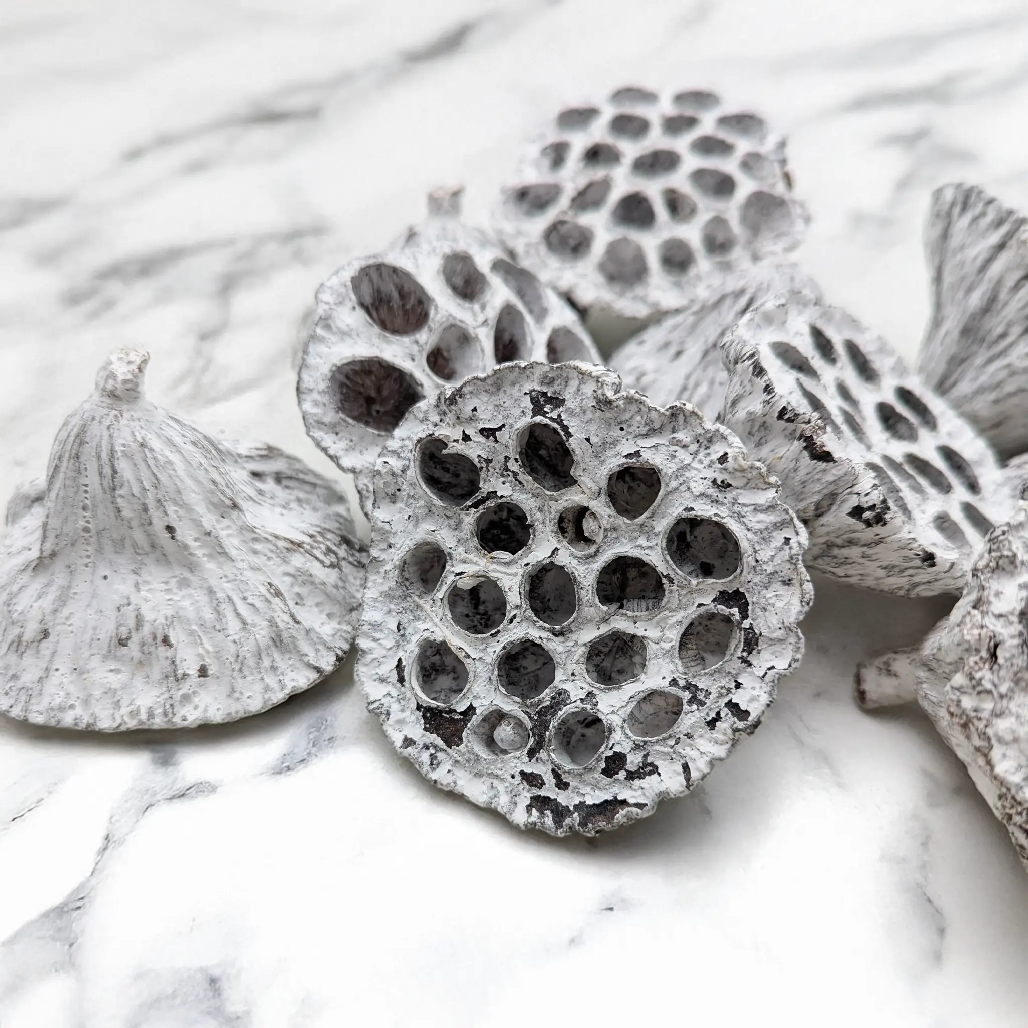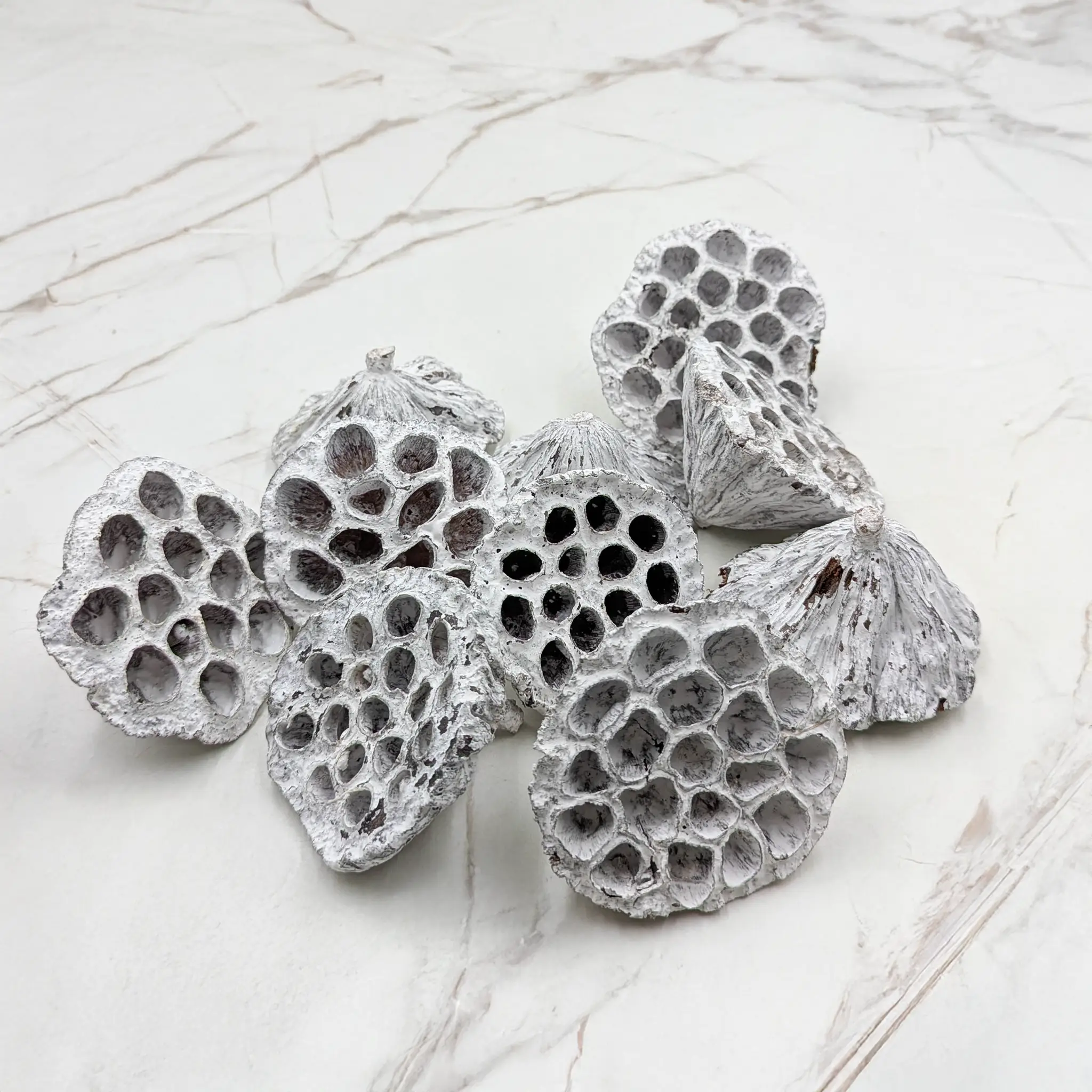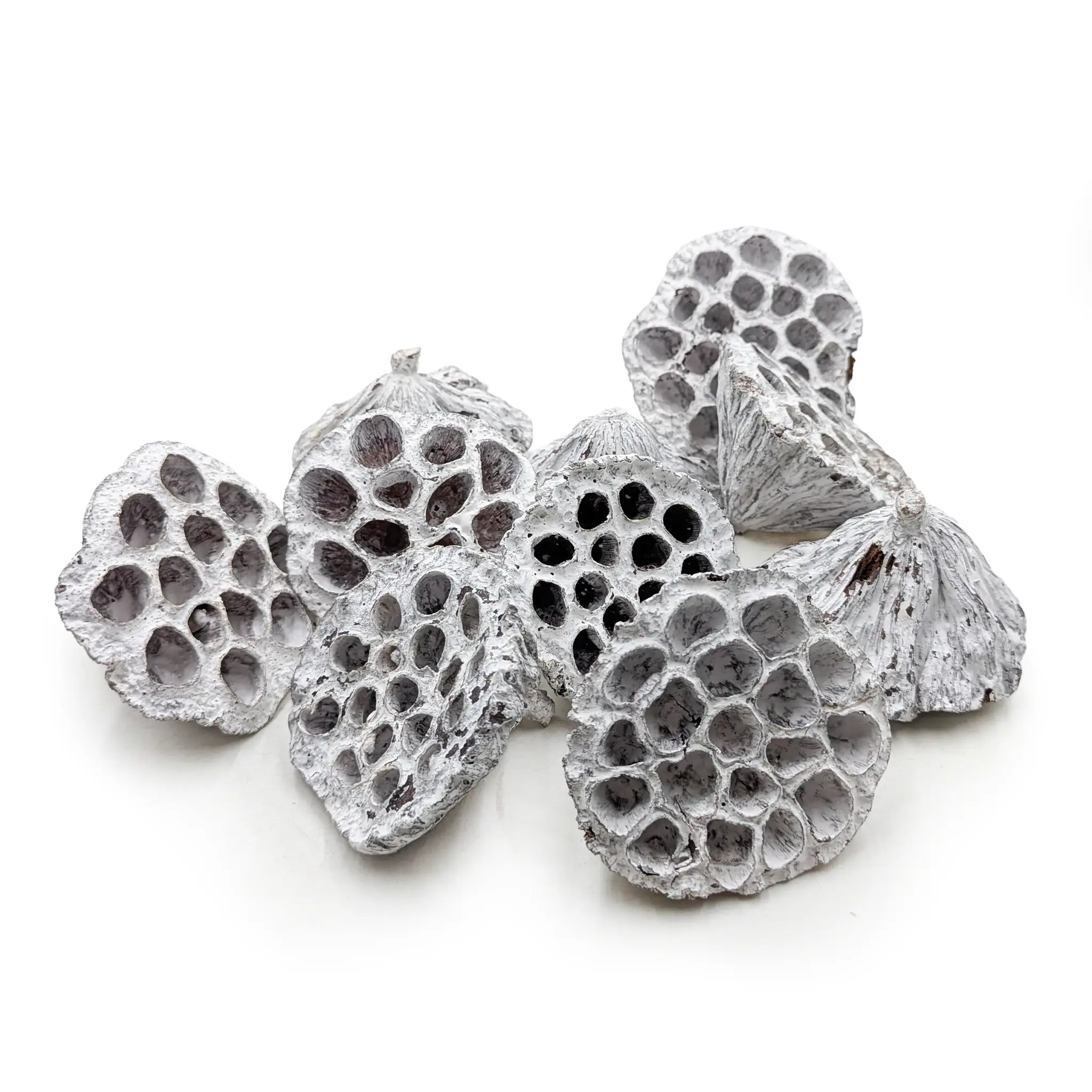 Lotos średni M (Bielony) to komplet 10 wyjątkowych, naturalnie wysuszonych główek lotosu o delikatnym, kremowo-białym odcieniu. Każdy egzemplarz wyróżnia się subtelną fakturą i niepowtarzalnym kształtem, dzięki czemu stanowi elegancki i egzotyczny akcent w aranżacjach florystycznych.