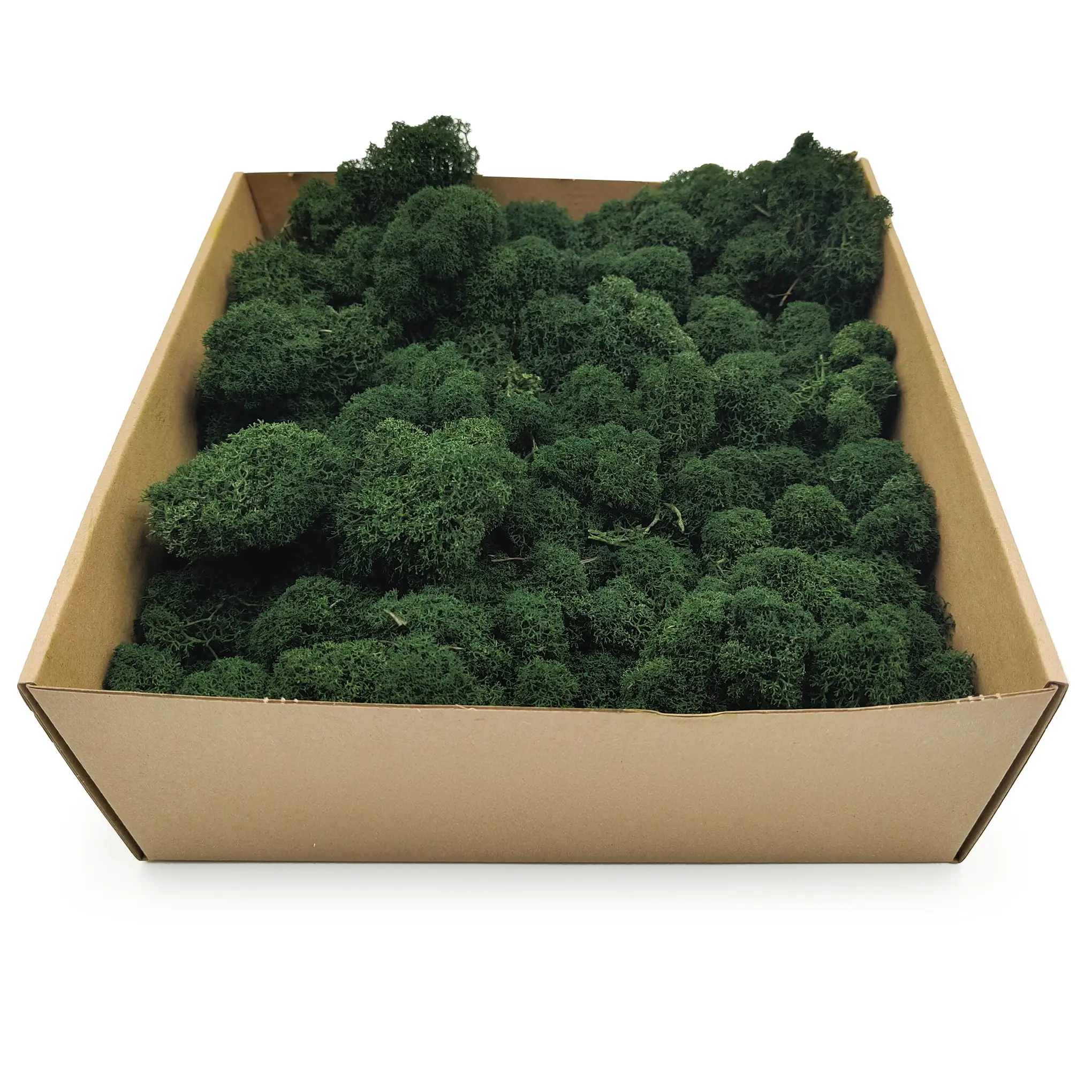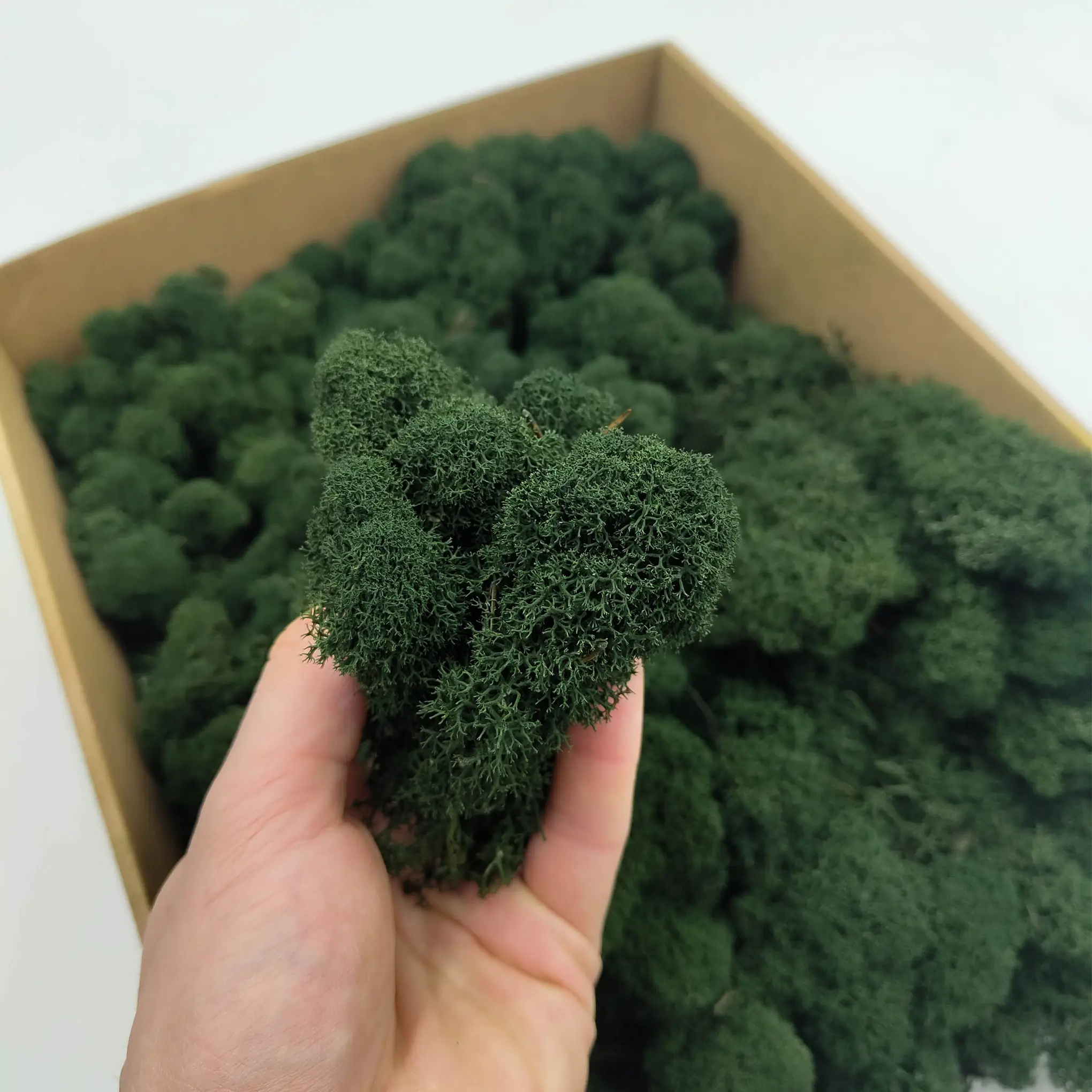 Ciemnozielony mech chrobotek fiński to klasyka w dekoracjach roślinnych. Jego nasycona barwa doskonale współgra z naturalnymi materiałami, czernią, bielą i drewnem. Idealny do aranżacji w stylu japandi, rustykalnym i industrialnym. Kolor ten nadaje kompozycjom głębi i harmonii.