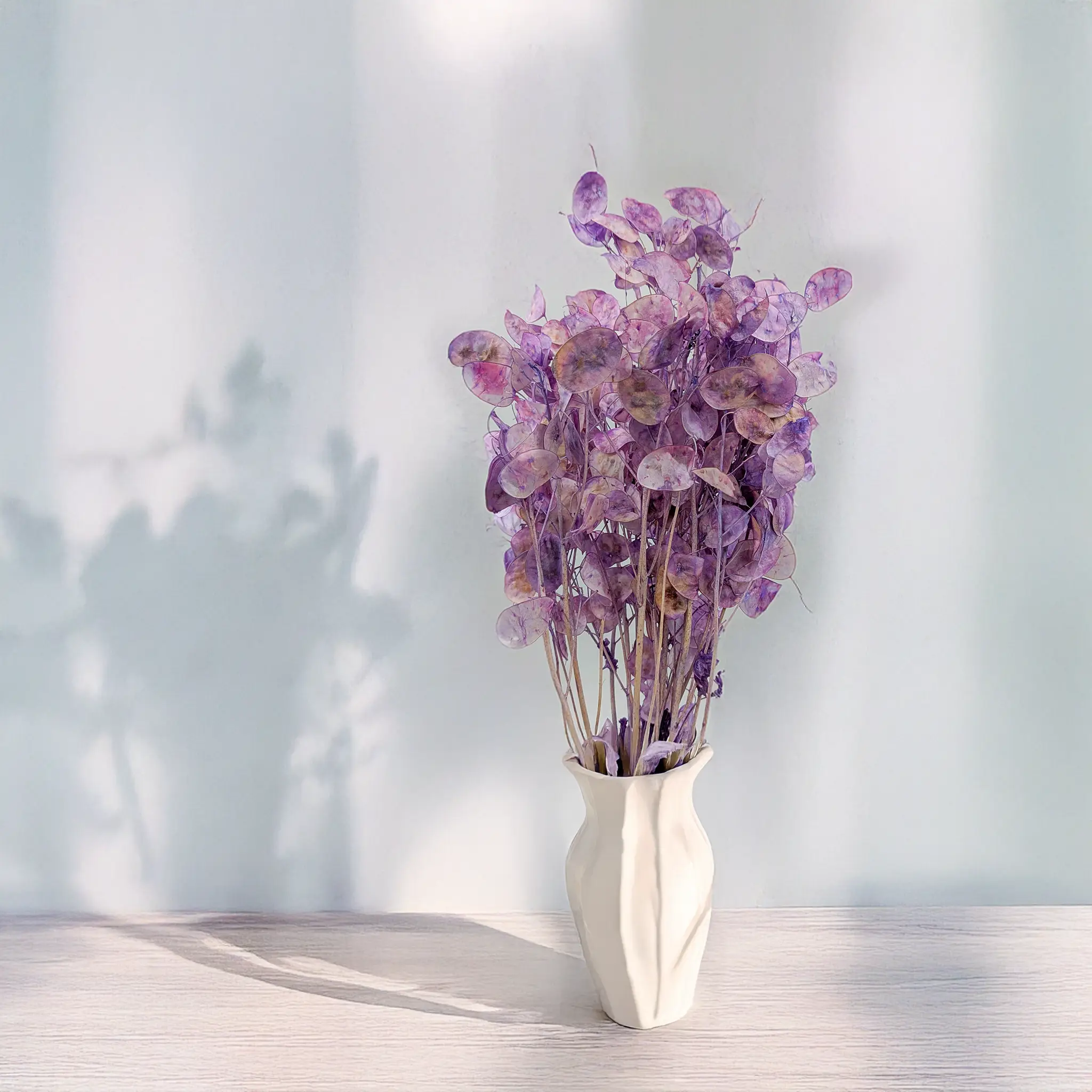 Lawendowa lunaria, czyli suszona miesięcznica roczna, to wyjątkowa roślina o przezroczystych, błoniastych okrągłych owocostanach, które zostały starannie zabarwione na pastelowy odcień lawendy. Kolor ten symbolizuje spokój, delikatność i duchową równowagę, wprowadzając do wnętrz romantyczny i wyciszający klimat.