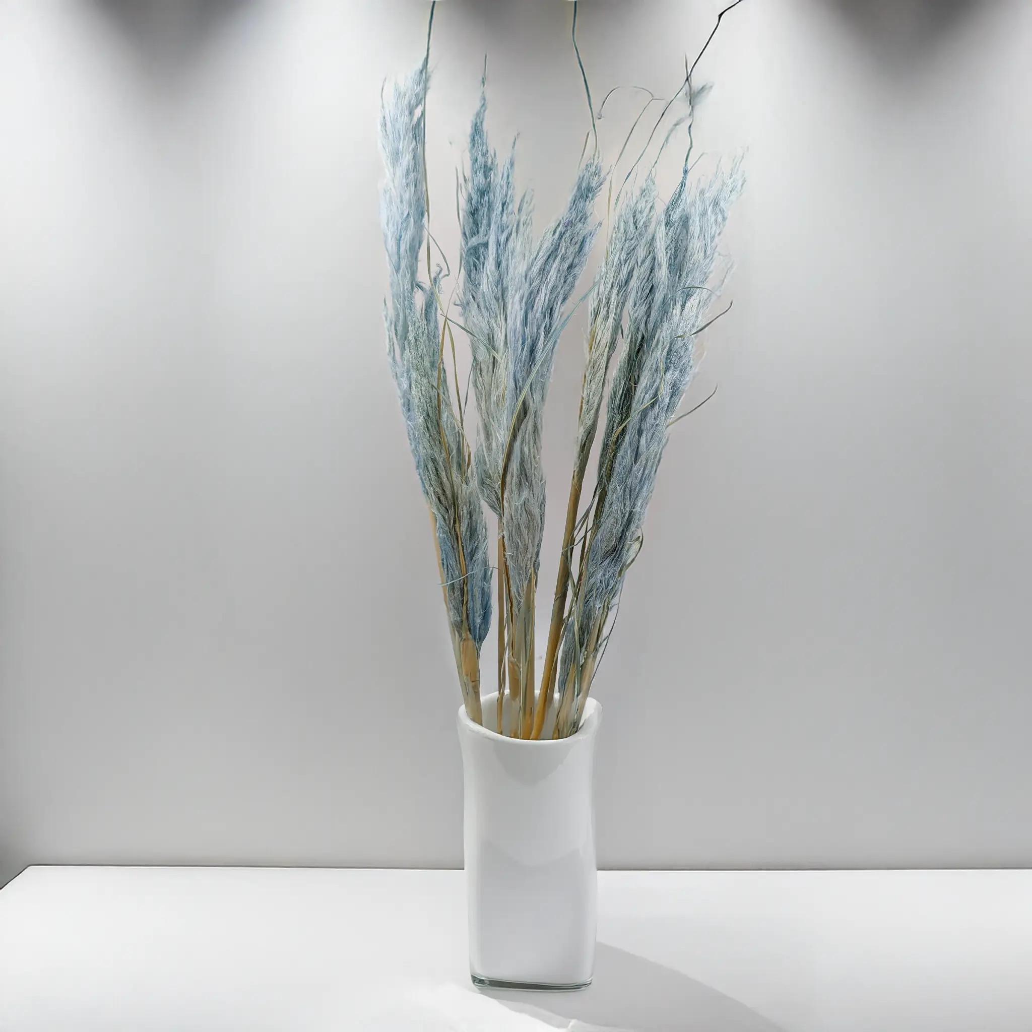 Błękit symbolizuje harmonię, czystość i świeżość. Jest kolorem relaksu i przestrzeni, dlatego błękitna pampasowa trawa świetnie sprawdza się w miejscach wypoczynku, pokojach dziecięcych, salonach i butikach. To barwa, która łagodzi i uspokaja wizualnie przestrzeń.