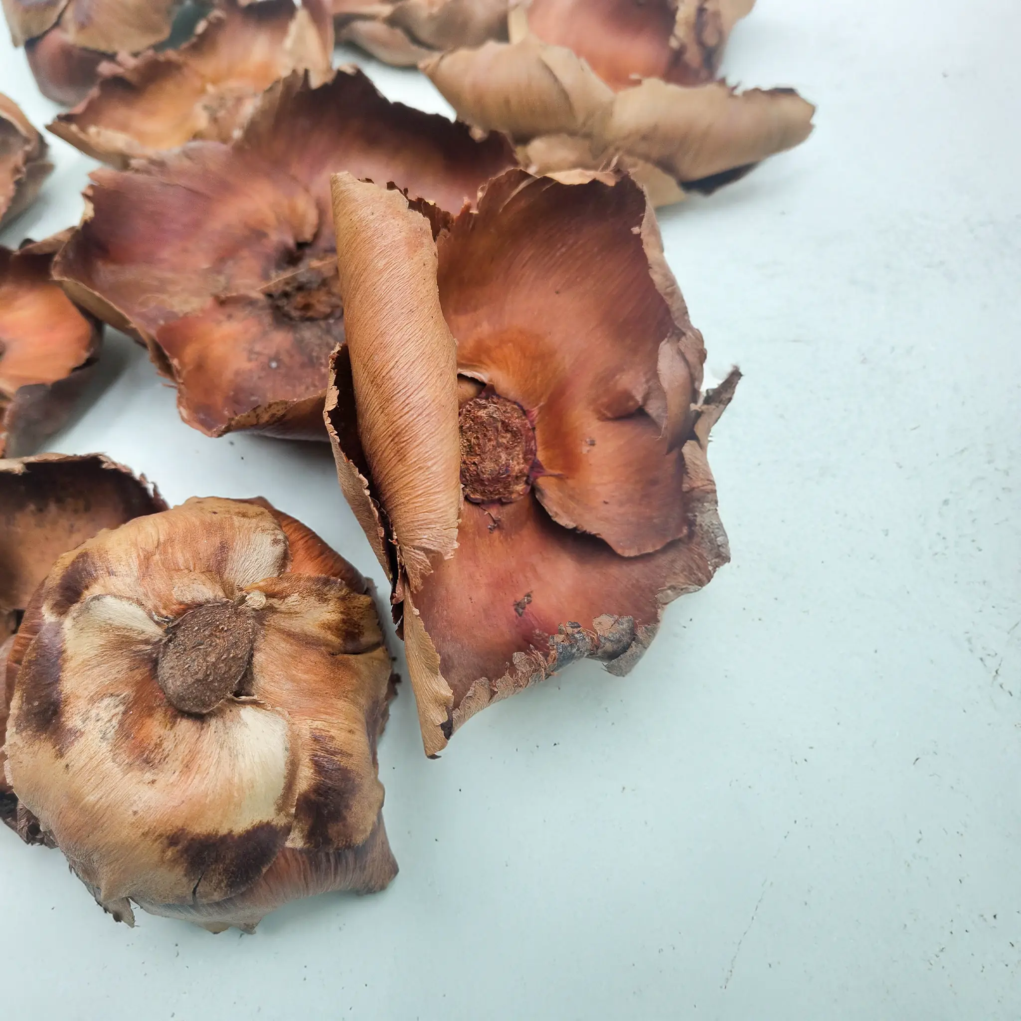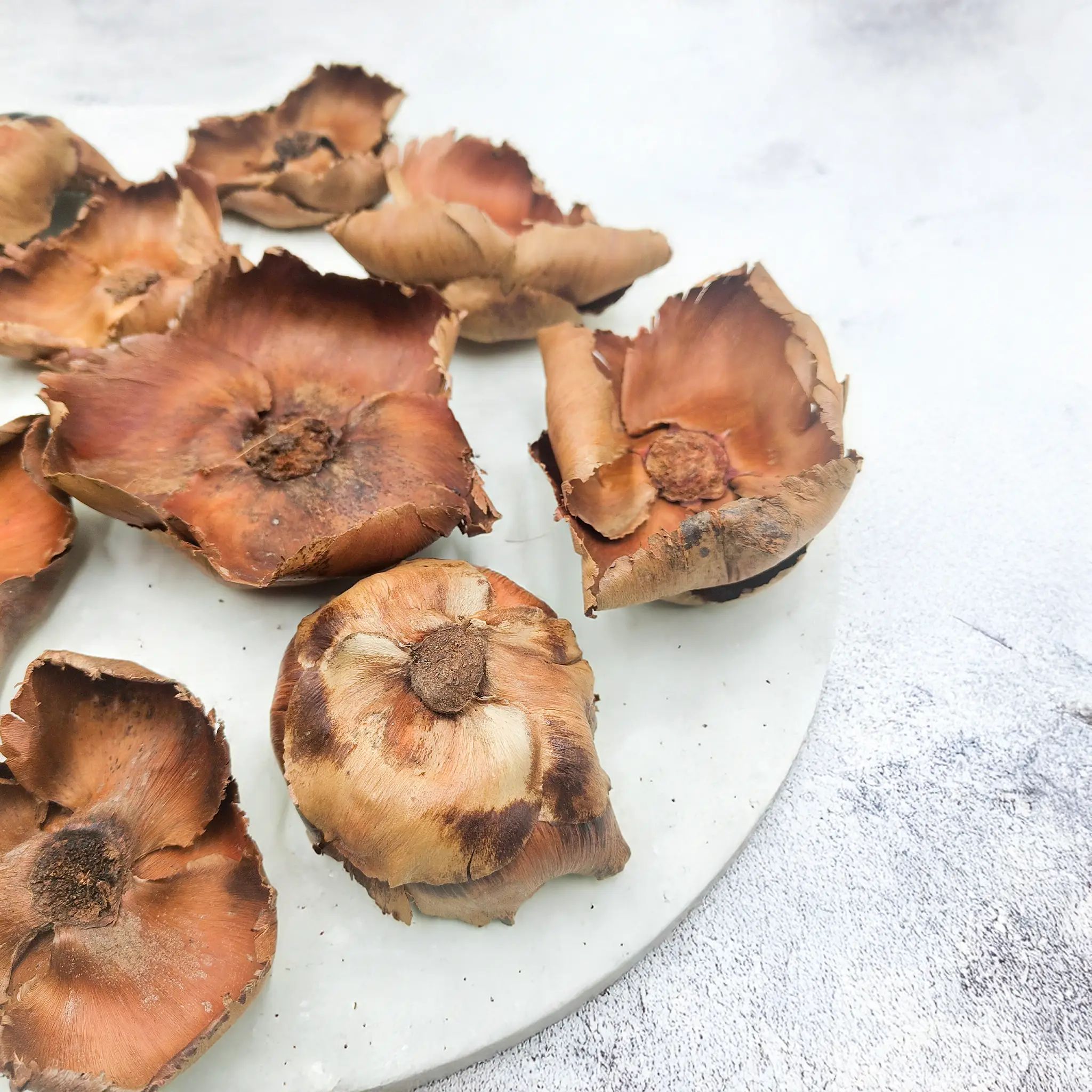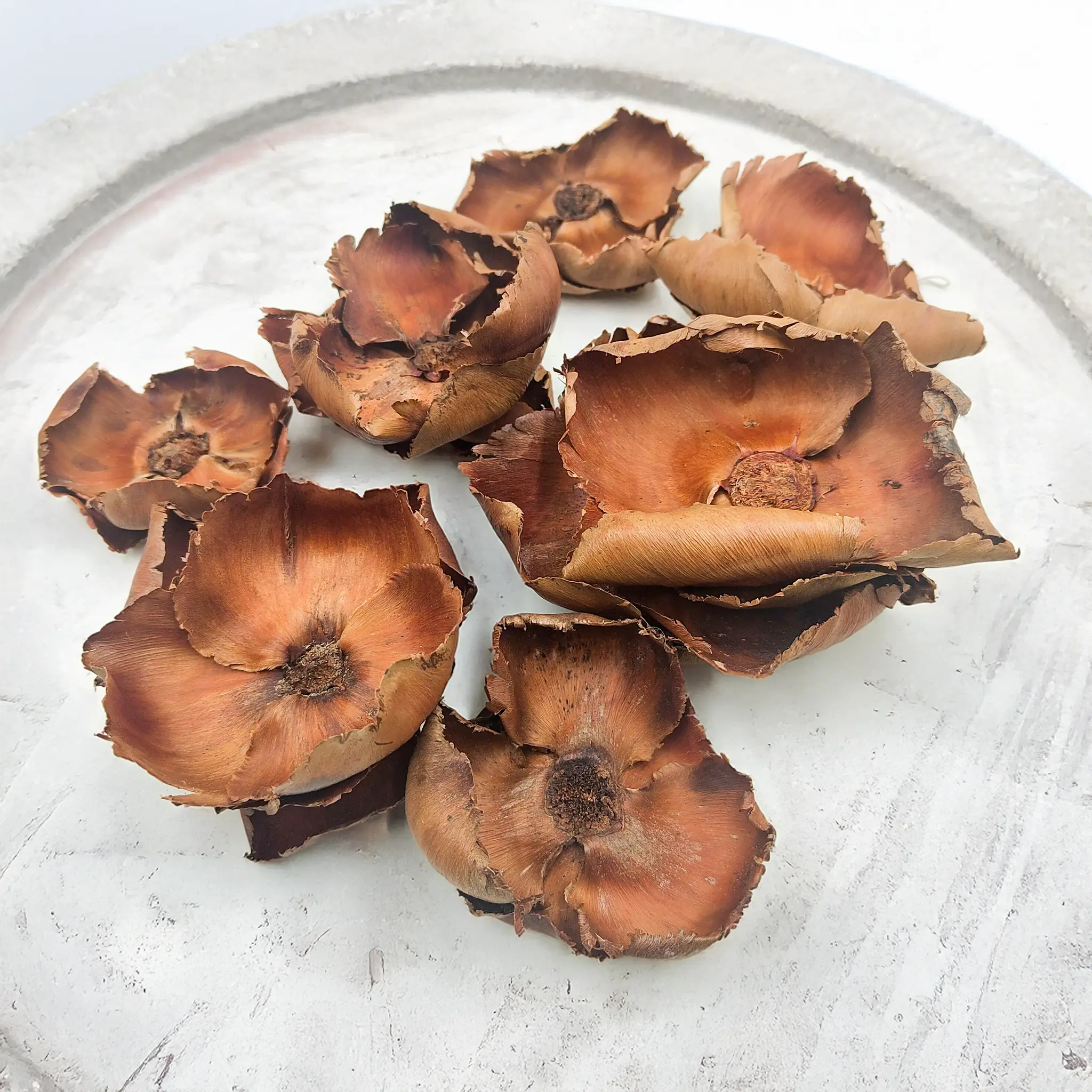 Palm Cup to naturalny, suszony owoc palmy o charakterystycznym, otwartym kształcie przypominającym czarkę lub kielich. Jego surowa struktura i ciepłe, beżowo-brązowe odcienie wnoszą do aranżacji organiczny, rustykalny akcent.