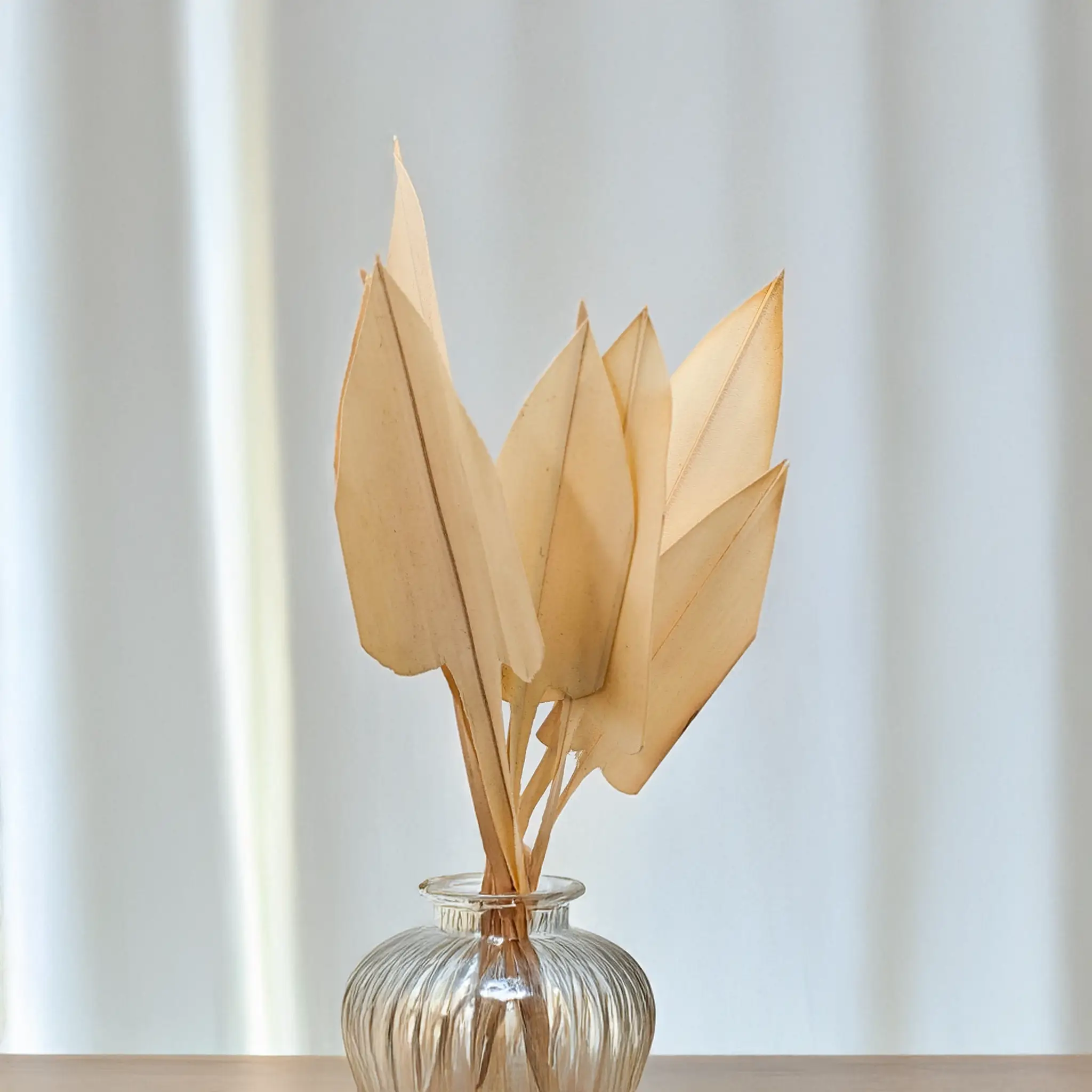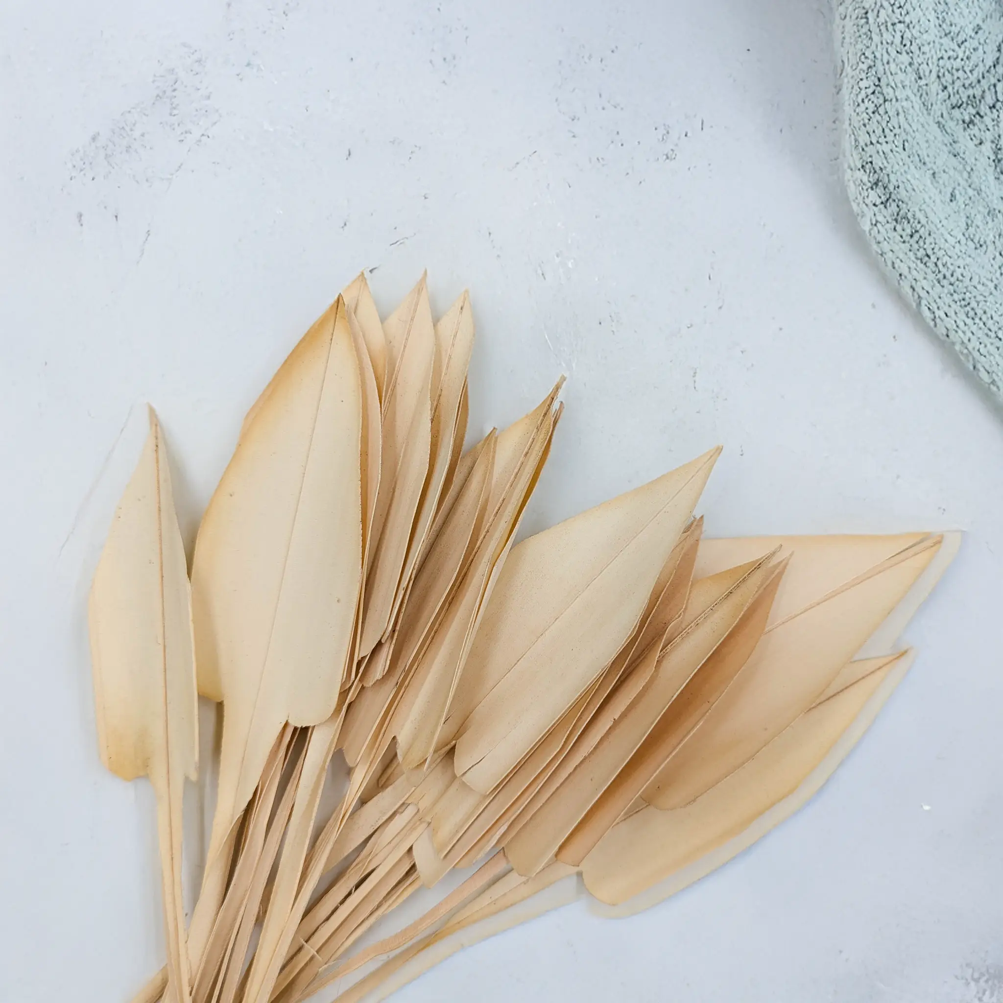 Bielona Palma Arrow Leaf to kompaktowy liść palmy o eleganckim, strzałkowatym kształcie i jasnym, kremowym odcieniu. Długość ok. 15 cm sprawia, że doskonale nadaje się do mniejszych kompozycji florystycznych, dekoracji ślubnych, bukietów i projektów DIY. Idealny wybór do stylizacji boho, rustykalnych oraz wnętrz japandi.