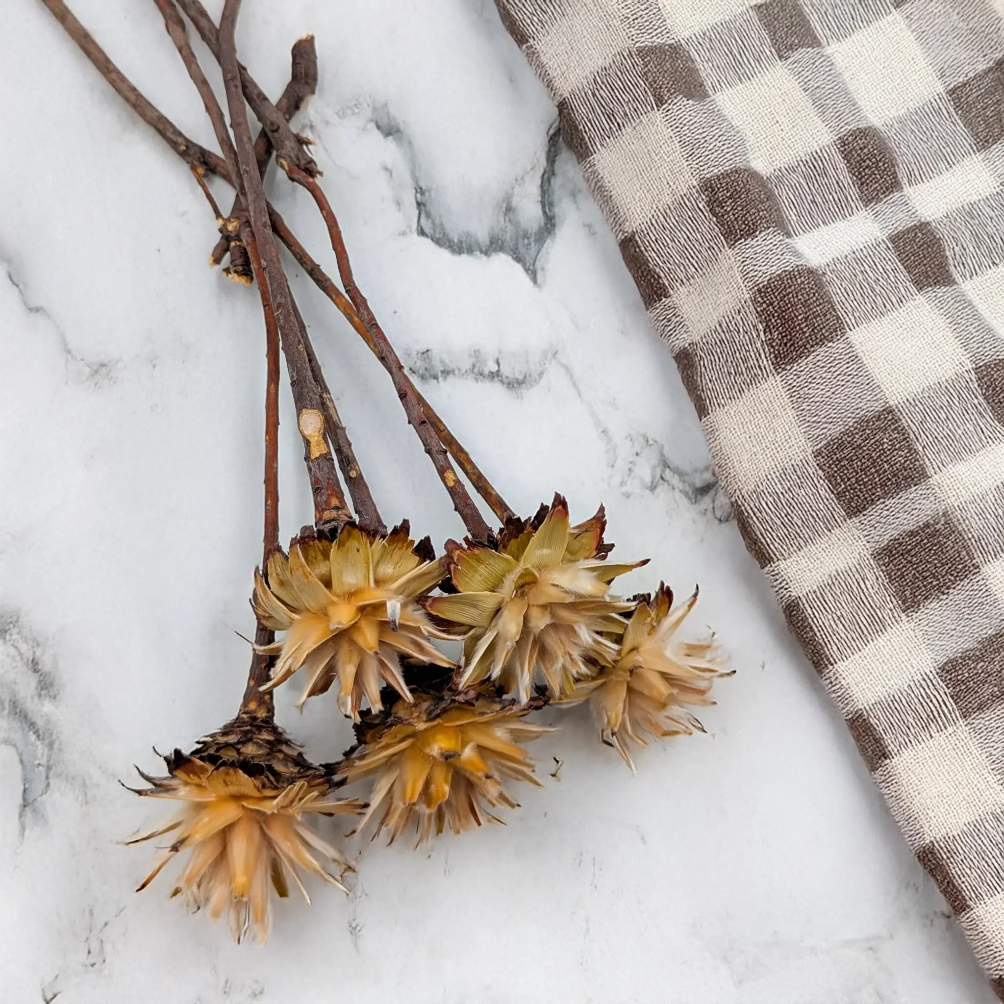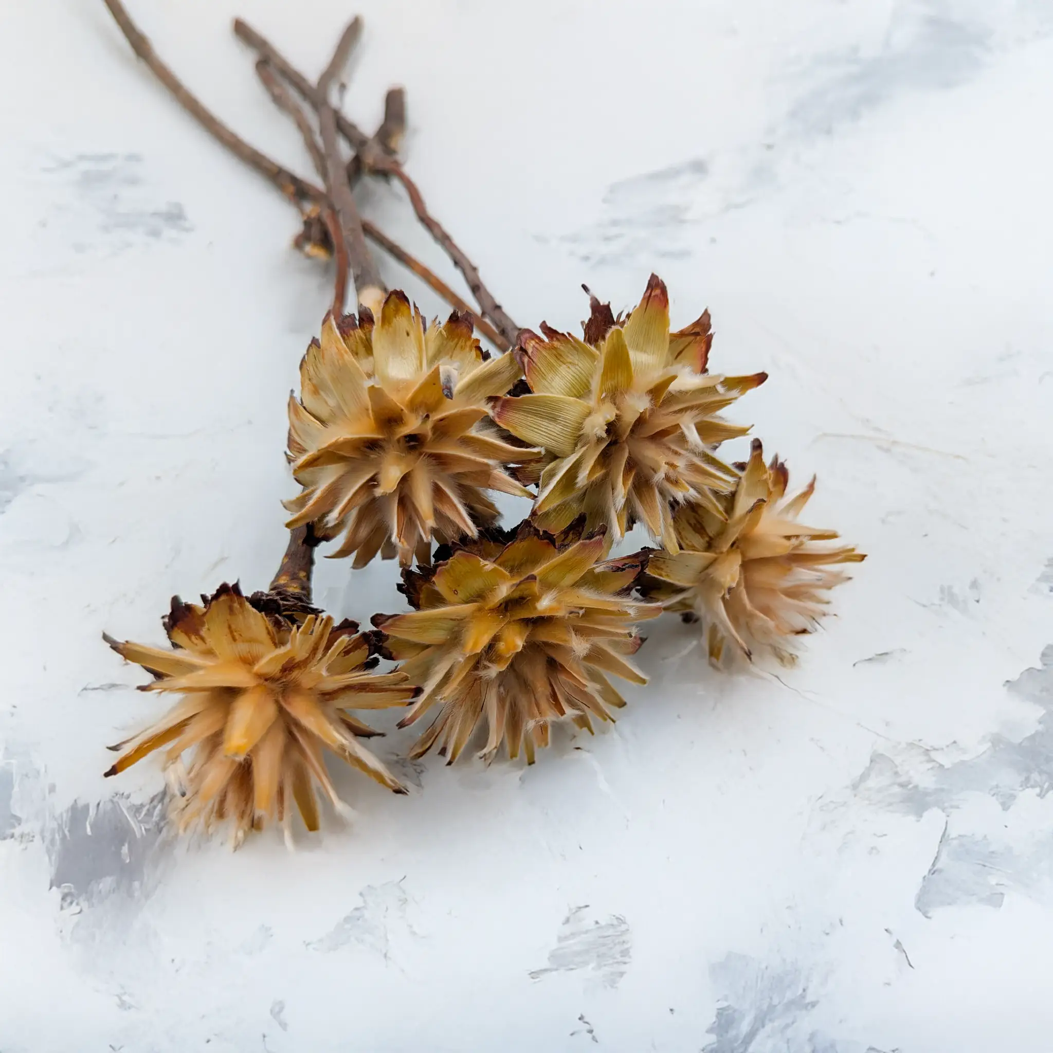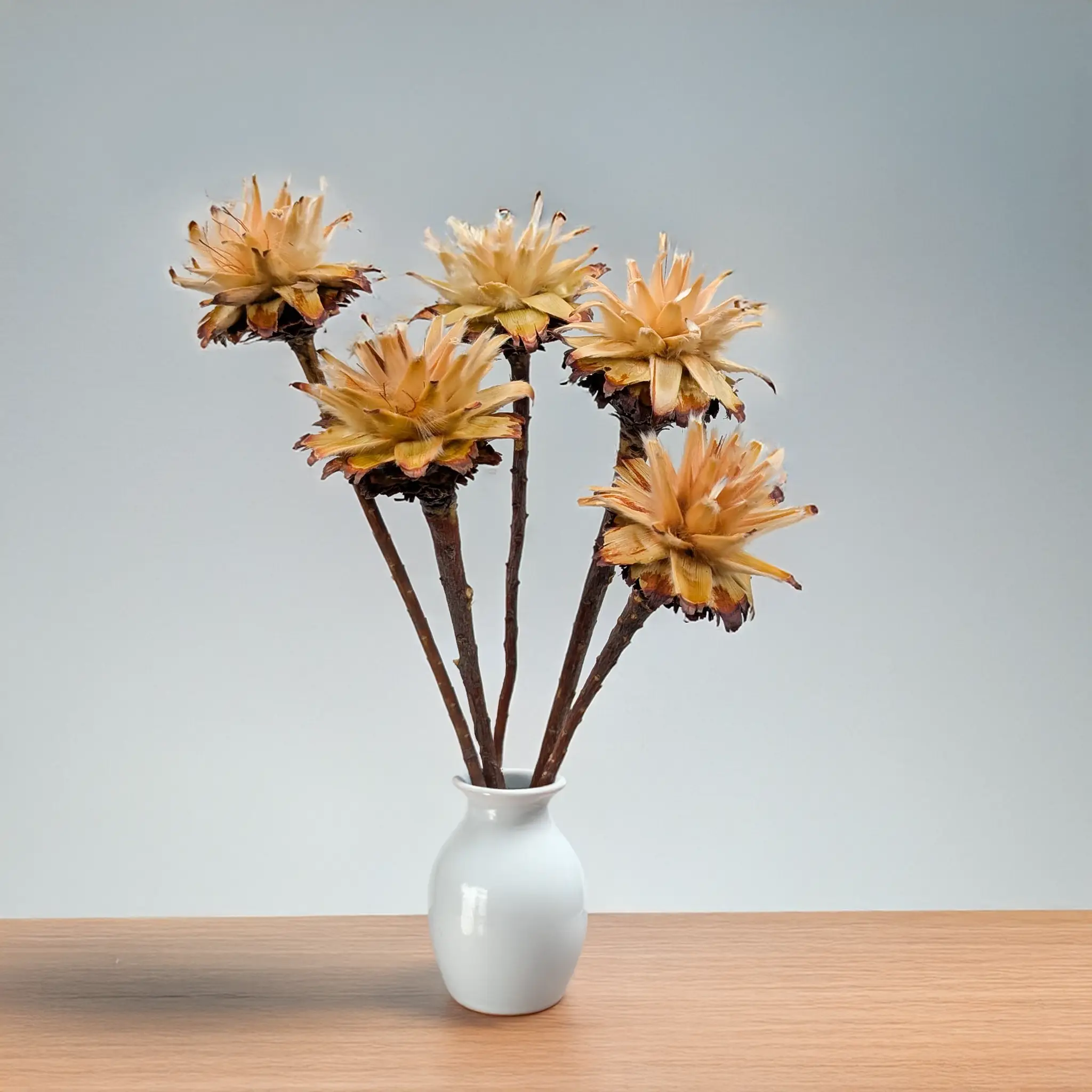 Suszone Plumosum (Leucospermum plumosum) to wyjątkowa roślina egzotyczna o dekoracyjnych, szyszkowatych kwiatostanach. Ich naturalny, kremowy odcień nadaje kompozycjom subtelności i elegancji, a unikalna faktura wprowadza do aranżacji egzotyczny charakter. Dzięki swojej trwałości i formie Plumosum doskonale sprawdza się jako wyrazisty element florystyczny.